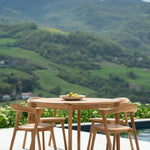 Made from solid teak with a choice of natural or black-tainted finishes, the chair highlights the wood’s rich grain and natural resilience, offering warmth and texture without compromising durability. The open, gently curved backrest combined with a generous seat depth invites relaxed seating and intimate conversation, making it an ideal complement to your outdoor dining setup.