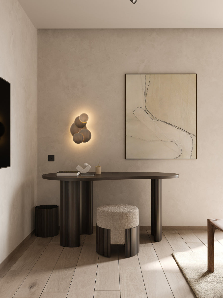 Showcasing the natural beauty and warmth of its finish, the desk pairs tactile richness with practical design. A generous surface provides ample room for laptops, notebooks, and daily essentials, while smoothly rounded edges and integrated drawers keep organization seamless and unobtrusive. Blending expressive form with everyday utility, it supports focus and creativity with quiet confidence.