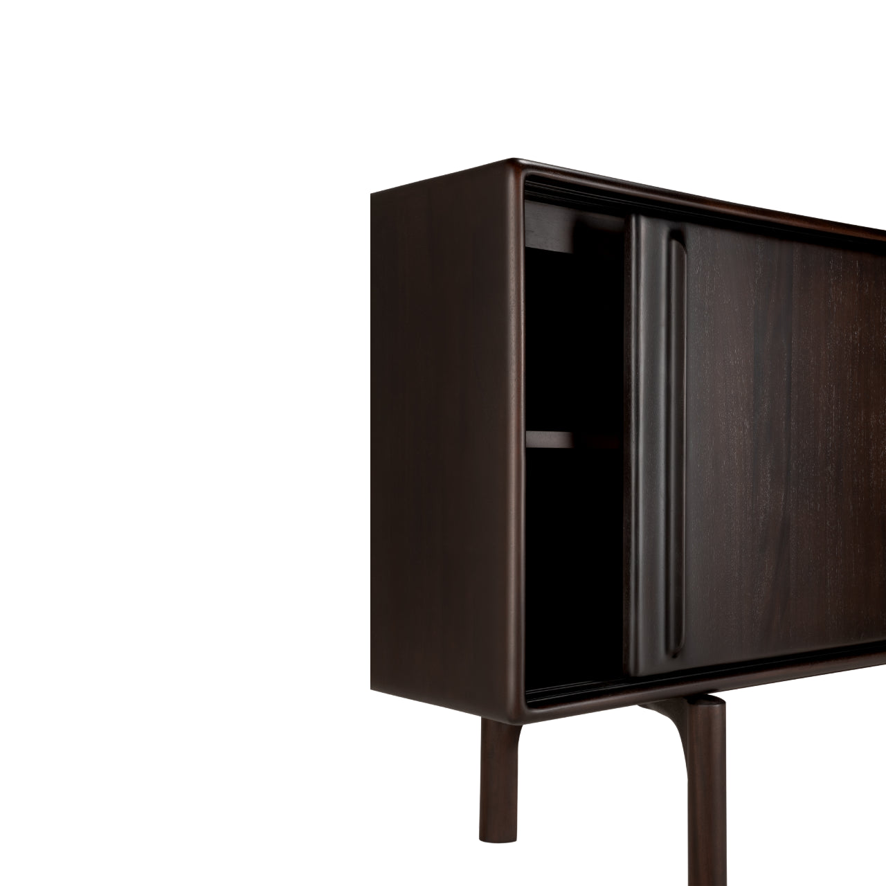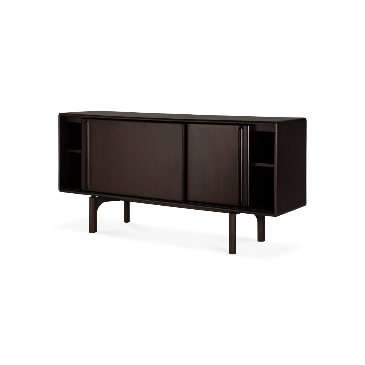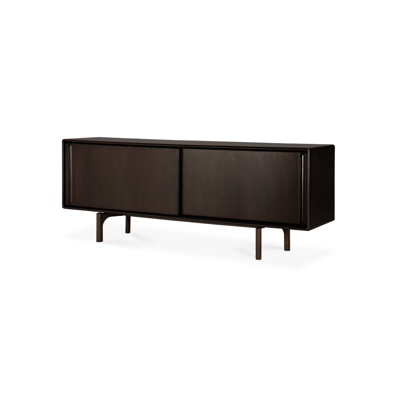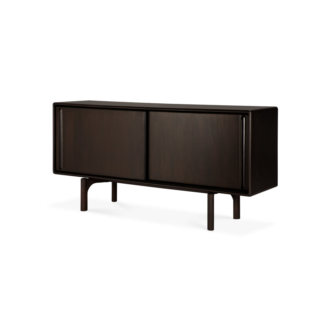 Crafted from solid mahogany with a rich varnish finish that highlights the natural grain, the Flow Sideboard stands elevated on distinctive legs that lend it lightness and poise while anchoring its generous form. Behind two smooth sliding doors, the Flow Sideboard by Ethnicraft features an adjustable internal shelf and concealed storage that support organization without disturbing its elegant presence.