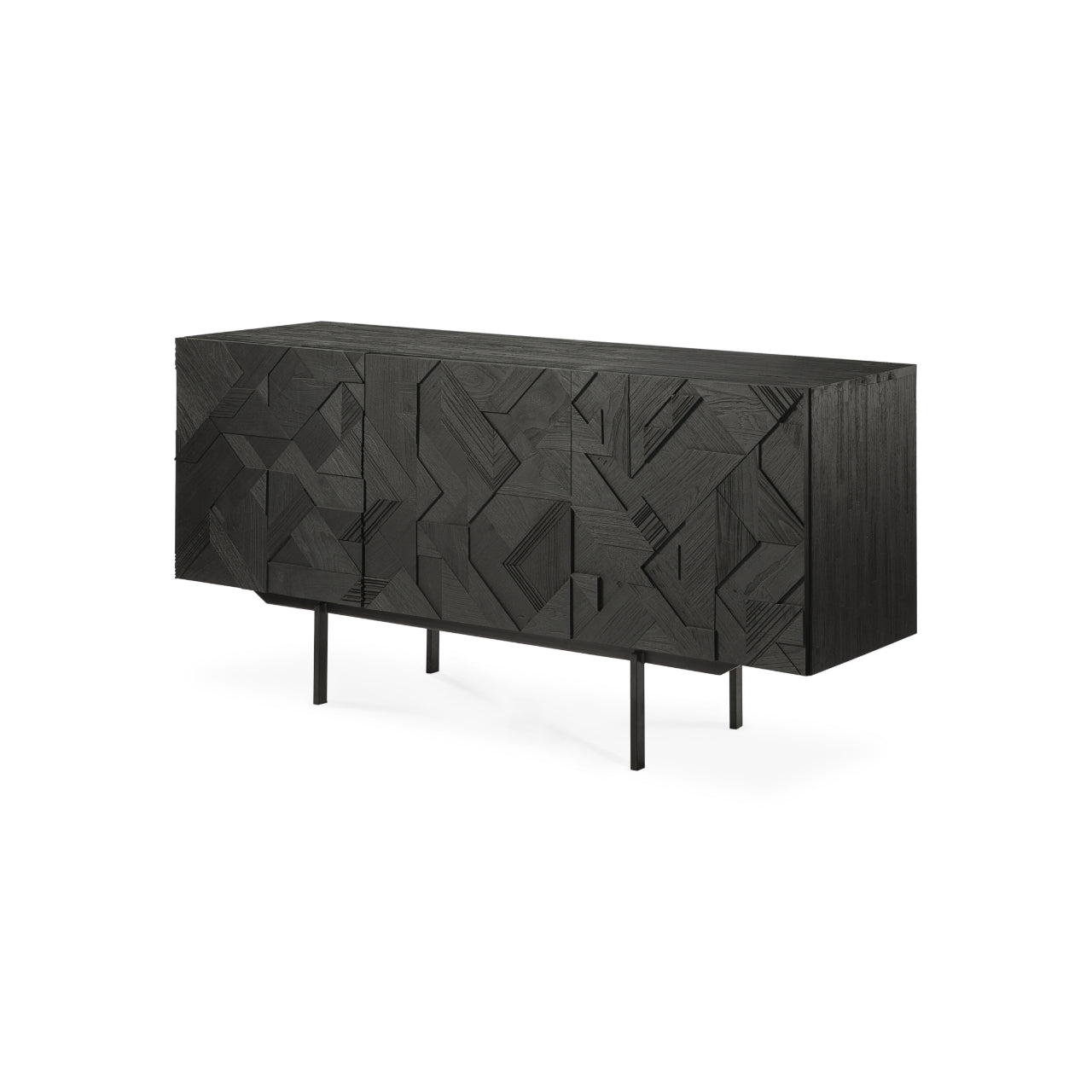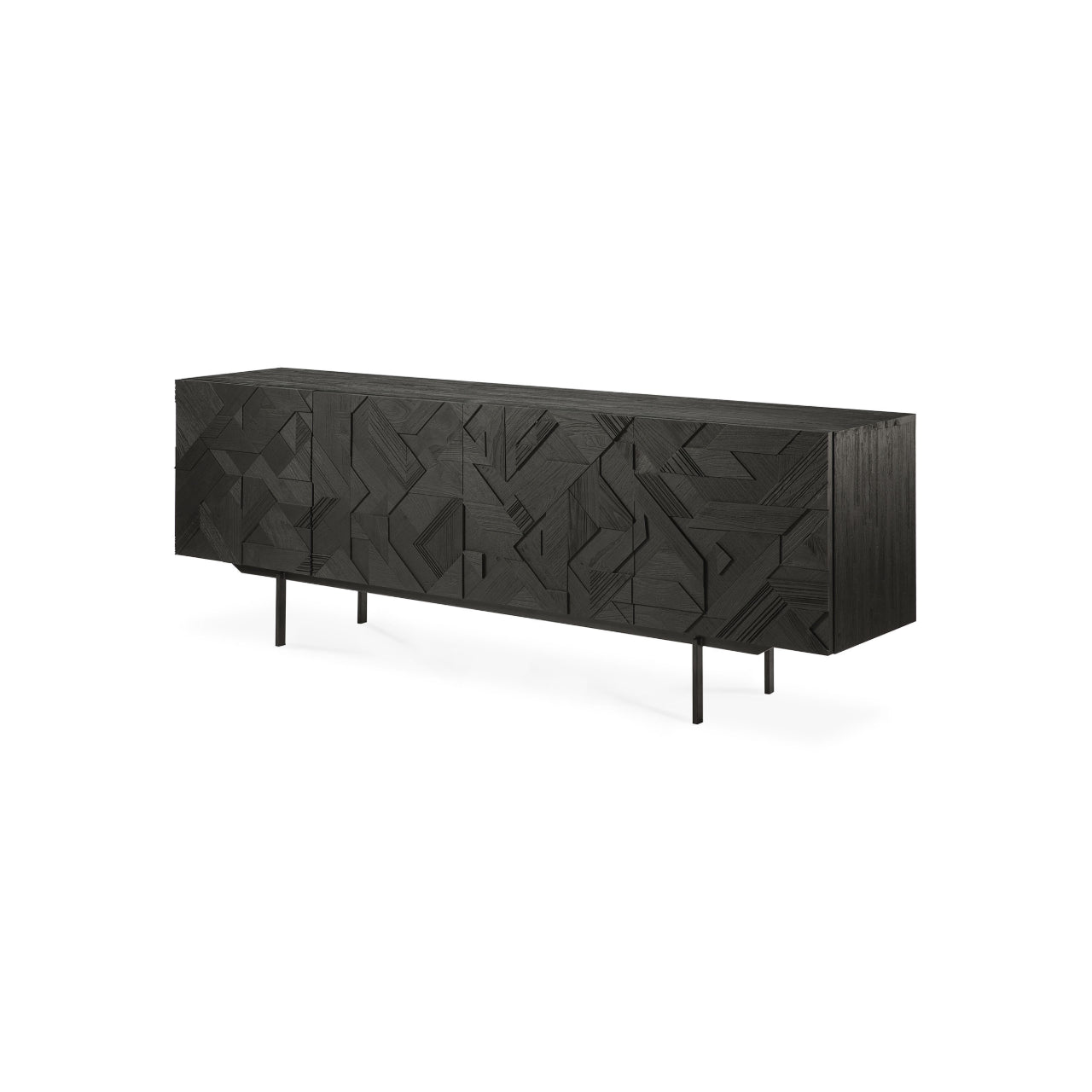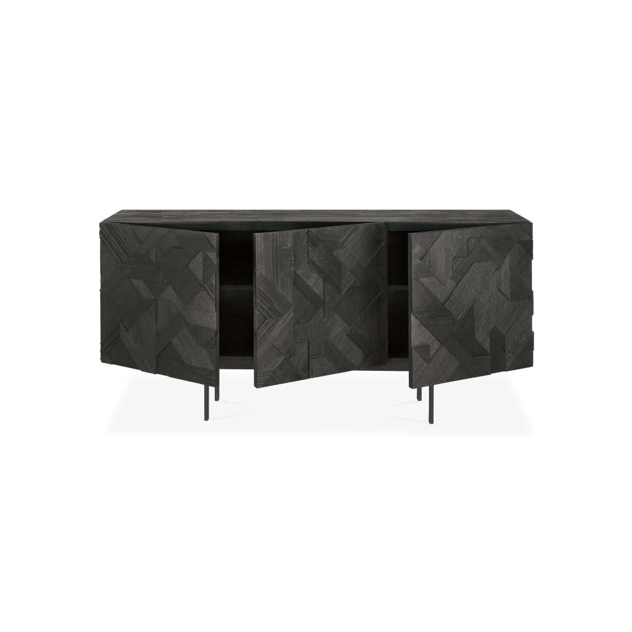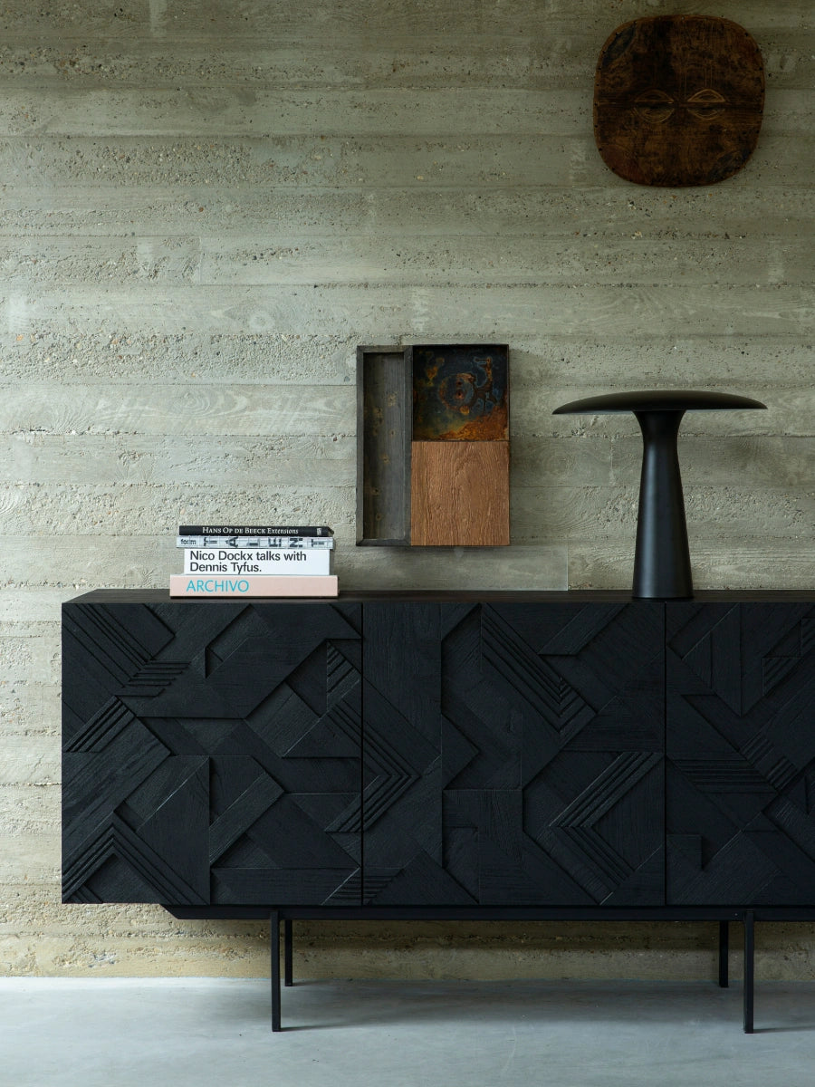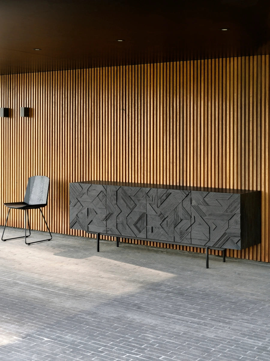 The Graphic Sideboard by Ethnicraft transforms storage into a bold design statement, elevating it beyond pure functionality with a dynamic, textured front that enlivens modern interiors. Created by Alain Van Havre, this piece features a layered arrangement of triangular forms across its doors, generating depth and subtle motion that gives the room a thoughtfully styled atmosphere rather than a standard look.