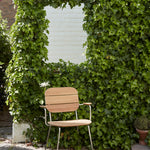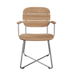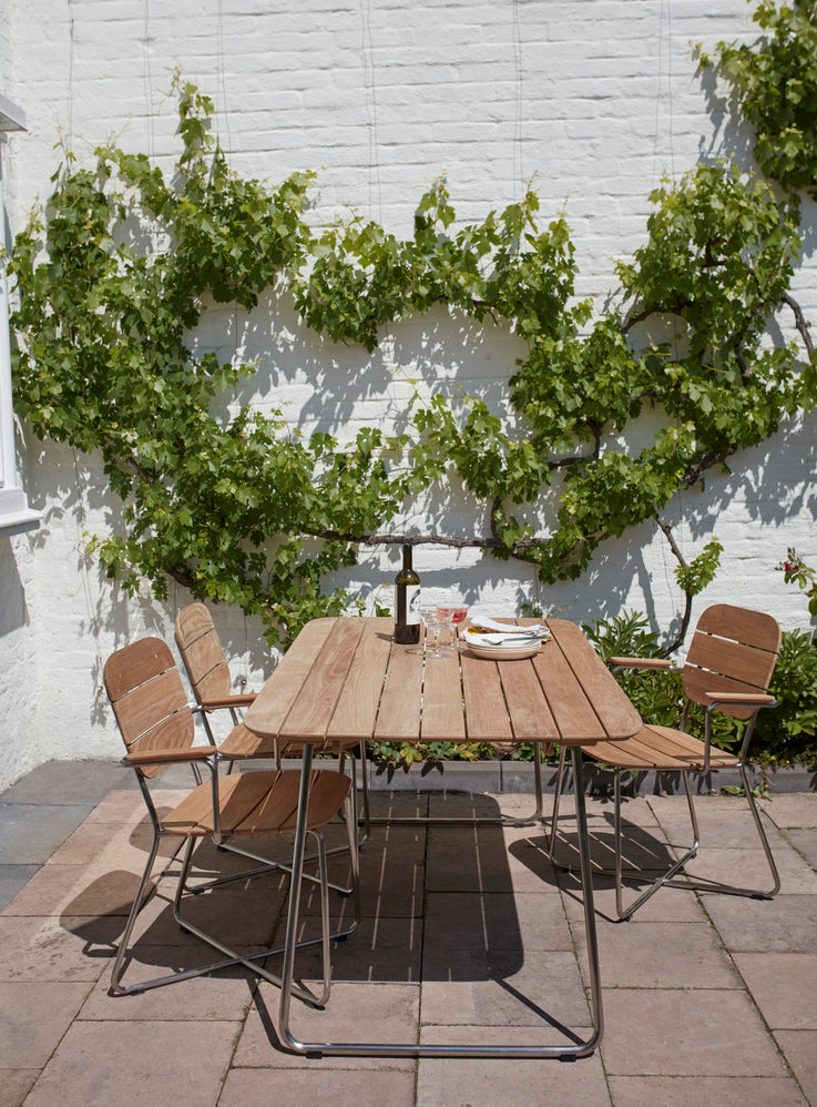 El sillón Lilium cuenta con la característica estructura de acero en forma de X de la serie, que le proporciona estabilidad. Además, los espacios entre los listones de teca del asiento y el respaldo permiten que el agua de lluvia se drene fácilmente. El asiento y el respaldo están hechos de teca 100 % con certificación FSC y montados frontalmente, lo que crea un respaldo elegante sin tornillos visibles. Un elegante reposabrazos ofrece mayor comodidad al sentarse, y las proporciones del sillón facilitan su colocación debajo de la mesa.