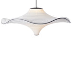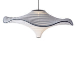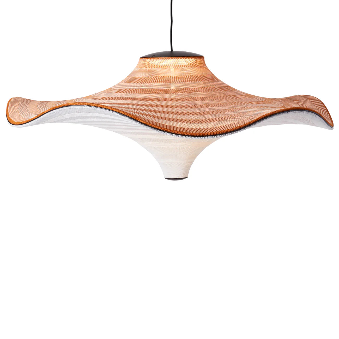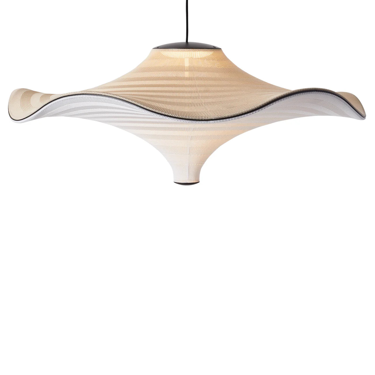 When suspended, they appear to float beautifully in the air. The distinctive shape of the Flying lamps is created by stretching the 3D knit material between the aluminium wavy frame and centerpiece that keeps the top and bottom apart.