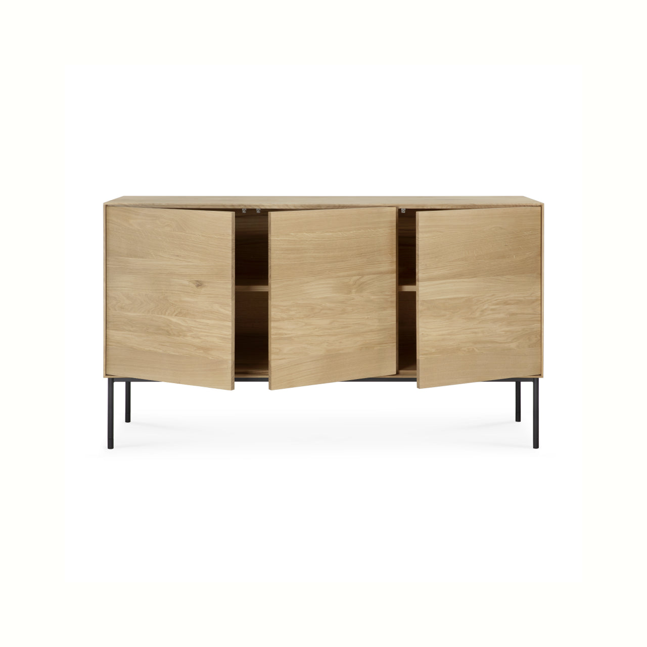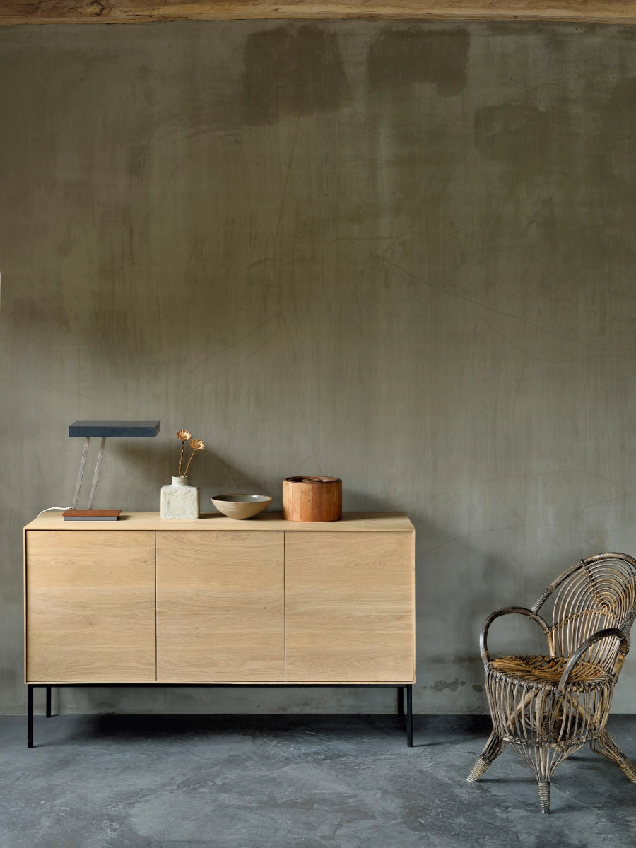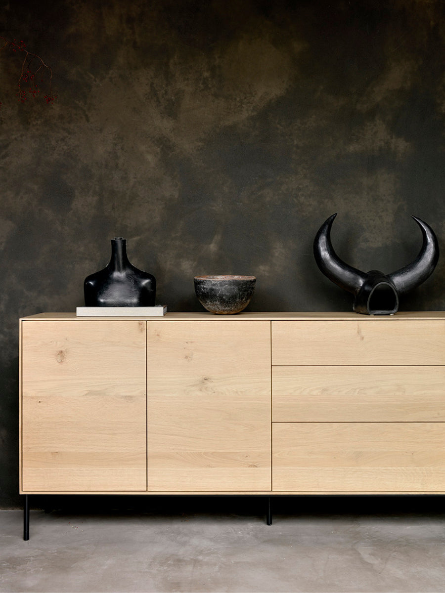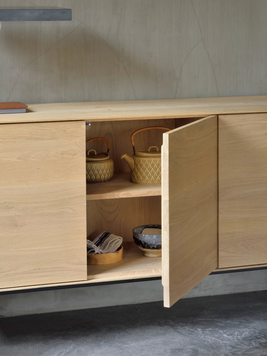 Crafted from solid oak with a protective varnish and supported by slender black metal legs, the Whitebird Sideboard by Ethnicraft blends natural warmth with architectural clarity. Push-to-open doors eliminate visible hardware, reinforcing a clean, uninterrupted surface, while balanced proportions and harmonious geometry suit both modern and classic interiors.