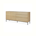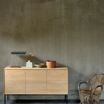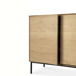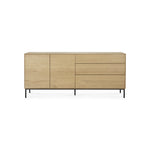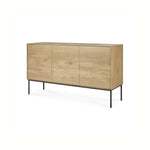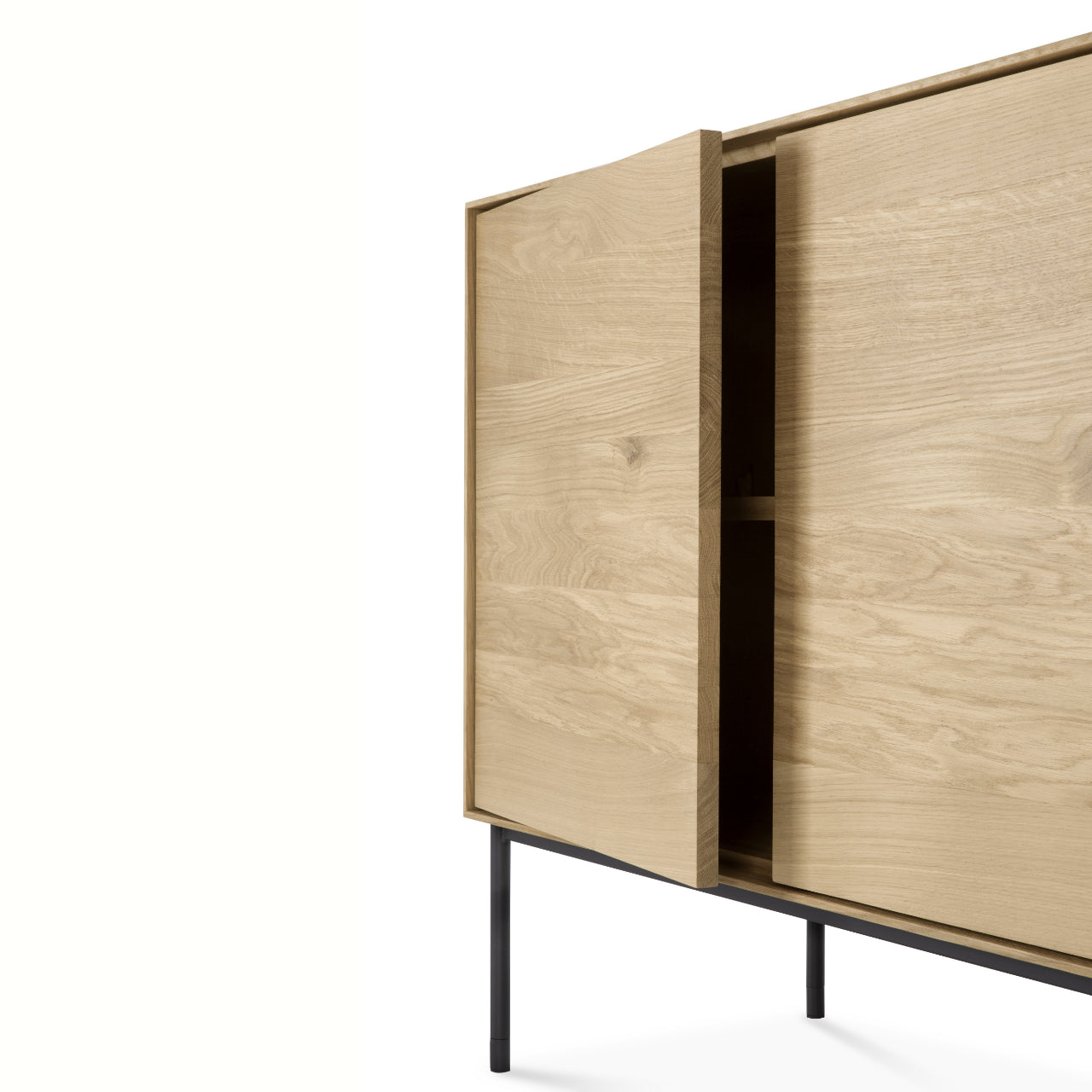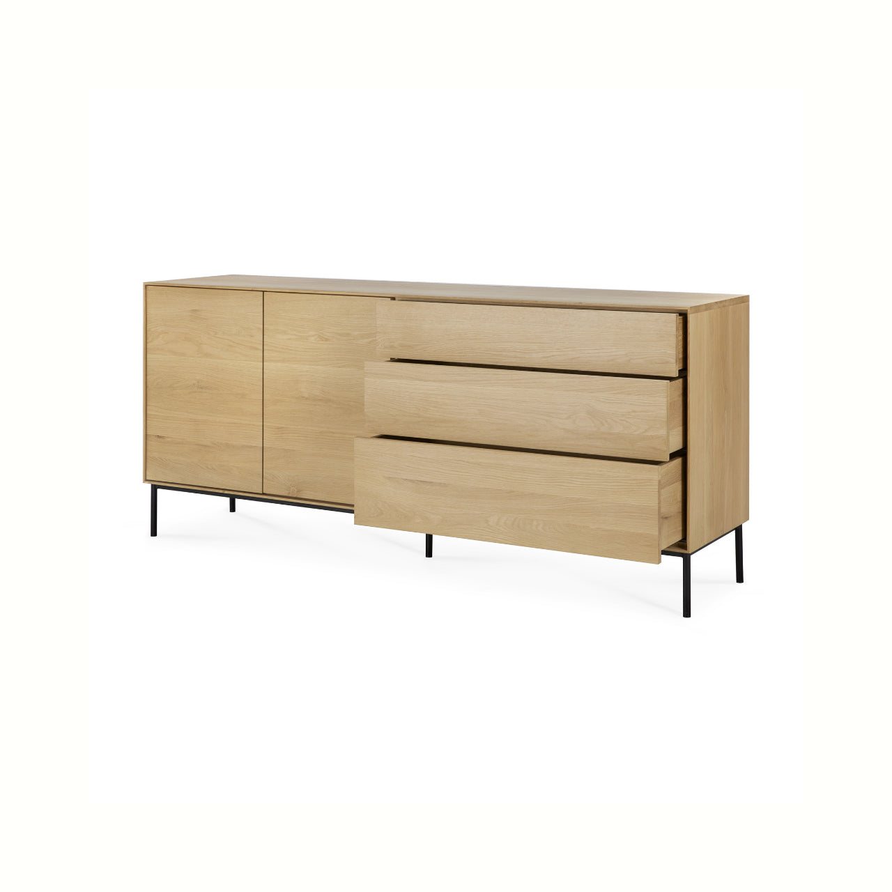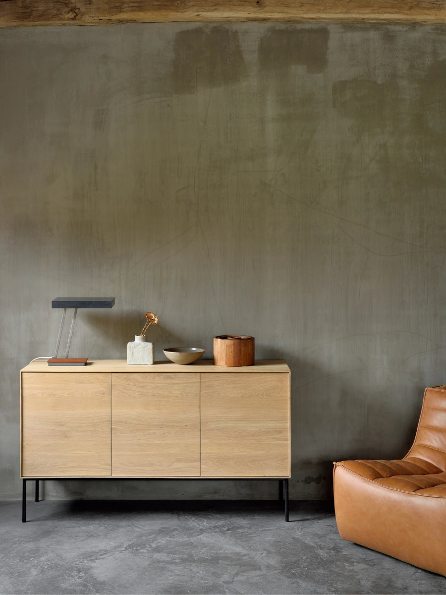 Crafted from solid oak with a protective varnish and supported by slender black metal legs, the Whitebird Sideboard by Ethnicraft blends natural warmth with architectural clarity. Push-to-open doors eliminate visible hardware, reinforcing a clean, uninterrupted surface, while balanced proportions and harmonious geometry suit both modern and classic interiors.