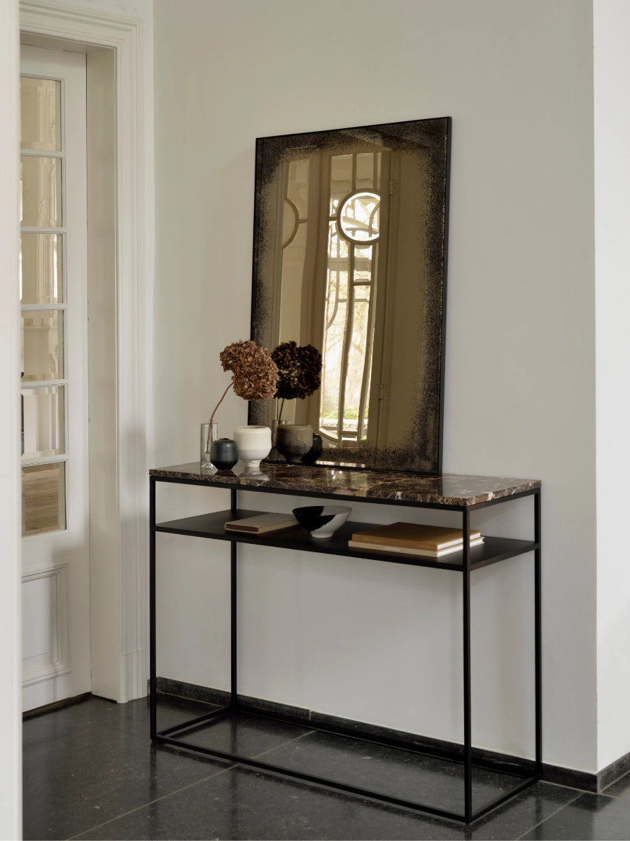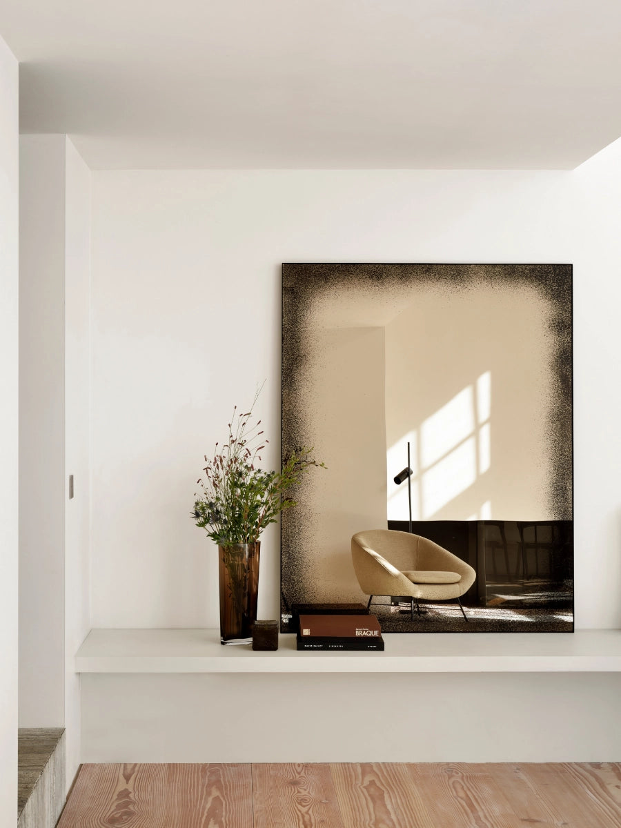 The Aged Wall Mirror by Ethnicraft brings timeless character and sculptural presence to walls with design rooted in Scandinavian design principles that value simplicity, balance, and functional beauty. Its aged mirror surface—available in clear or bronze finishes—creates depth and subtle patina, making the mirror both a practical reflective surface and a compelling décor element.