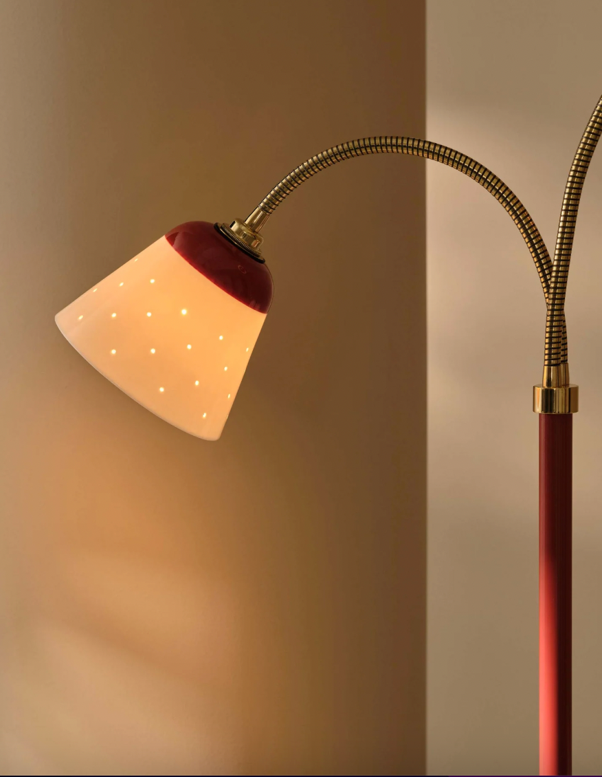 Created as a practical, go-anywhere ceramic piece, the Alma Lamp was inspired by Heuman’s visit to Original BTC’s Stoke-on-Trent factory, where she was drawn to bone china’s almost ethereal quality. This inspiration led to one of the brand’s most intricate designs: a hand-crafted shade featuring 41 individually pierced holes. When illuminated, the lamp emits a soft, starry glow—what Heuman describes as “little glowing stars at night.”