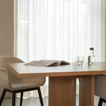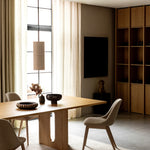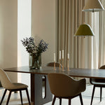 Like a magnificent monument, the new Androgyne Dining Table pairs oak and stone to striking effect. The bold and confident take on a dining table amplifies the silhouette of the collection's popular side table to grander proportions thanks to an elegant oak base - available in natural or dark stained - and a table top in corresponding wood or kunis breccia, an artistic blend of stones in warm tones that create subtle texture and add a new dimension to the design.