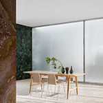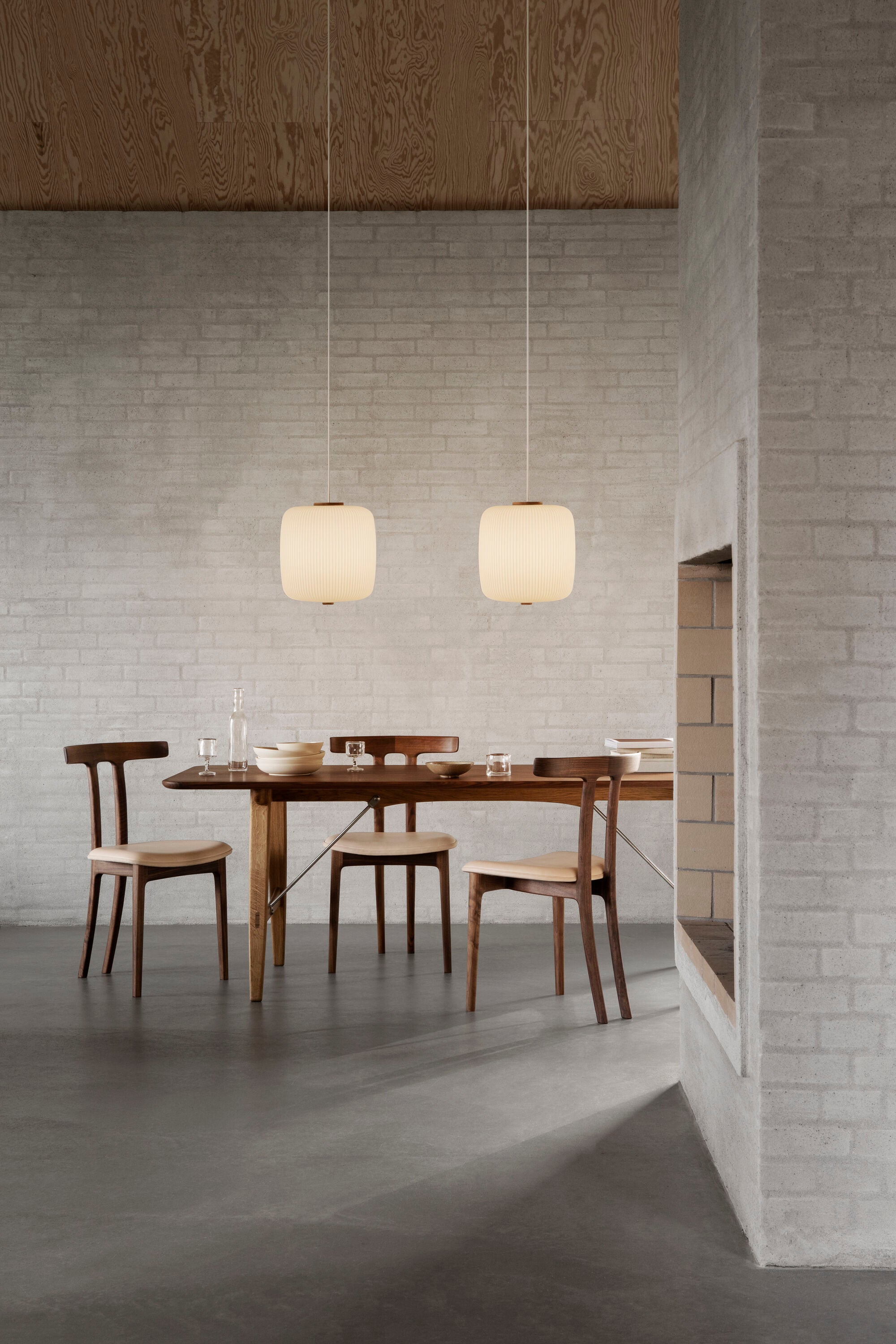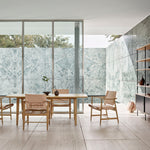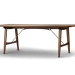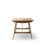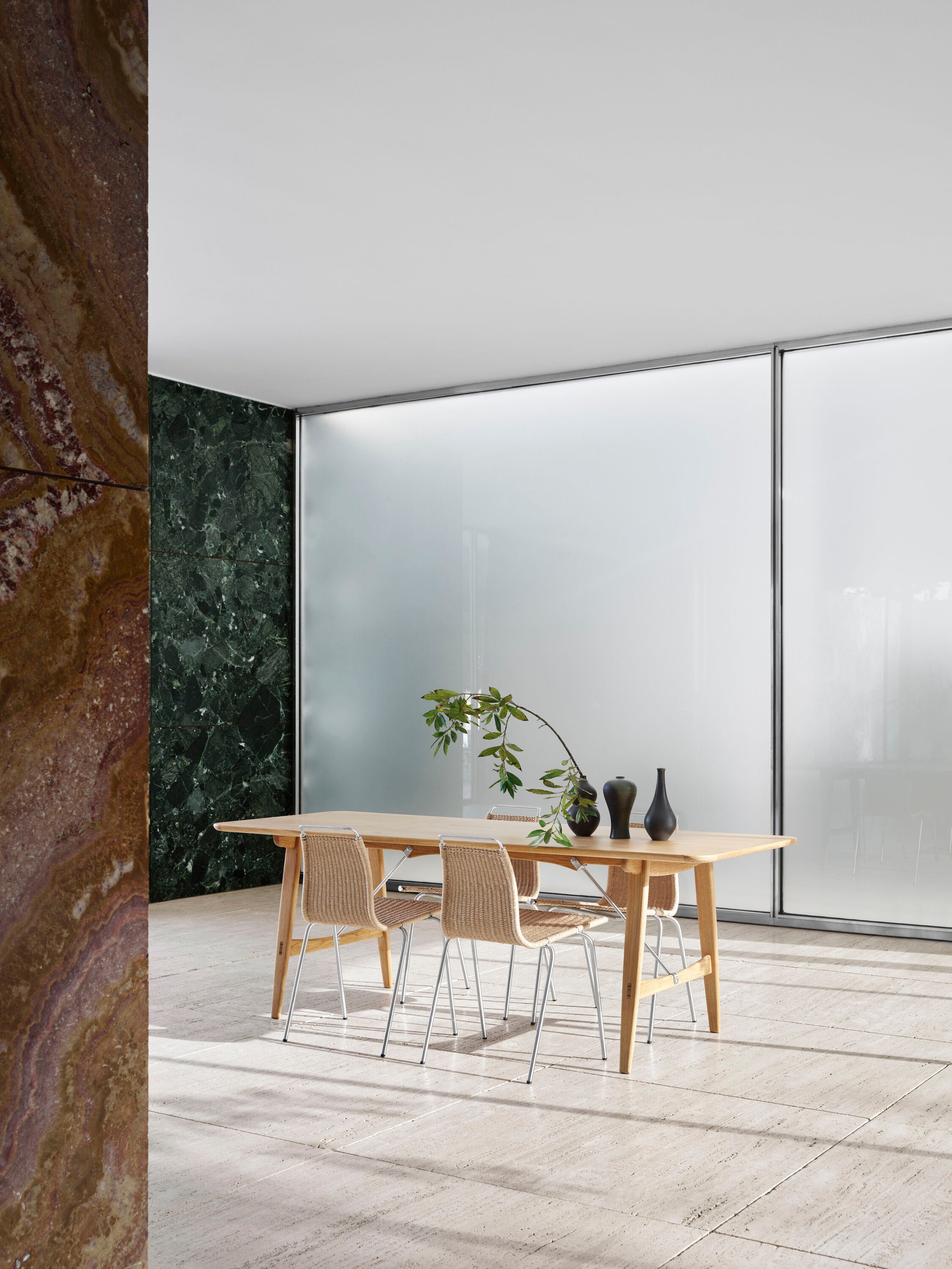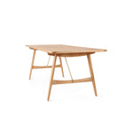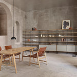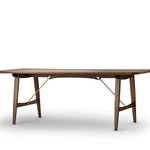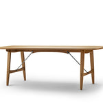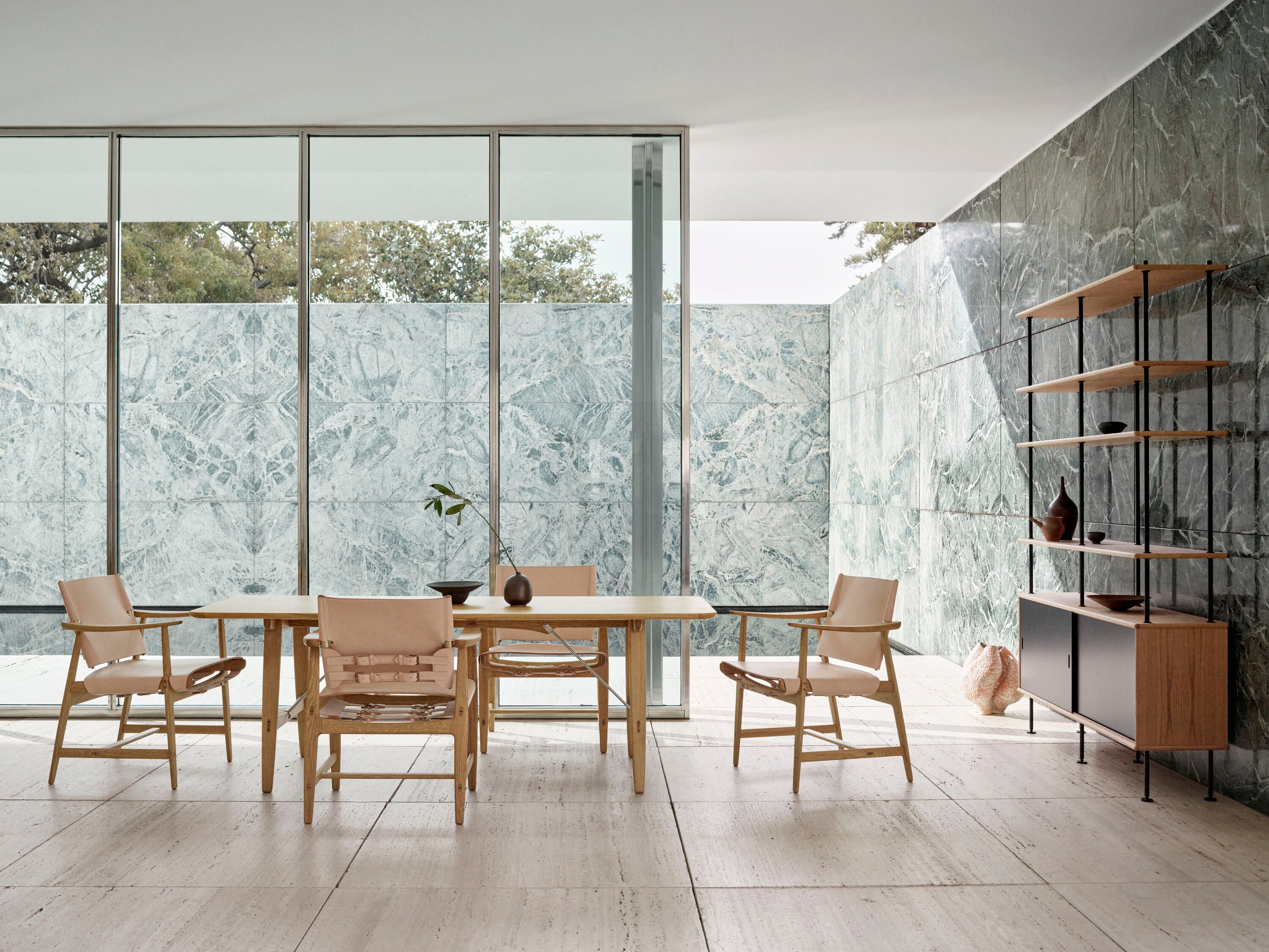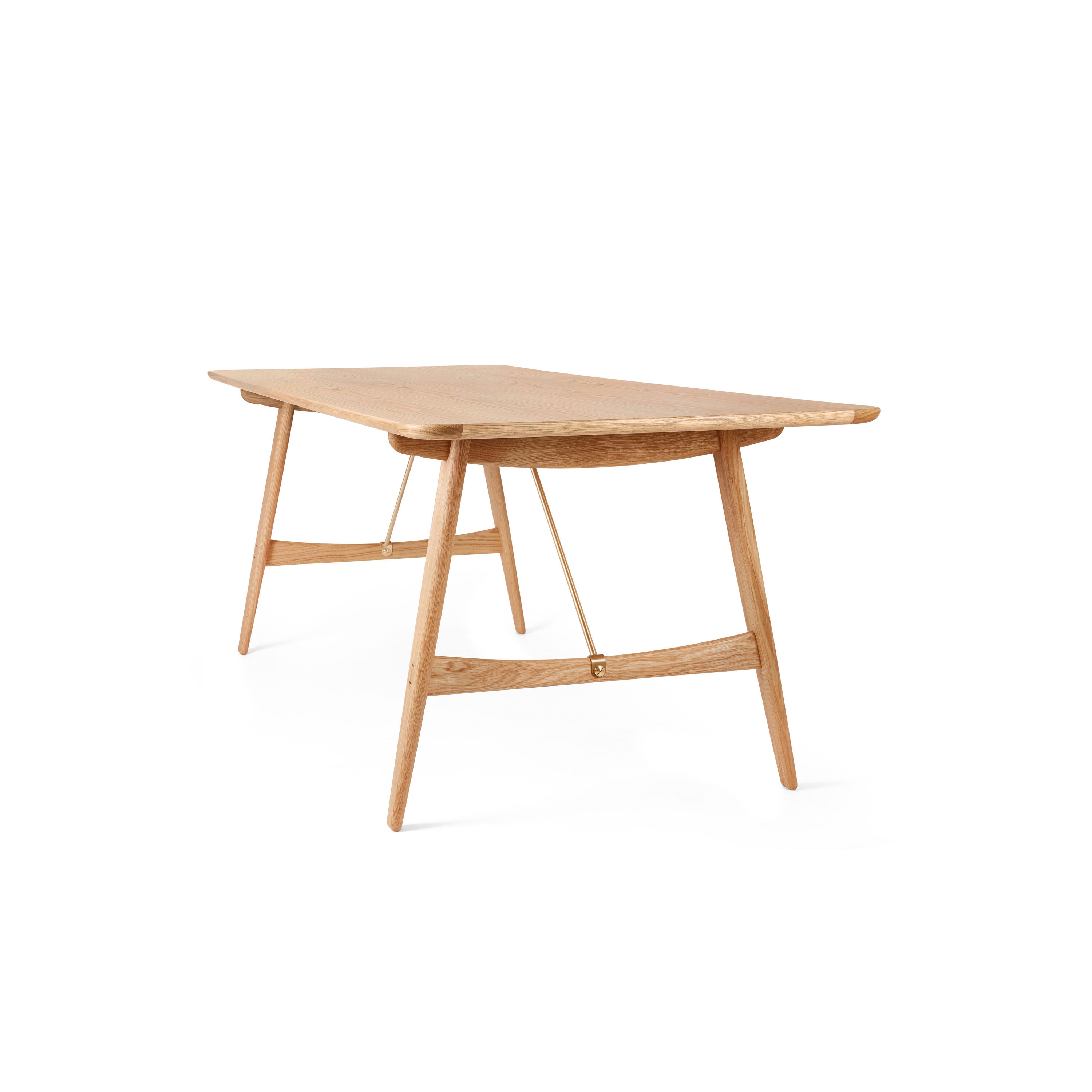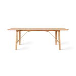 Mogensen’s Hunting Table is slightly narrow across the top, which makes it suitable for smaller spaces, while allowing for more intimate social gatherings. Furthermore, the table is constructed for frequent use with rounded corners and edges in solid wood, which reveals Mogensen’s passion for democratic and accessible design. This stability is ensured through the use of two diagonal brace metal bars connecting the tabletop and frame with an aesthetically pleasing effect. Further detailing, such as the mortise and tenon joints on the legs manufactured in contrasting wood, accentuate the table’s handcrafted expression.