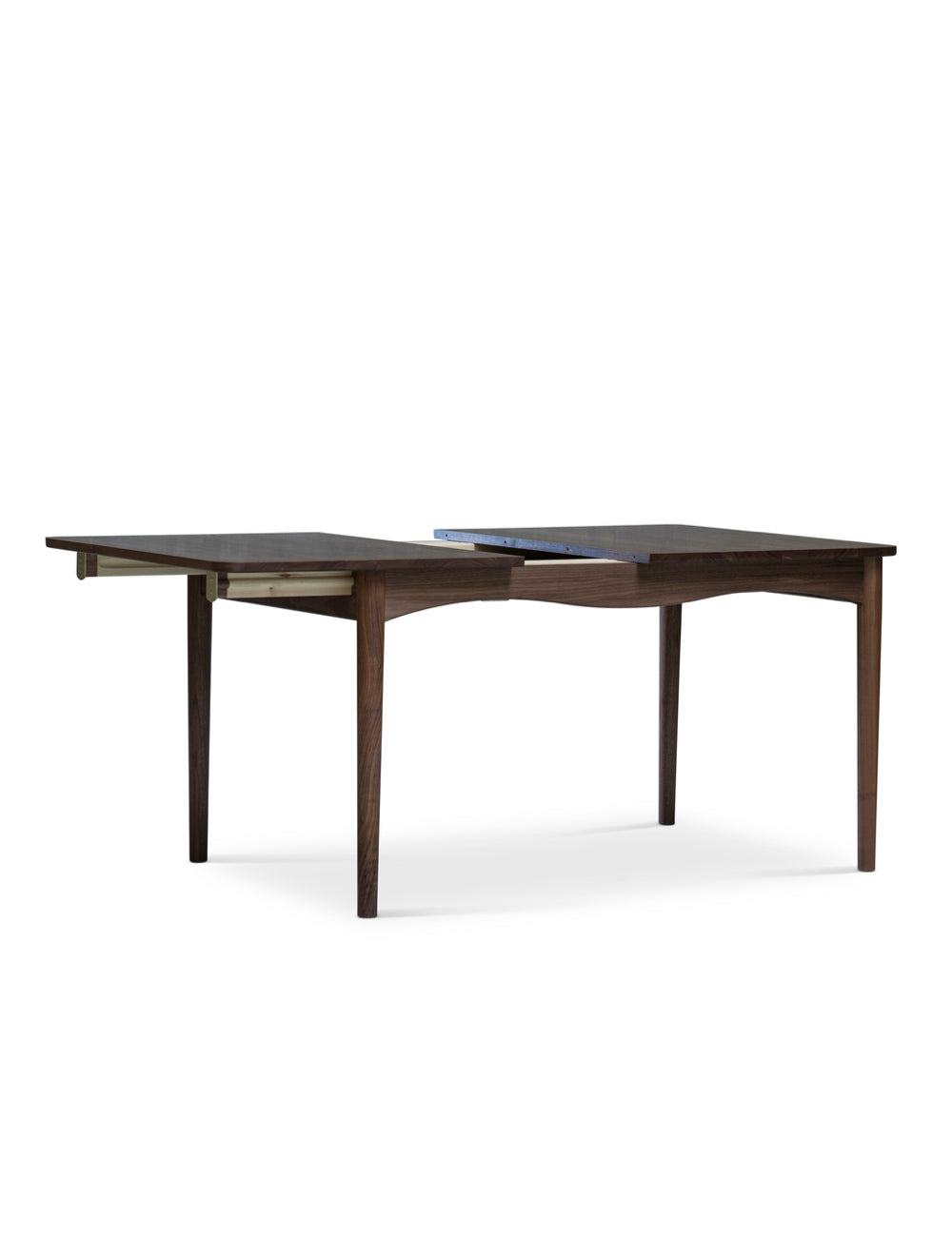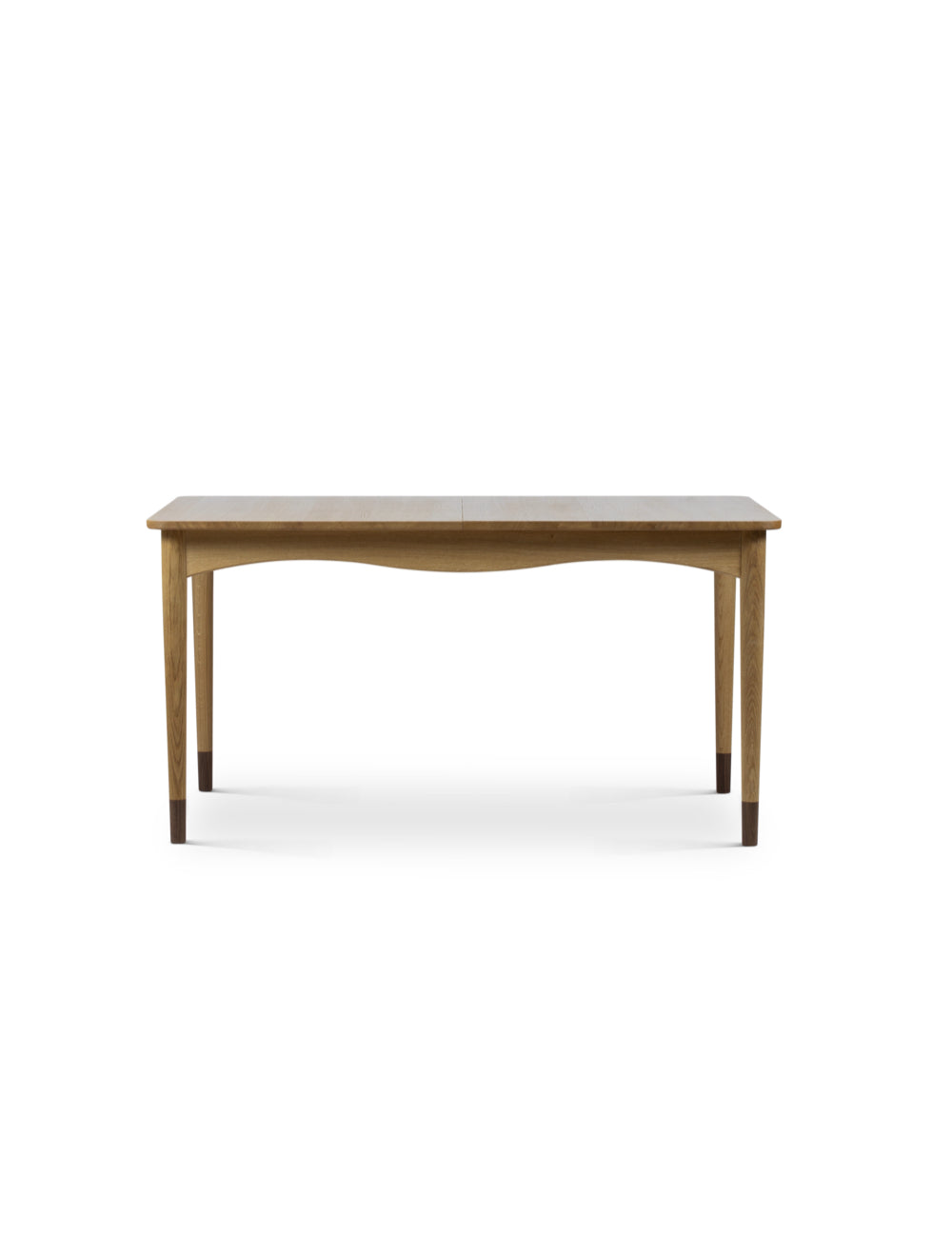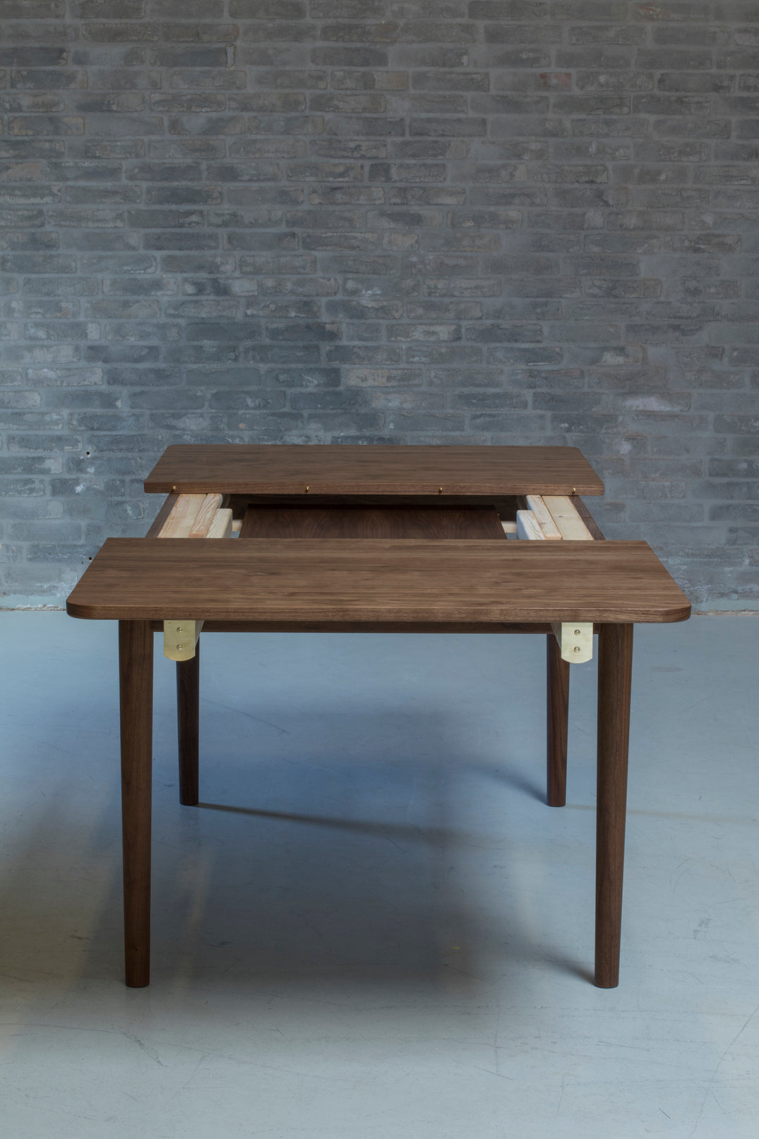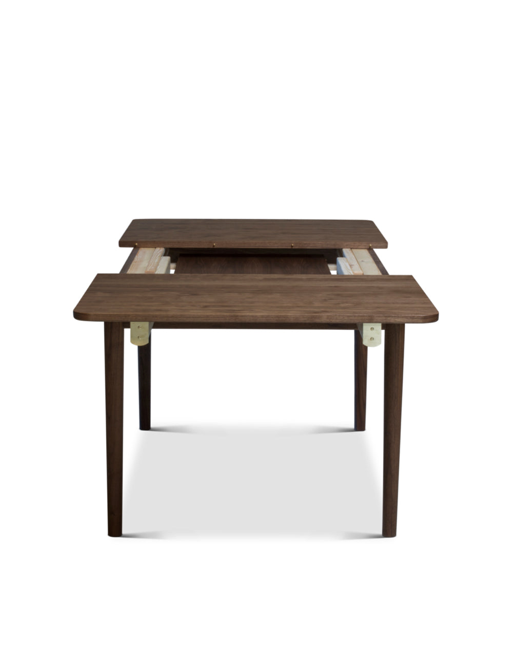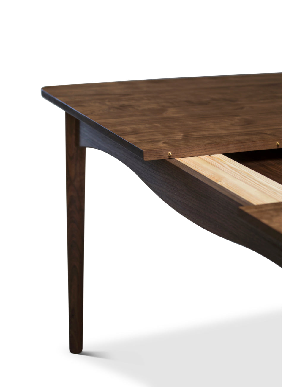 The table is crafted in either oak or walnut, or in a combination with an oak frame and walnut for the top and toes. Two extension leaves can be ordered for the extendable version. The table is also available in a non-extendable version.