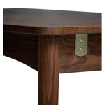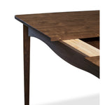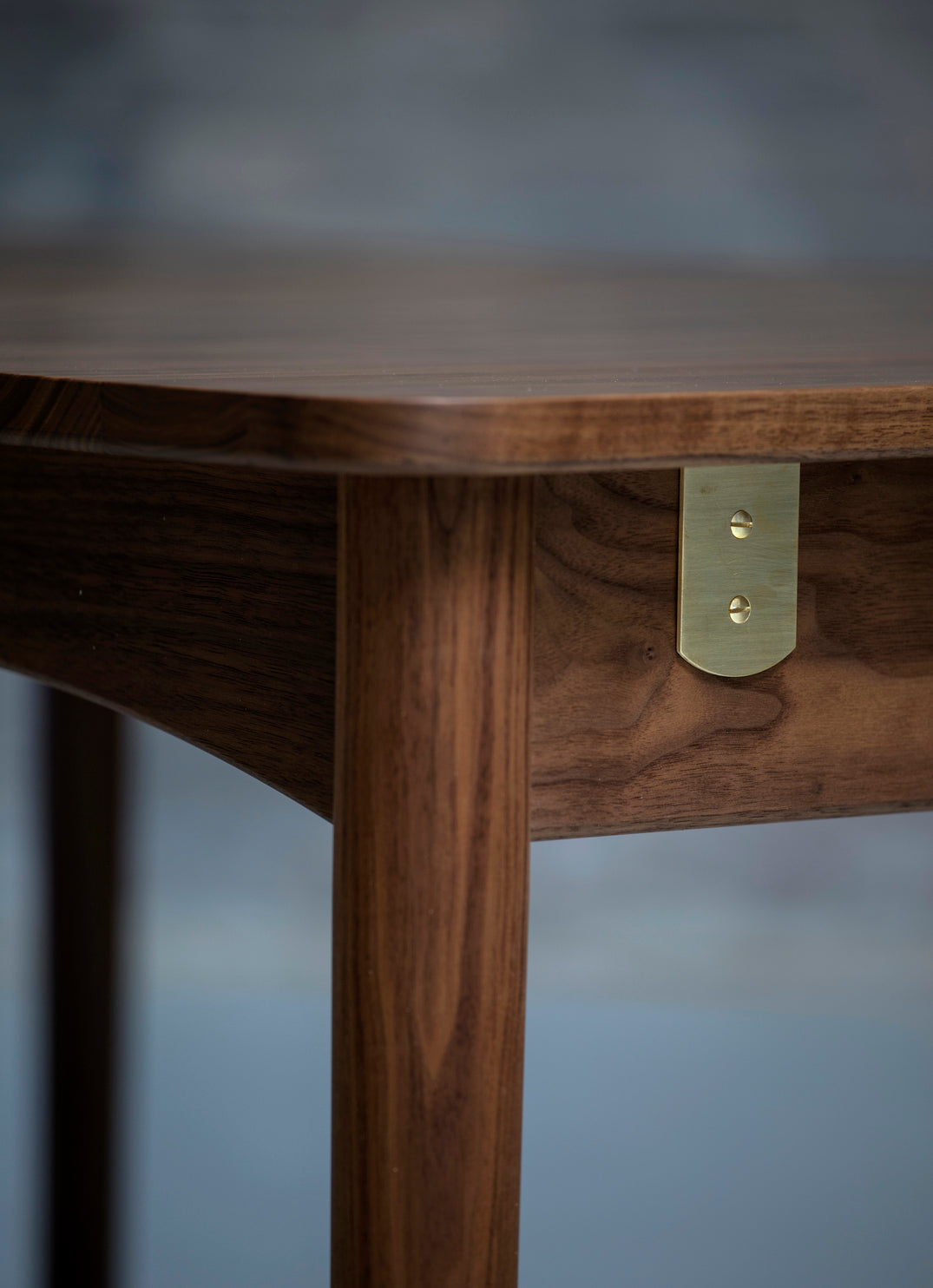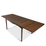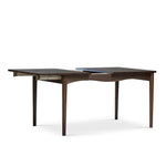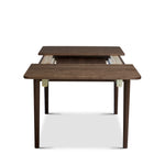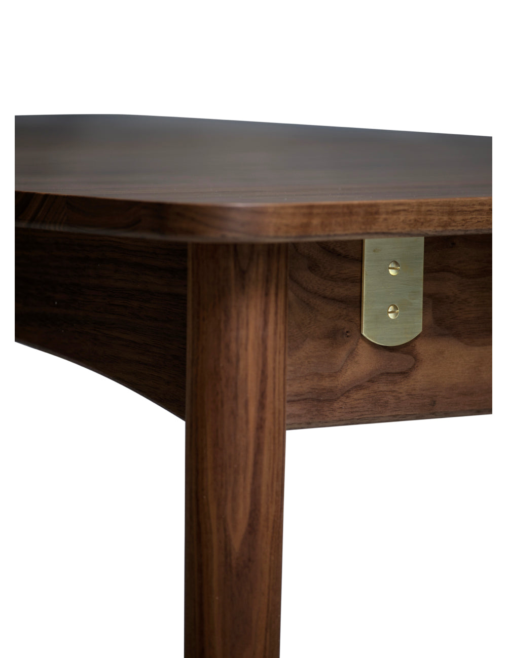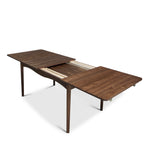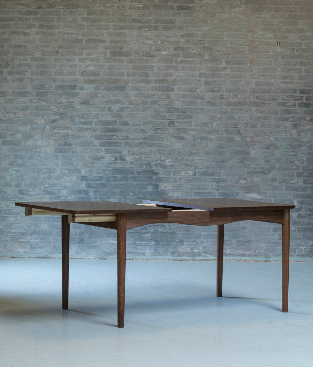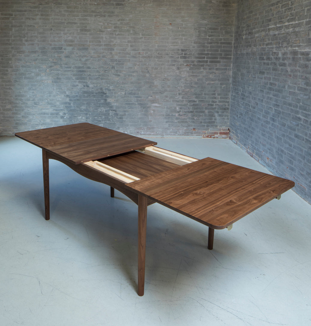 The table is crafted in either oak or walnut, or in a combination with an oak frame and walnut for the top and toes. Two extension leaves can be ordered for the extendable version. The table is also available in a non-extendable version.