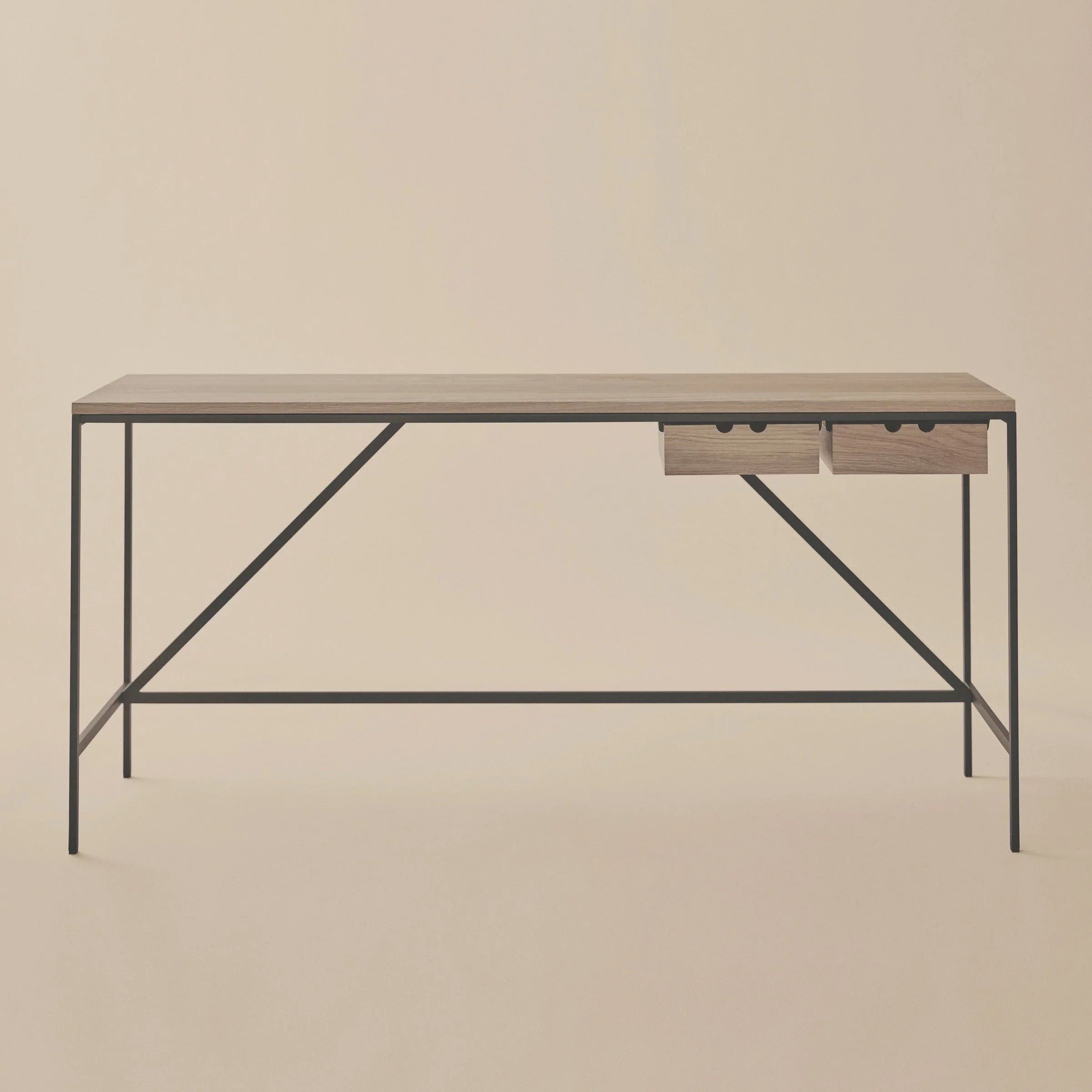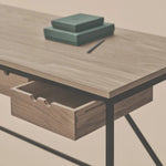 Table top in oak veneer with clear lacquer, optional drawers in solid oak with clear lacquer.