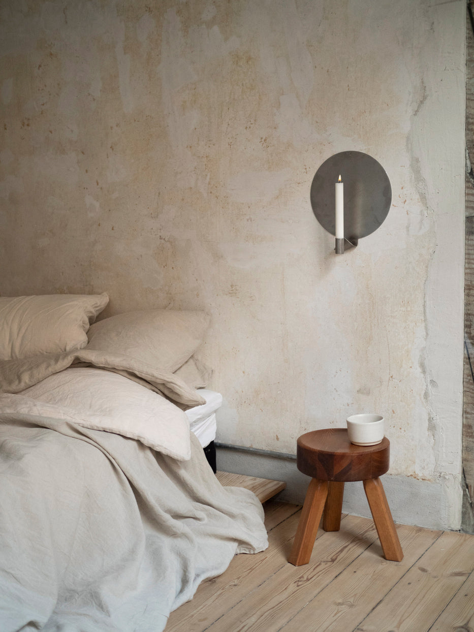 The FRAMA Ornament Candle Holder is a wall-mounted sculpture for candles crafted from delicate stainless steel and designed by Kim Richardt. The geometrical stainless steel piece gently reflects candlelight while adorning your wall.