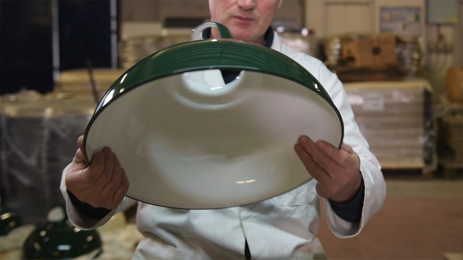 Material: Vitreous enameled steel shade. Vitreous enamel finishes are VOC-free, durable, fade-proof, steam and corrosion resistant. Brass socket.
