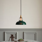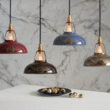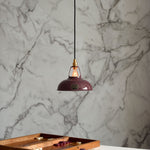 Material: Vitreous enameled steel shade. Vitreous enamel finishes are VOC-free, durable, fade-proof, steam and corrosion resistant. Brass socket.
