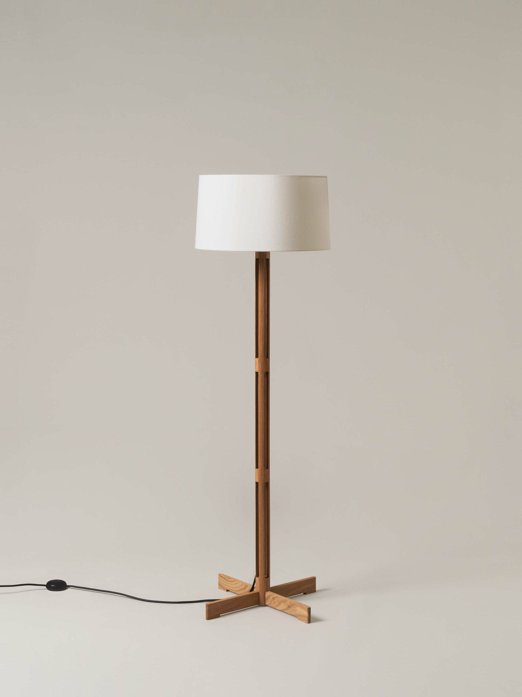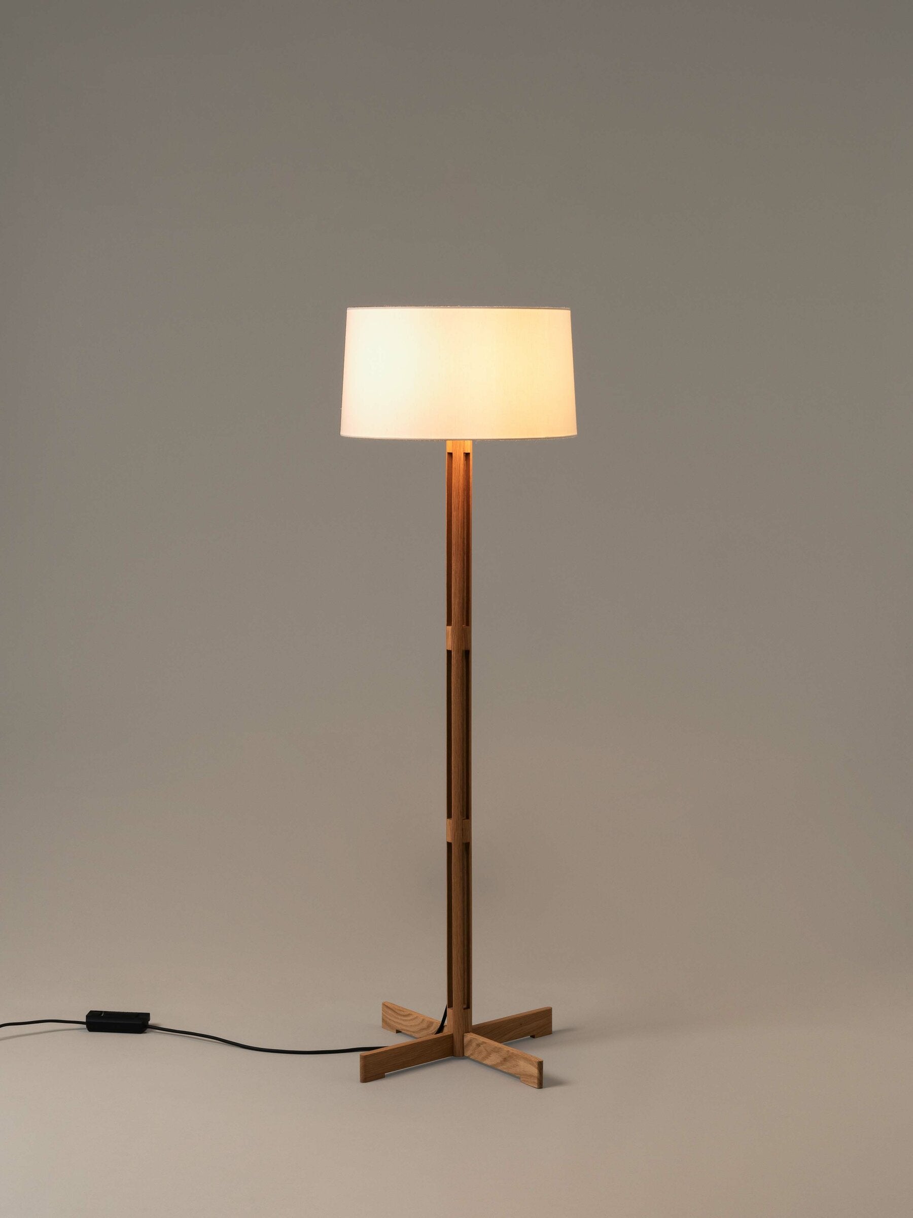 The FAD floor lamp by Santa & Cole features a solid cylindrical oak column that provides clean, vertical symmetry and architectural balance. This carefully crafted wooden base supports an almost perfectly cylindrical white linen shade, which diffuses light softly and evenly. The pairing of natural oak and linen showcases Miguel Milá’s sensitivity to materials and his enduring commitment to essential, honest design.