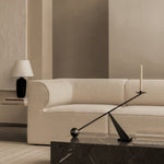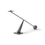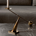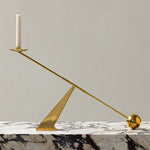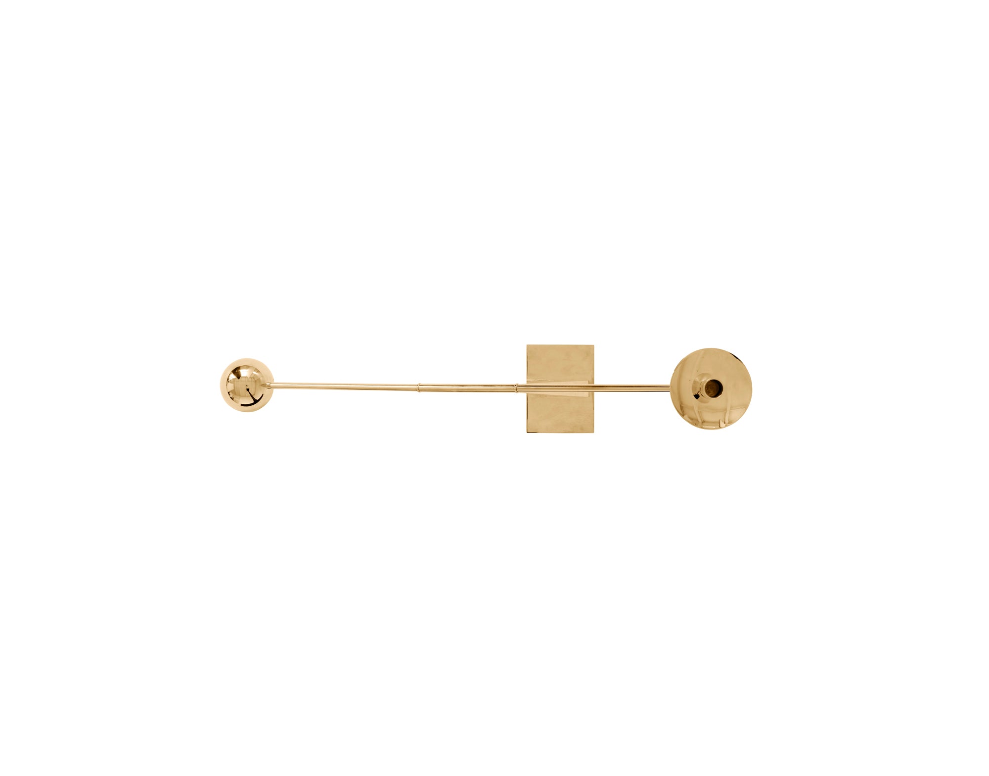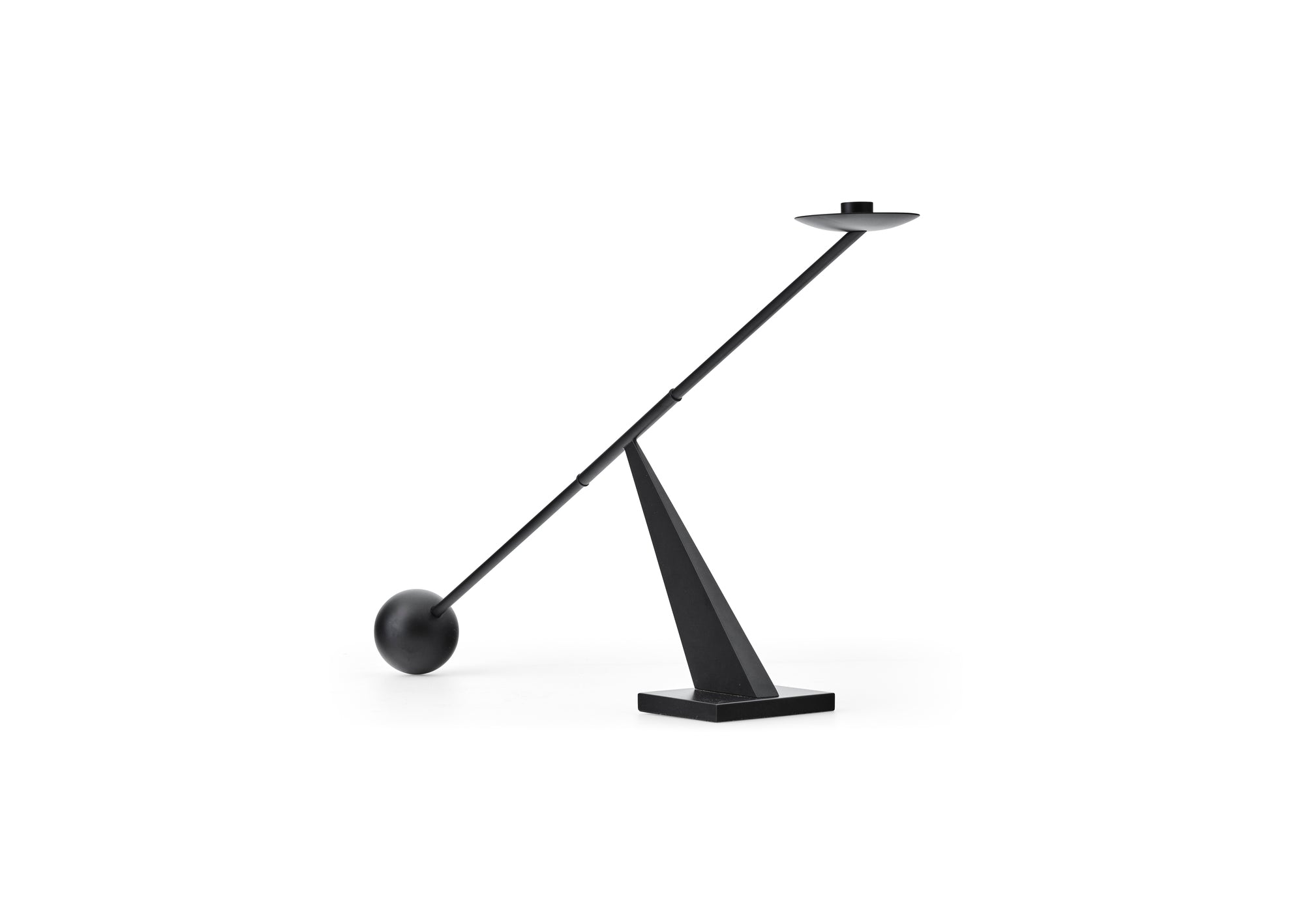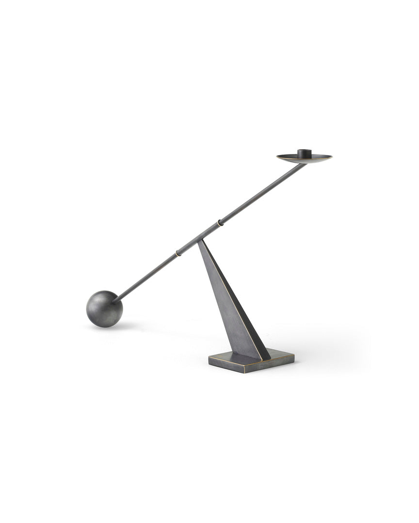 As a source of cozy candlelight, it is characterized by its deceptively simple geometric form: a sphere, an angle and a line, which unite to create a unique design. Available in polished brass or painted steel, it goes beyond its intended use to function as a sculpture.