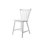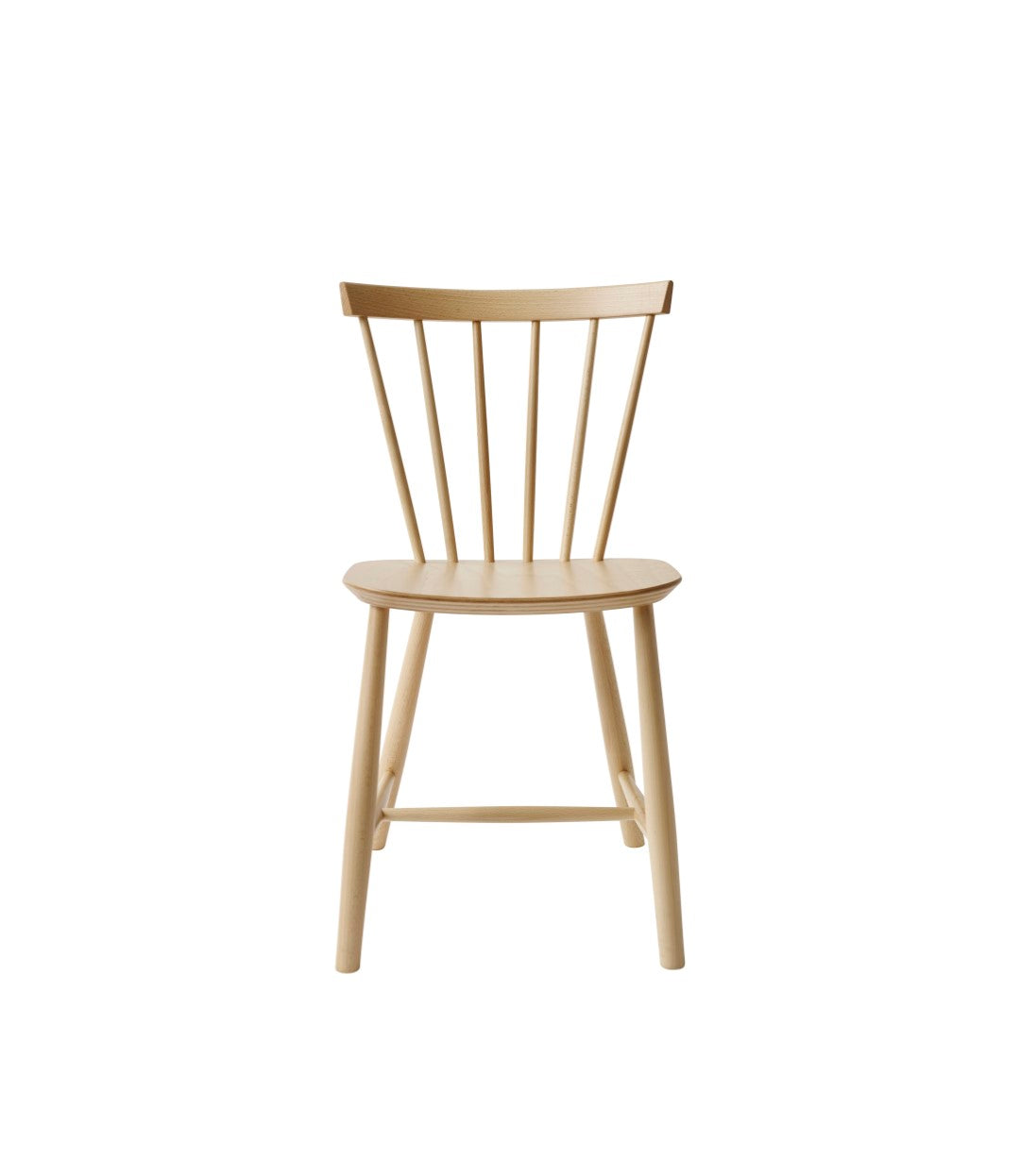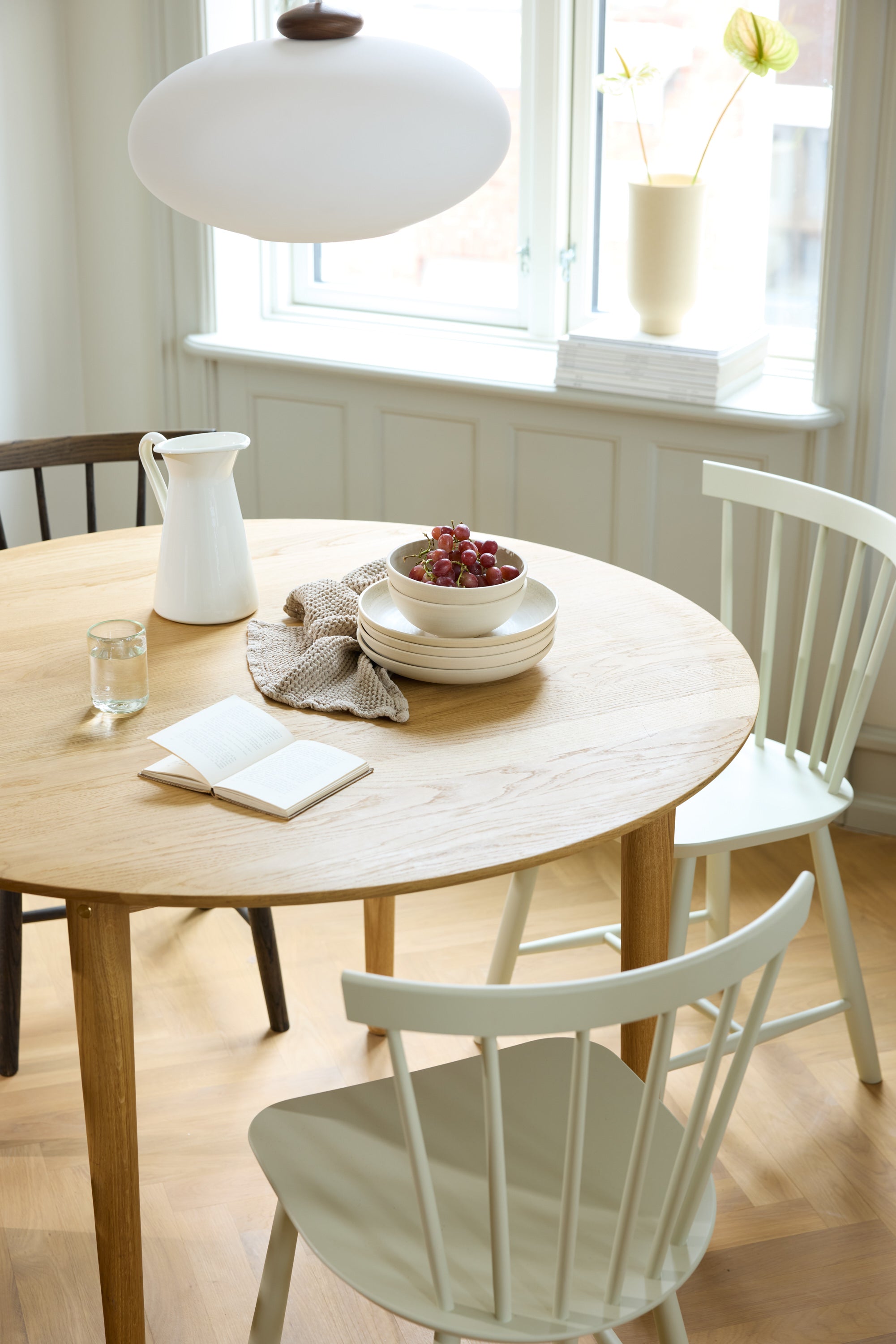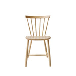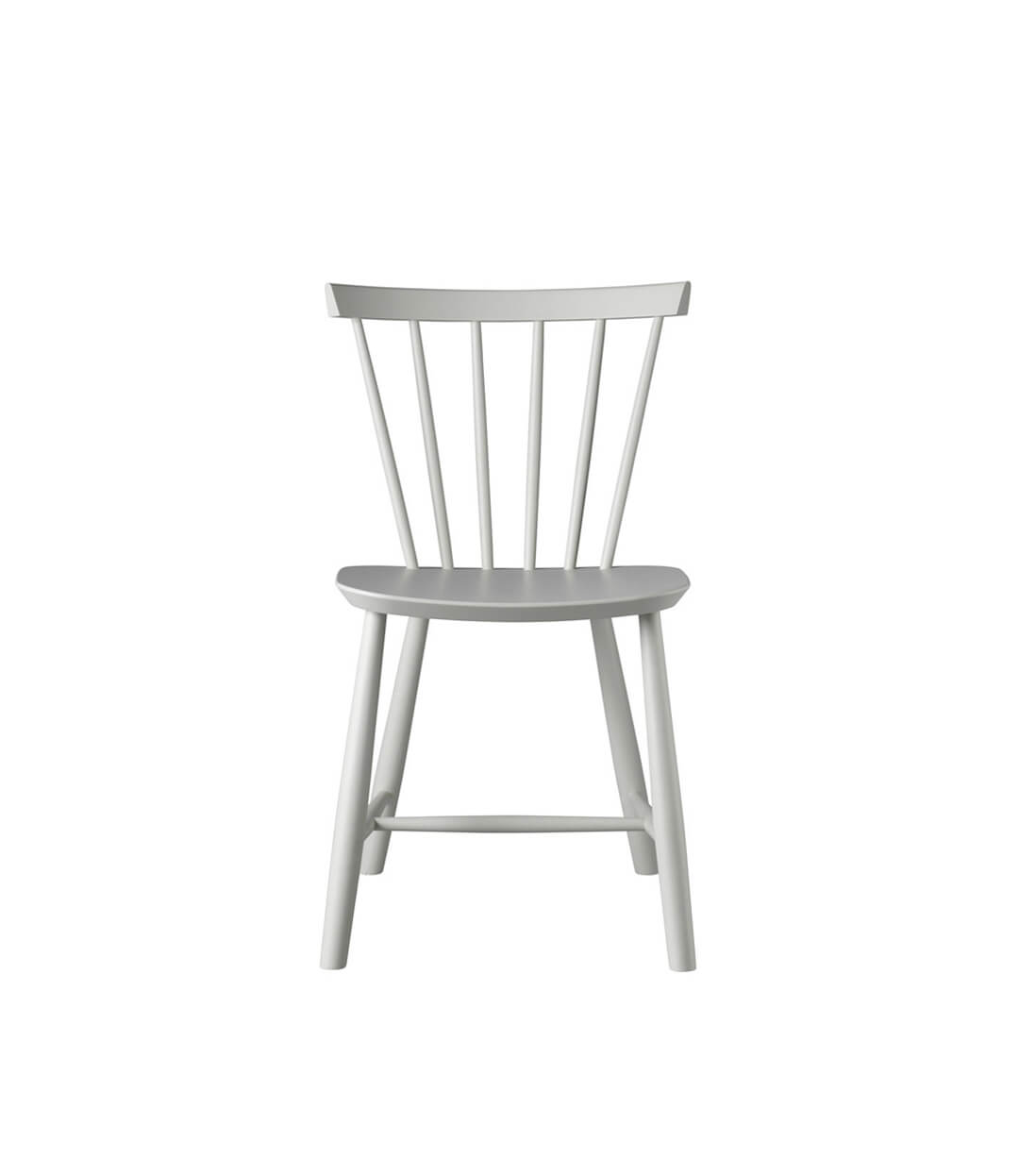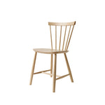 The J46 dining chair by FDB Møbler features a distinctive fan-shaped backrest and a gently angled seat for everyday comfort. It is available in solid oak or painted solid beech wood, with finish options that allow it to integrate seamlessly into both contemporary and traditional dining spaces.