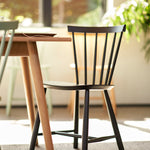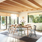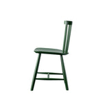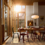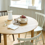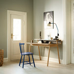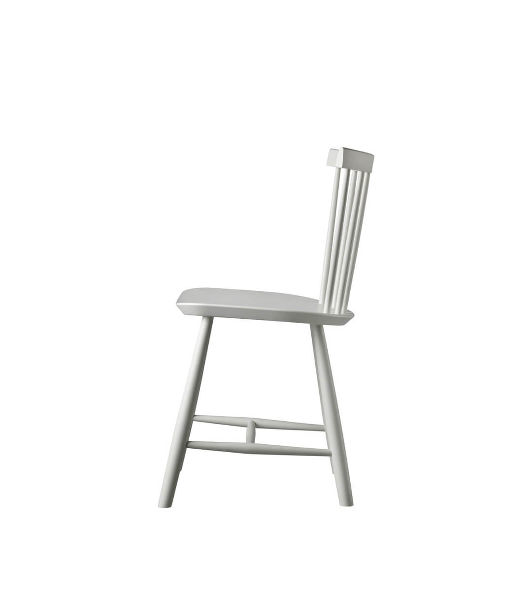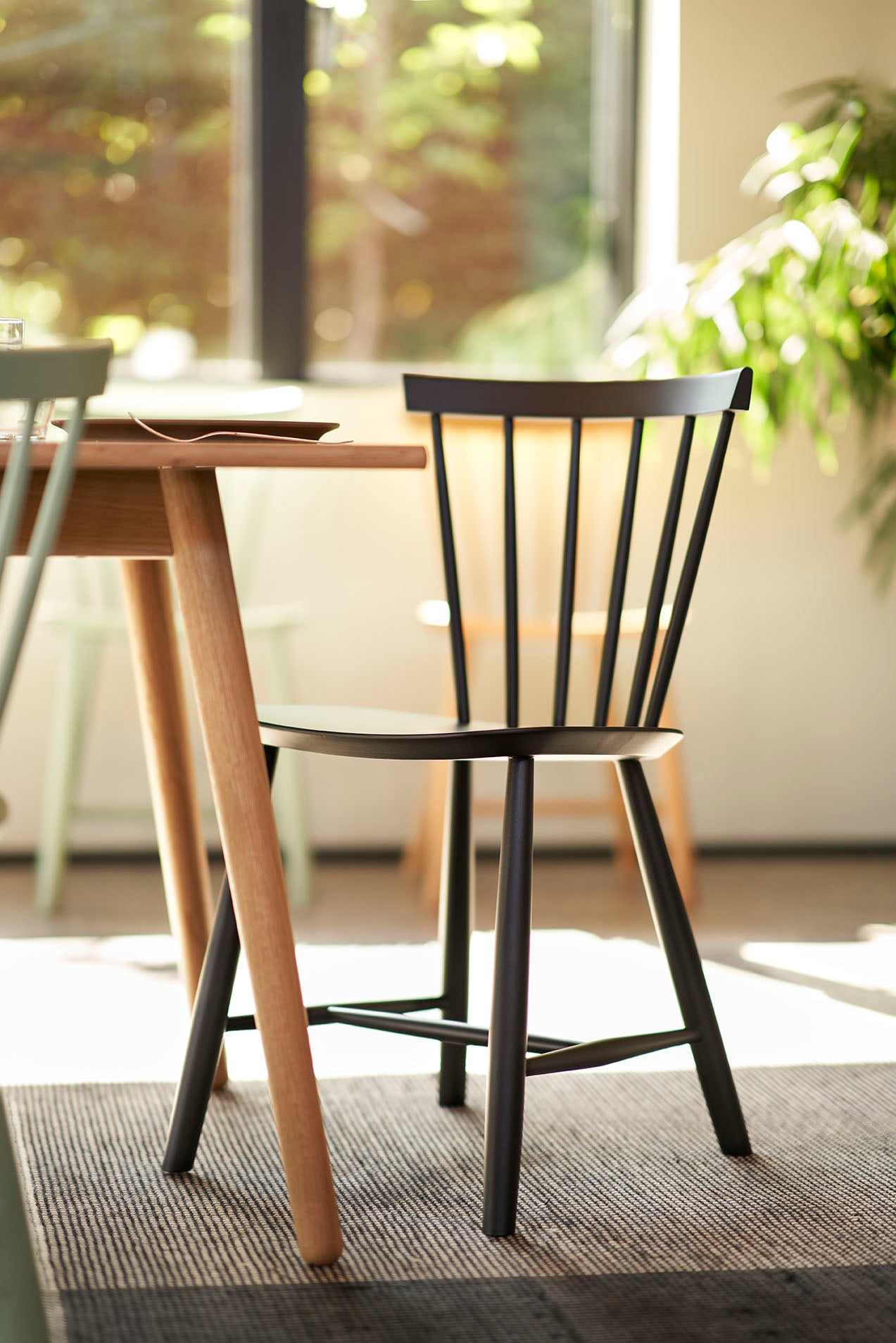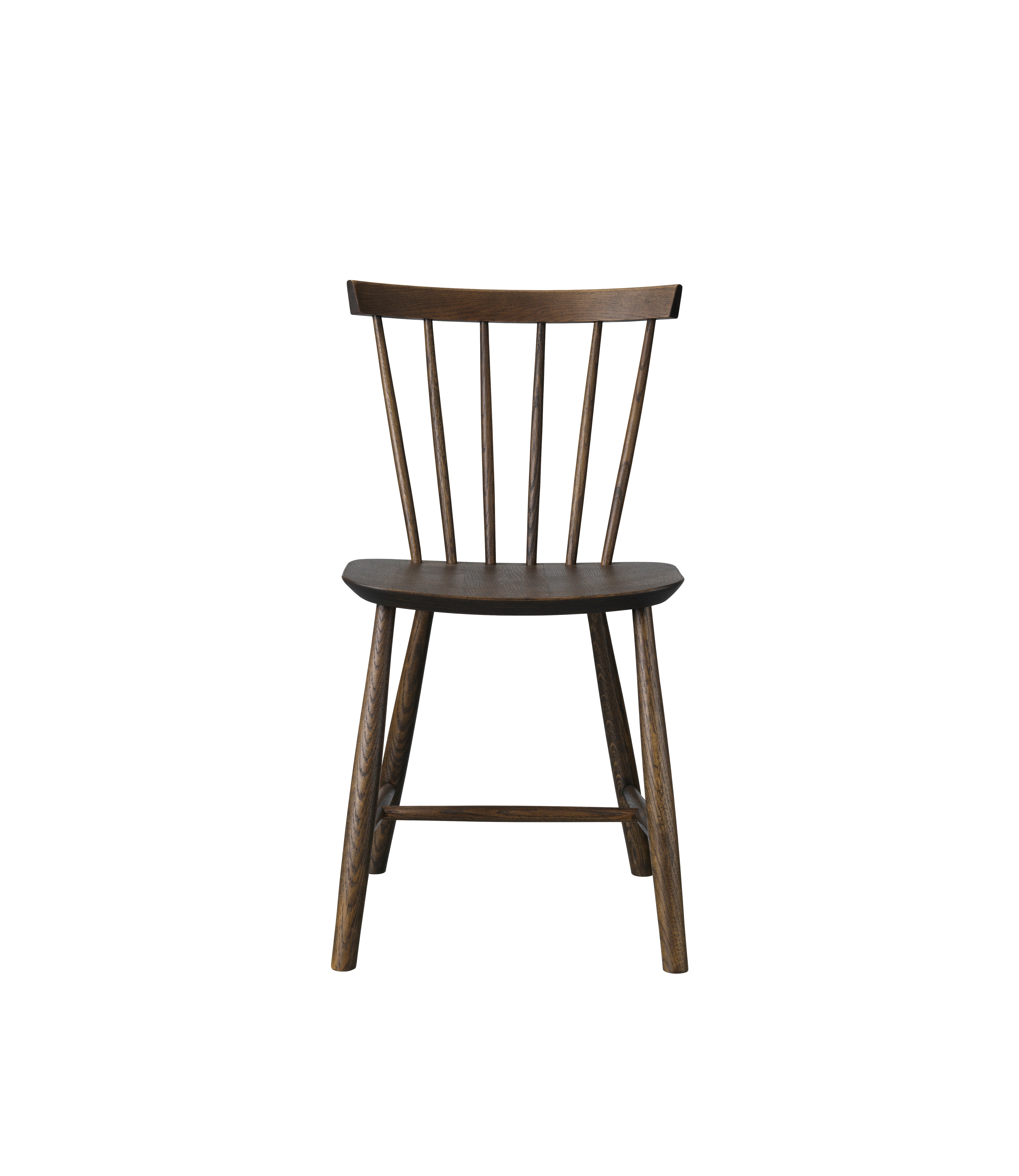 The J46 dining chair by FDB Møbler features a distinctive fan-shaped backrest and a gently angled seat for everyday comfort. It is available in solid oak or painted solid beech wood, with finish options that allow it to integrate seamlessly into both contemporary and traditional dining spaces.