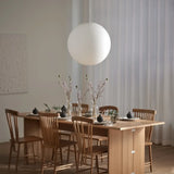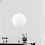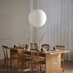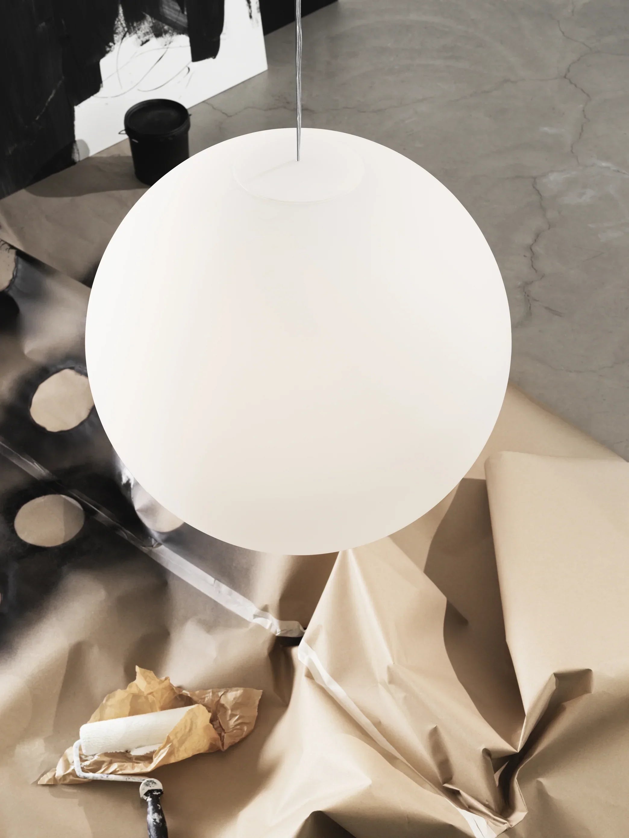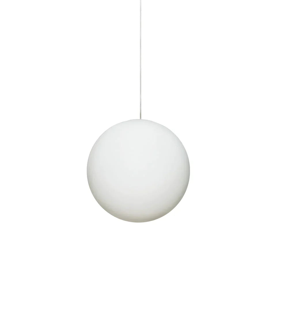 Mouth blown opal glass globe, transparent PVC-cord with steel wire core, acrylic cross.