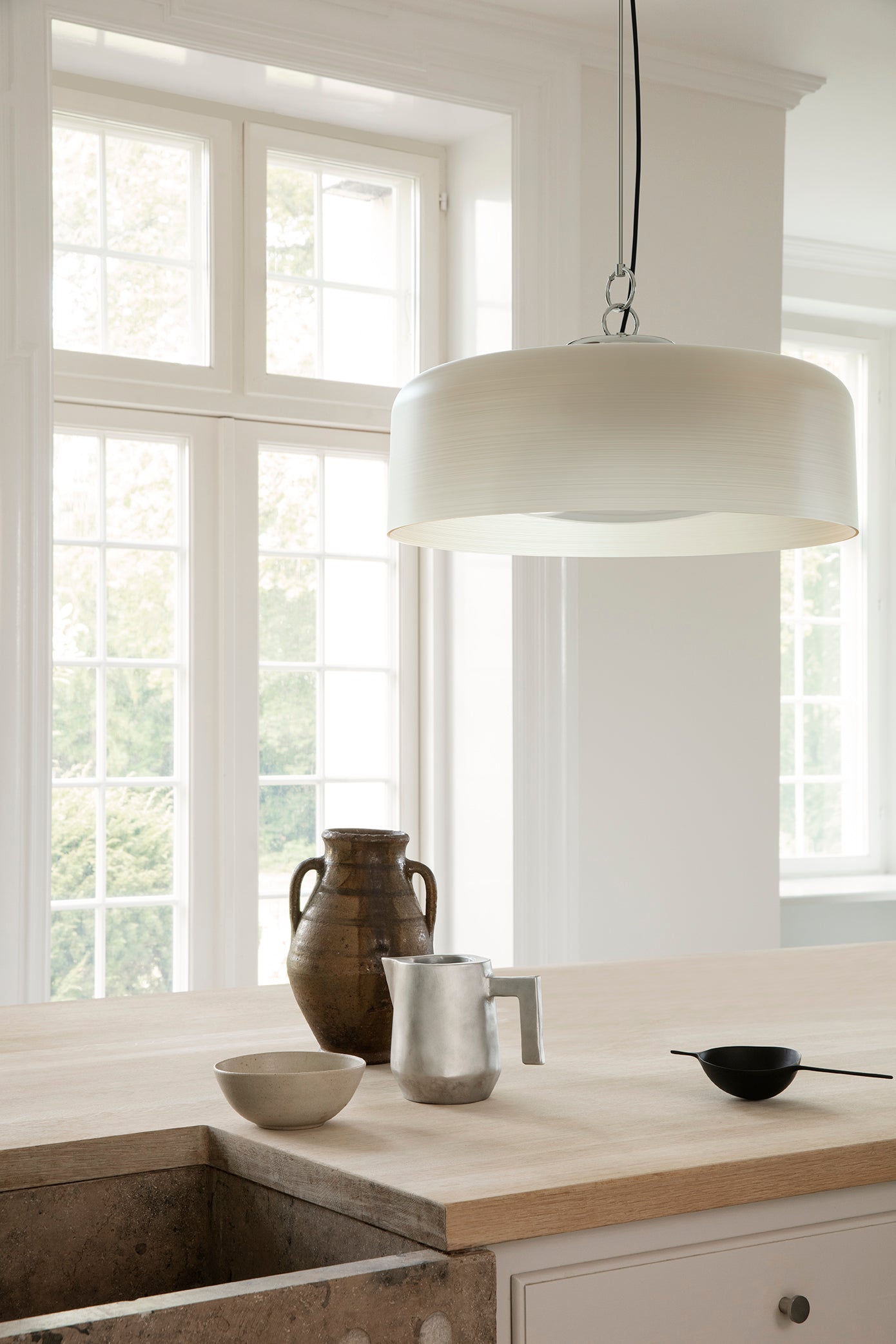 The iconic Astep Model 2050 by Franco Albini and Franca Helg, Astep continues its work of rediscovery of great Italian masters of light while also pursuing the same pioneering spirit in materials research that animated Albini, Helg and Sarfatti. It does so by bringing environmental sensitivity into the equation through using Green Cast, a material that is 100% recycled and recyclable, patented and made in Italy, featuring identical properties of classic methacrylate. With its brushed finish, the Green Cast used for the new 2050 diffusor restores a timeless elegance.