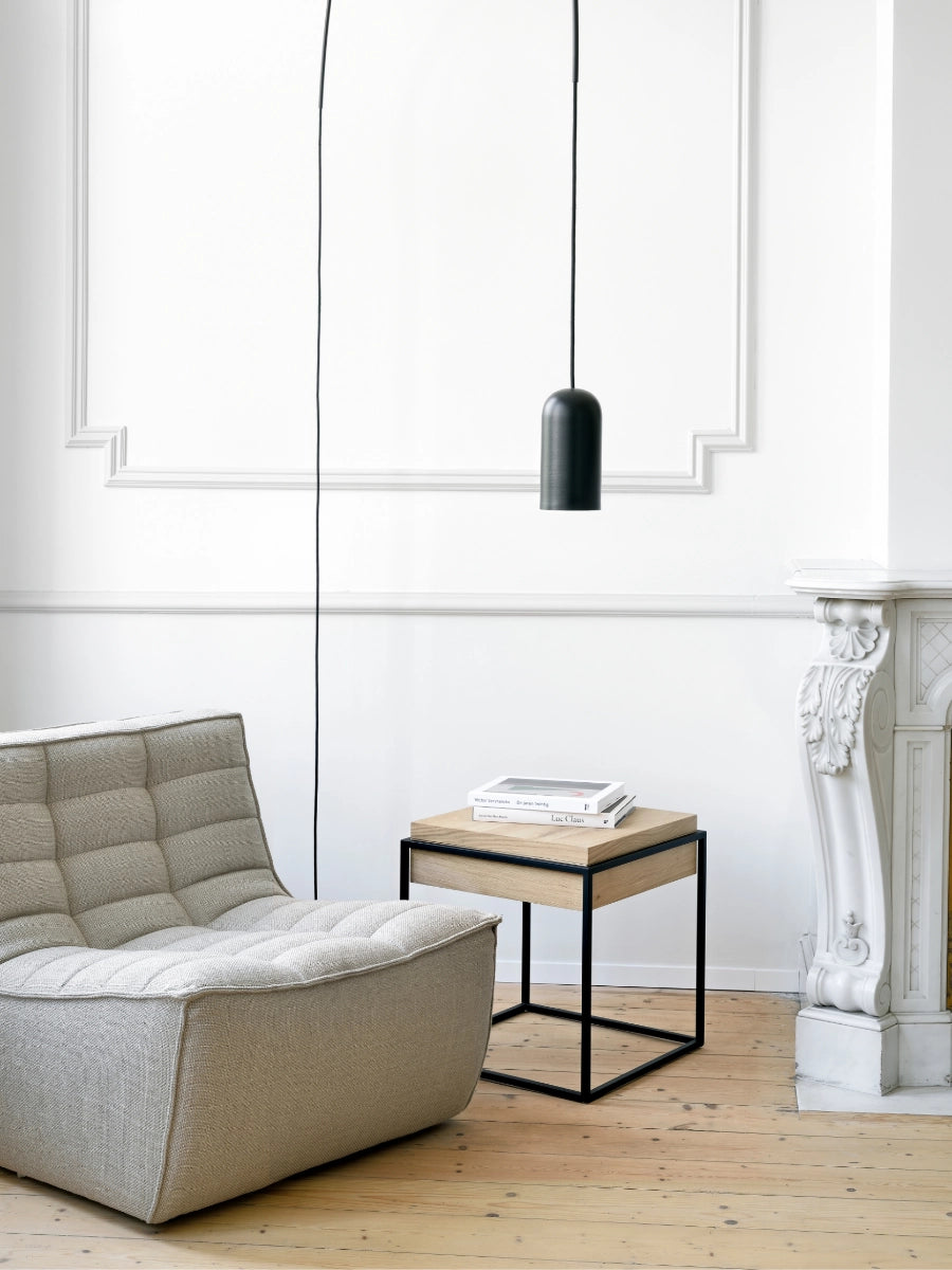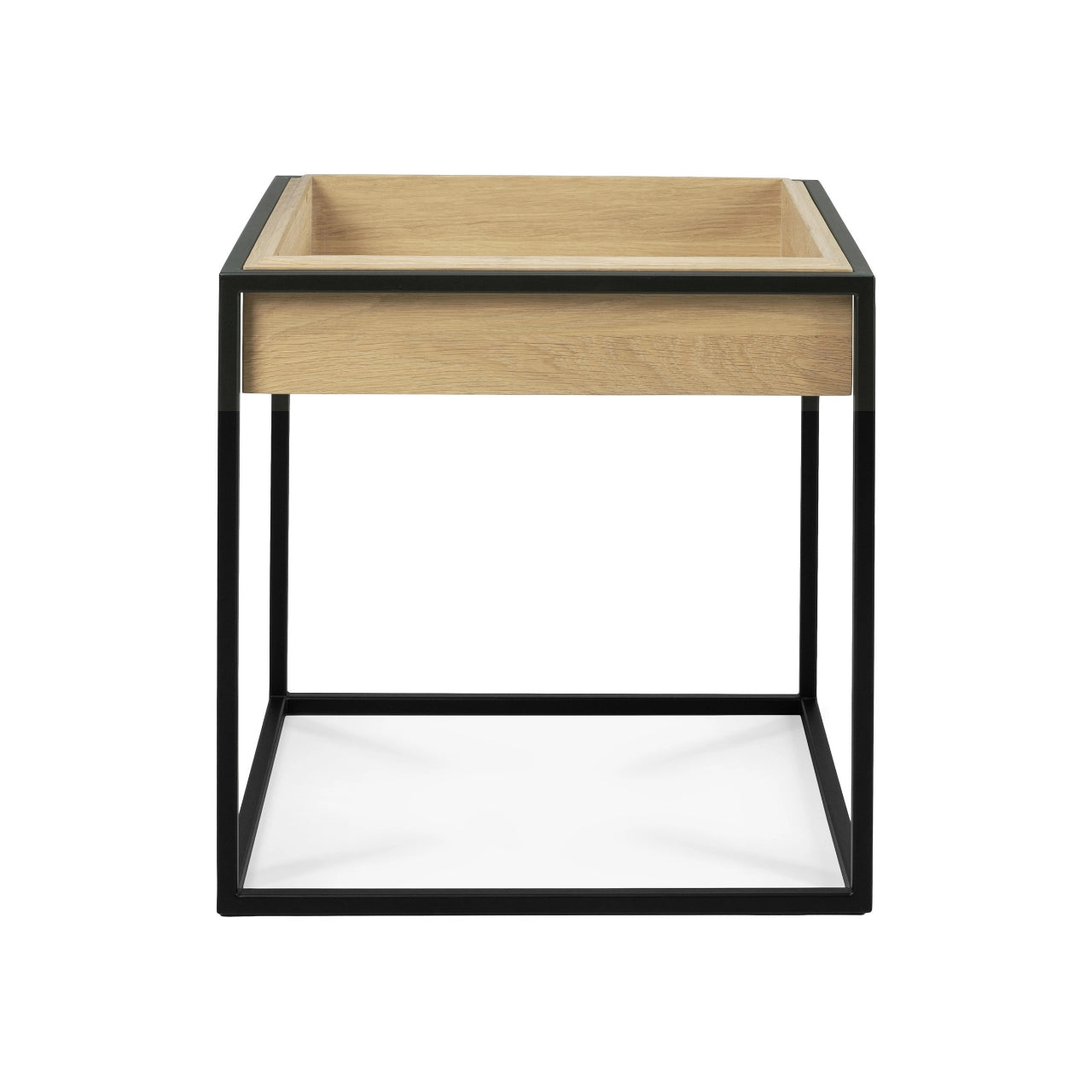 The Monolit Side Table by Ethnicraft blends minimalist design with practical storage, creating a refined accent for modern interiors. Its solid oak top and removable cover reveal hidden storage, offering both functionality and style. The table’s clean lines and sturdy black metal frame enhance the contemporary appeal of Scandinavian design.