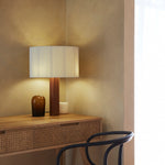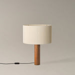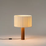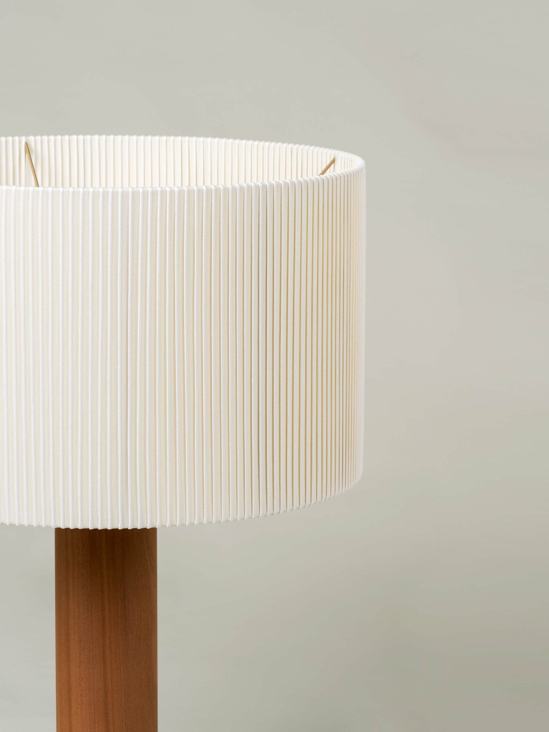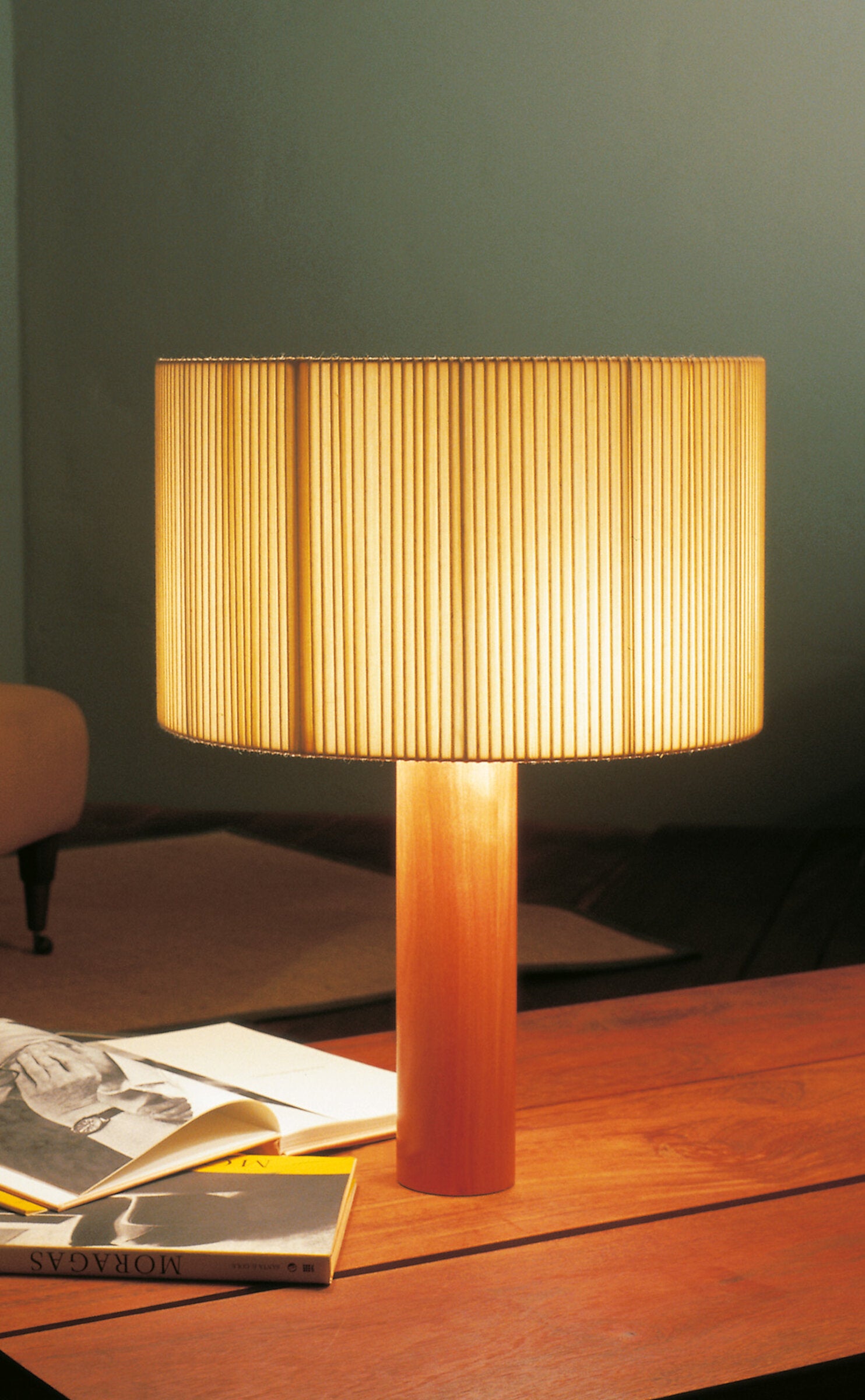 Moragas by Santa & Cole is a table lamp made in Spain, designed in 1957 by Antoni de Moragas Gallissà. It features a solid Sapele wooden cylinder base that supports a three-bulb lighting structure, all crowned by a wide circular shade crafted from cotton ribbon.