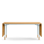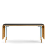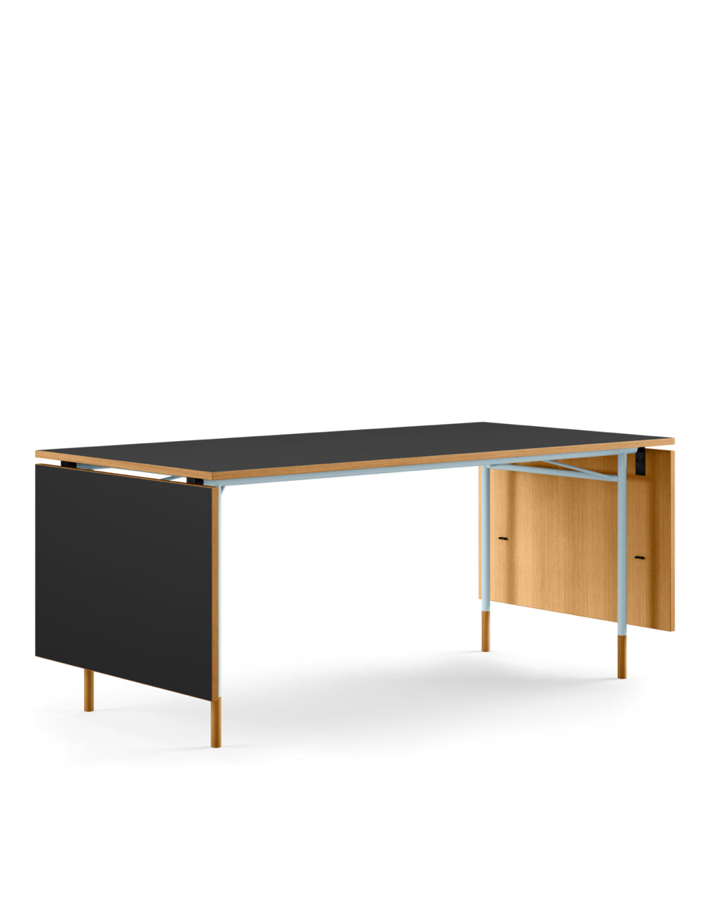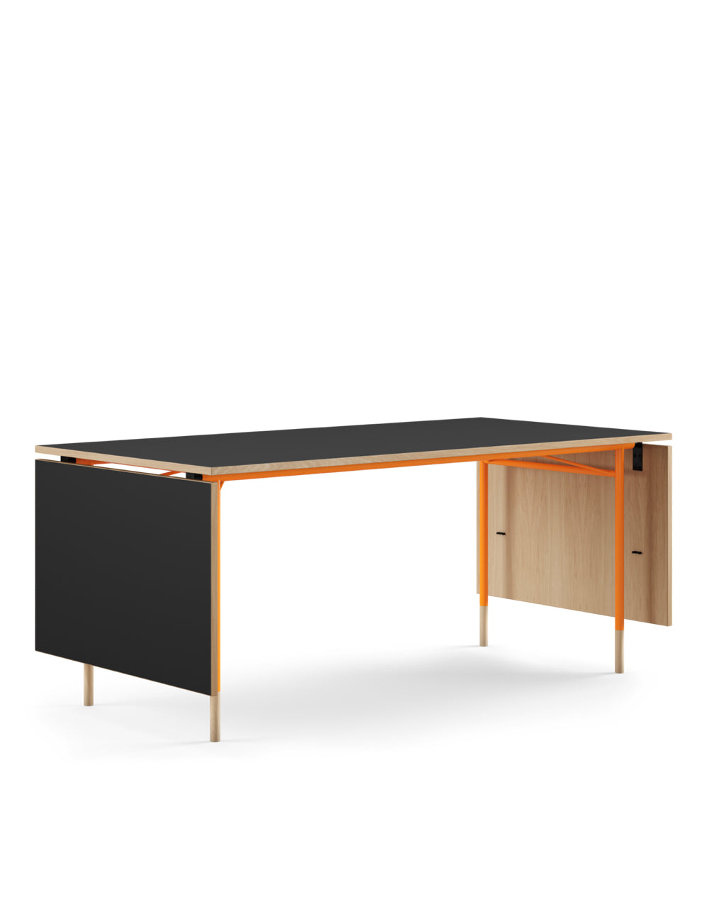 The tabletop can be ordered in either teak, oak, walnut, Oregon pine, or linoleum in the colors 'black' or 'mushroom'.