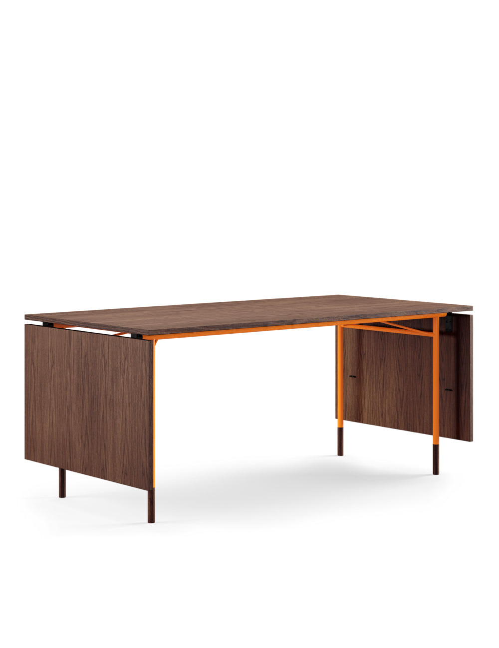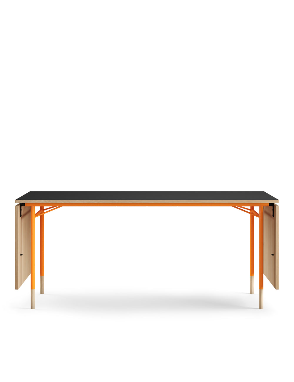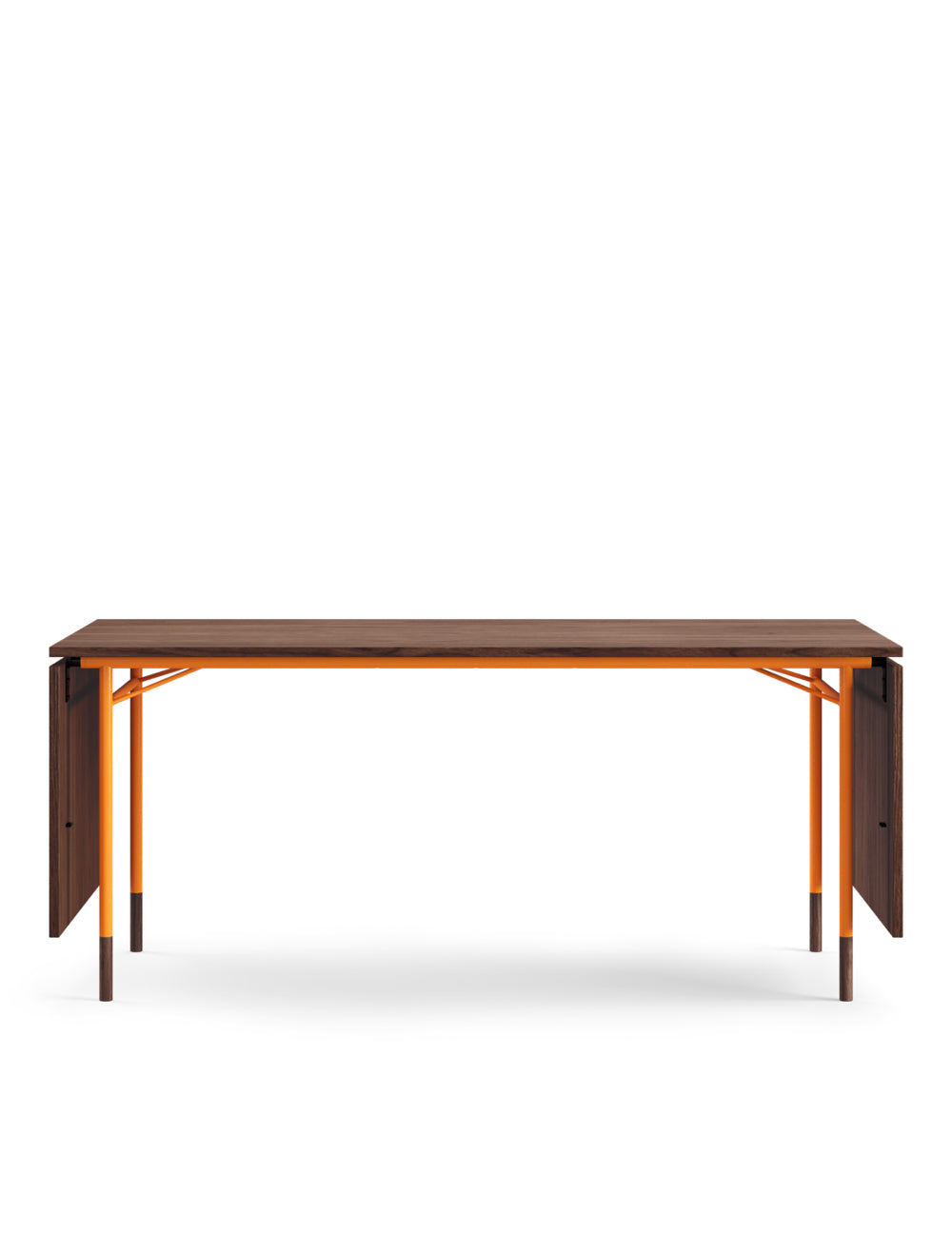 Danish legend Finn Juhl was known for adding visual lightness to his designs and the Nyhavn Dining Table is no exception. While he was was inspired by the simple designs of his American counterparts (Charles Eames, in particular) Juhl's sense of functionality and detail is what adds real character to this piece. The orange and blue colors are characteristic of Finn Juhl's designs and were inspired by 18th century German writer and polymath Johann Wolfgang von Goethe's wheel of warm and cold colors.