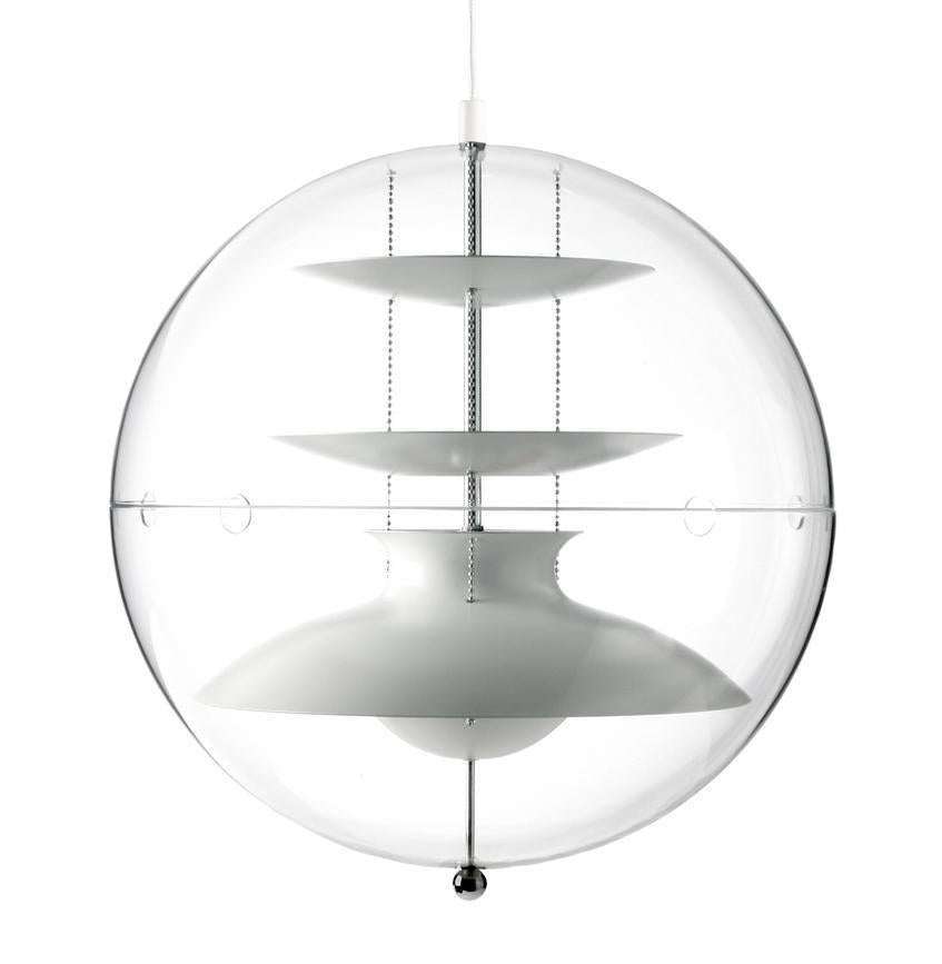 A decorative pendant featuring a crystal clear transparent acrylic outer sphere with four white reflectors suspended by three steel chains. The white interior reflectors suspended by steel bead chains is only interrupted by a little splash of red visible only from below the pendant—A classic Verner Panton touch.