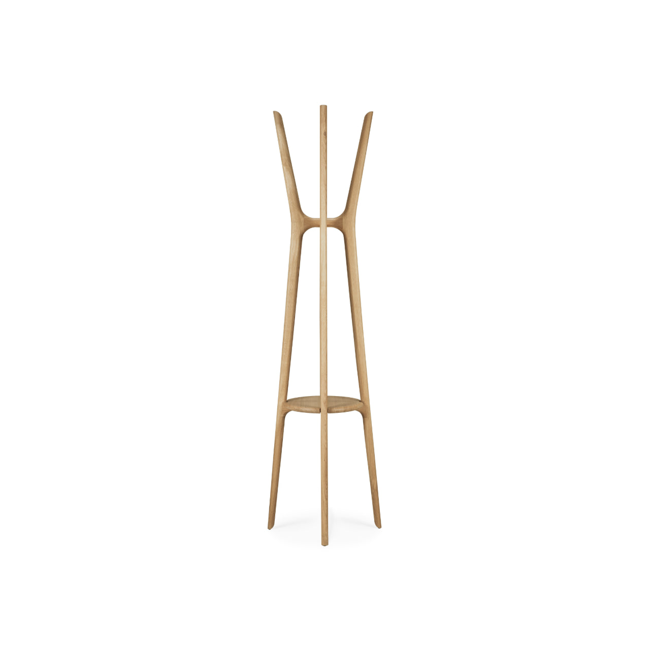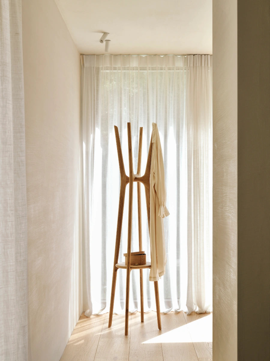 The PI Coat Stand by Ethnicraft introduces sculptural function to entryways and living spaces influenced by Scandinavian design. Its vertical profile and softly curved arms create an organized place for coats and accessories while maintaining a calm visual rhythm. The form supports interiors that value balance, restraint, and everyday usability.