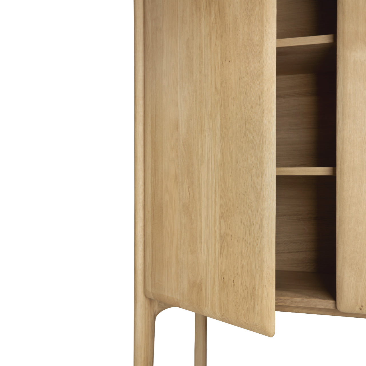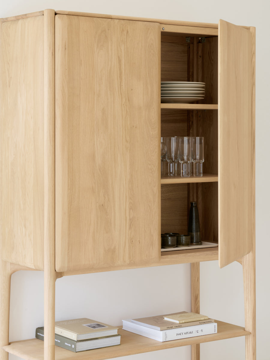 The PI Cupboard by Ethnicraft brings sculptural presence and generous storage to living and dining spaces shaped by Scandinavian design. Celebrating nature’s own curves and lines, this tall cupboard combines refined form with practical organization, helping keep everyday items tucked away while maintaining calm, composed interiors. Designed with push-to-open doors that conceal adjustable shelves, it offers flexible storage without disrupting visual balance.