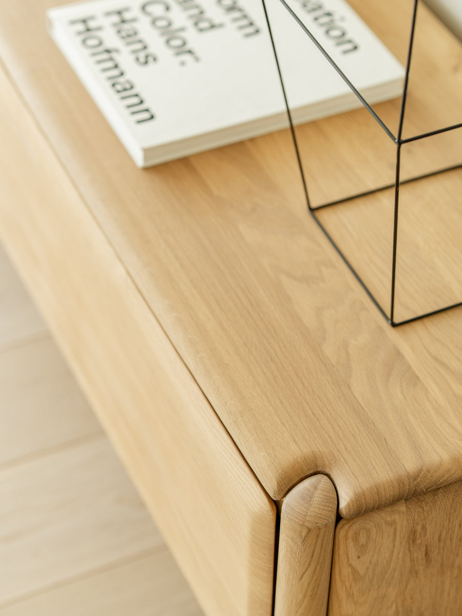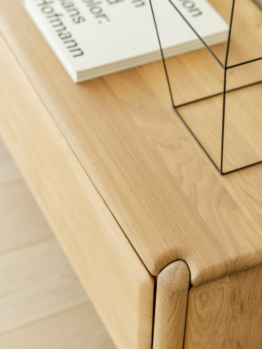 Crafted from hand-finished solid oak with a hardwax oil finish, the PI TV Cupboard highlights the warmth and grain of natural wood while remaining durable for everyday use. Each piece is finished by hand to respect the unique character of the timber, reinforcing Scandinavian design values that emphasize material honesty and longevity.