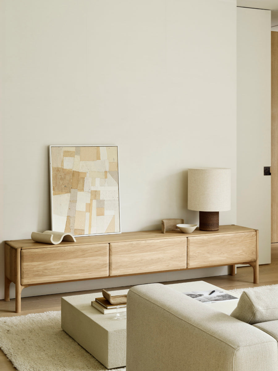 The PI TV Cupboard by Ethnicraft brings refined form and practical storage to living spaces shaped by Scandinavian design. Designed with a flip-down door and spacious drawer configuration, it organizes media components, remotes, and accessories while keeping surfaces calm and composed. Its clean geometry and open proportions support interiors that favor simplicity and balance over visual excess.