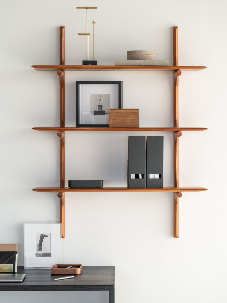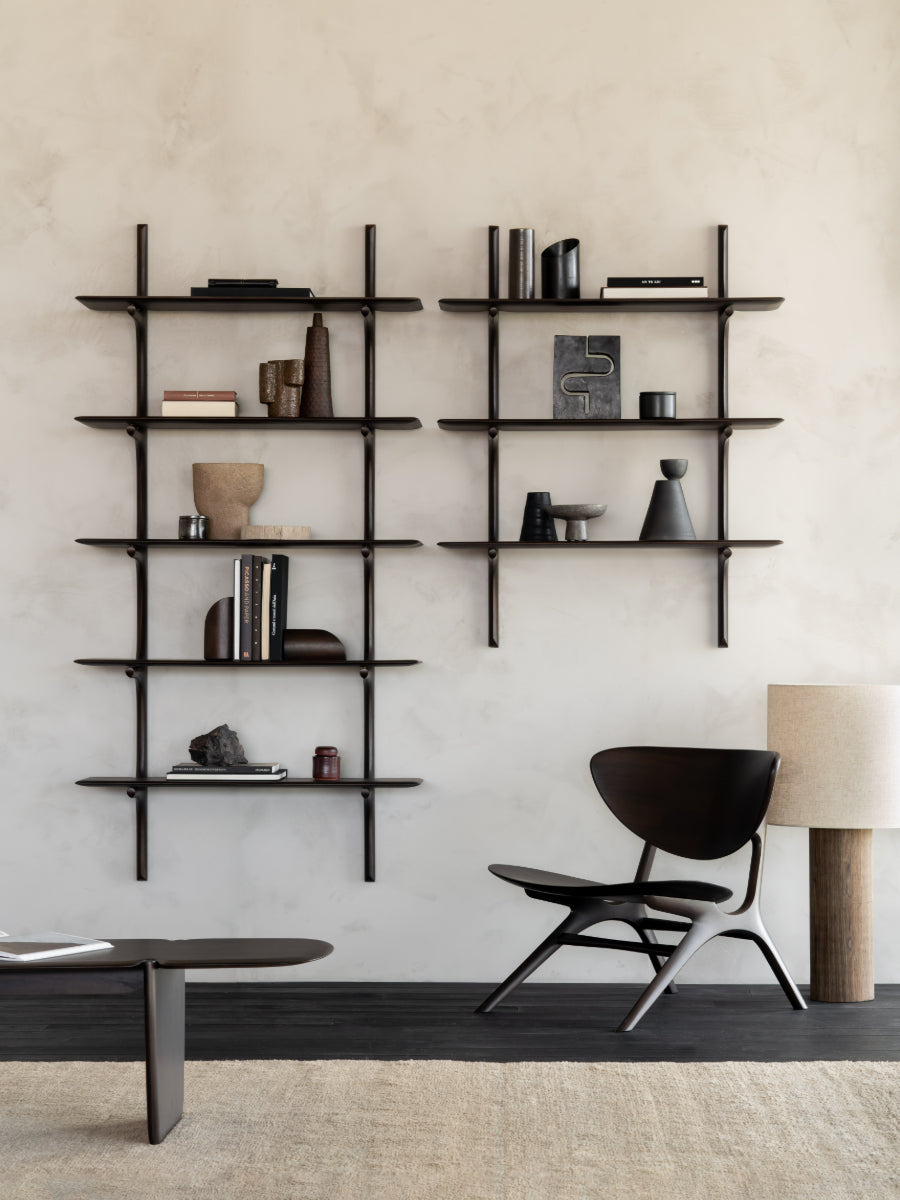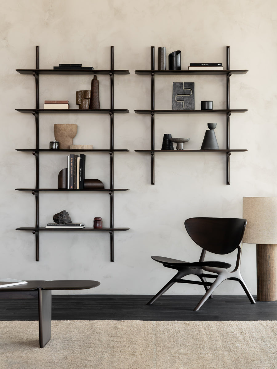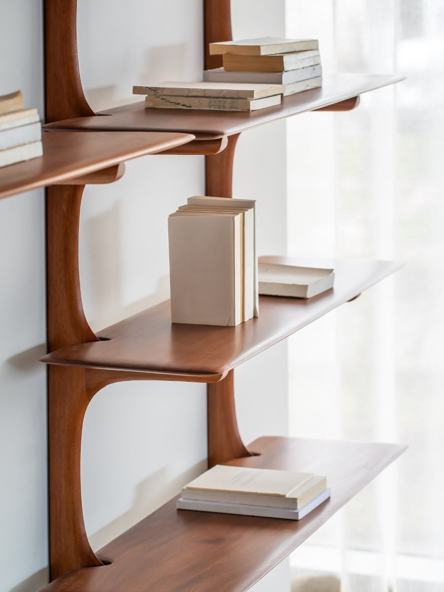 Handcrafted from carefully selected solid wood—available in mahogany, dark brown mahogany, or oak—each piece is finished to highlight the distinct grain and texture of the material. The shelf offers an elegant platform for displaying books, treasured objects, and décor with a sense of openness and ease. Whether mounted alone as a floating accent or arranged in multiples for a dynamic composition, it creates a calm yet expressive focal point. The result is a harmonious blend of organic shape and understated geometry.