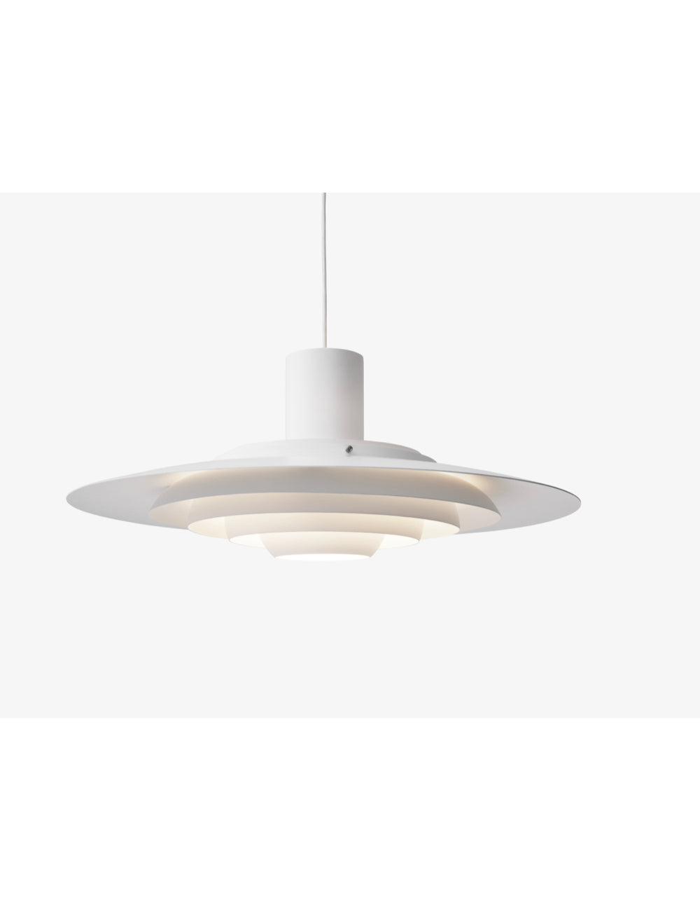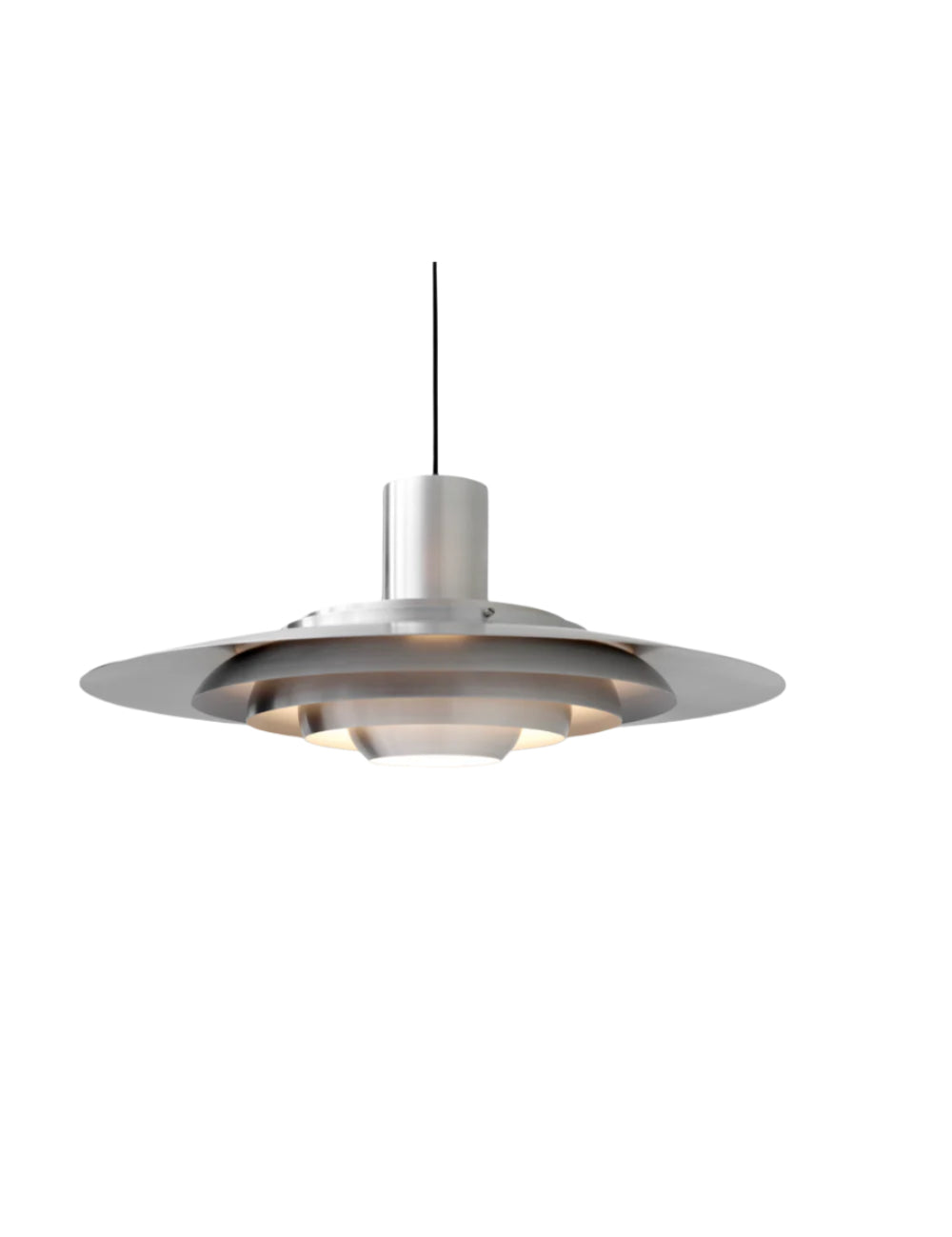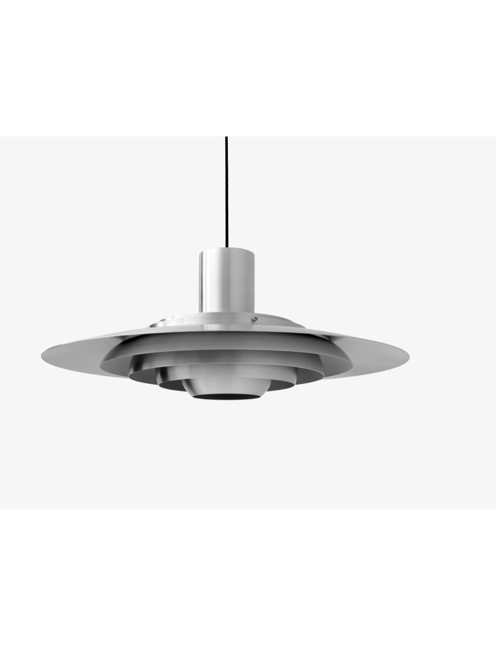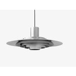 The P376 pendant lamp is a perfect example of Kastholm & Fabricius' subtle architectural slant on design. Originally conceived in 1963, five concentric shades create gradations of curves towards the middle of the lamp to emit a soft, diffused light. The discrete placement of the shades and the silky aluminum finish culminate in a cohesive expression that's both iconic and enthralling.