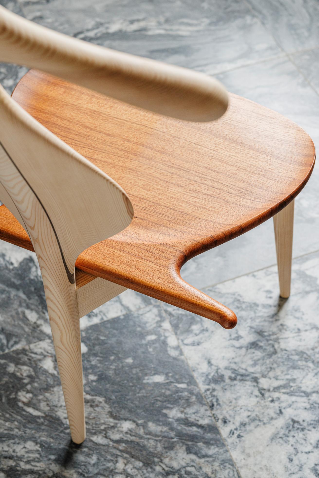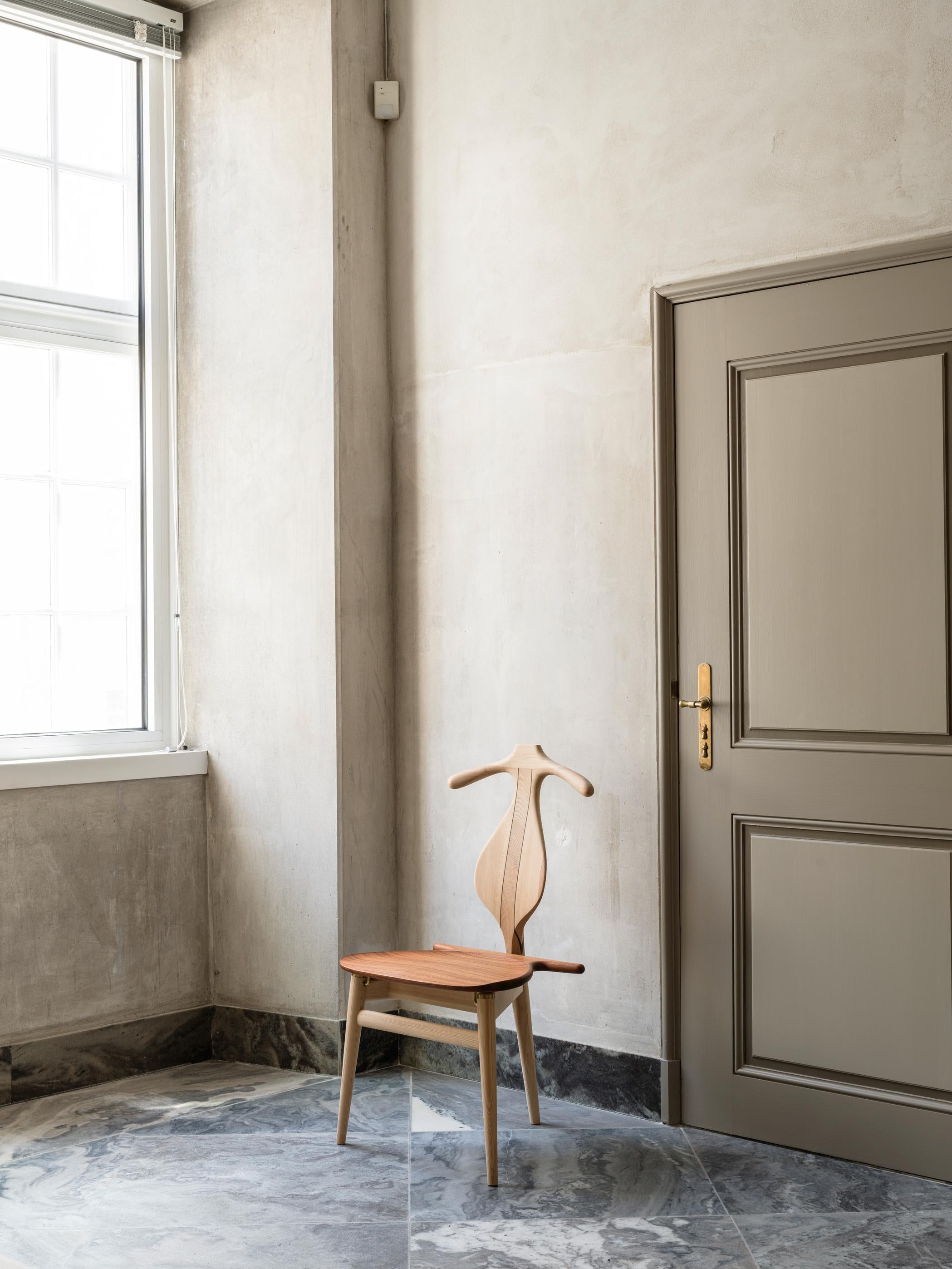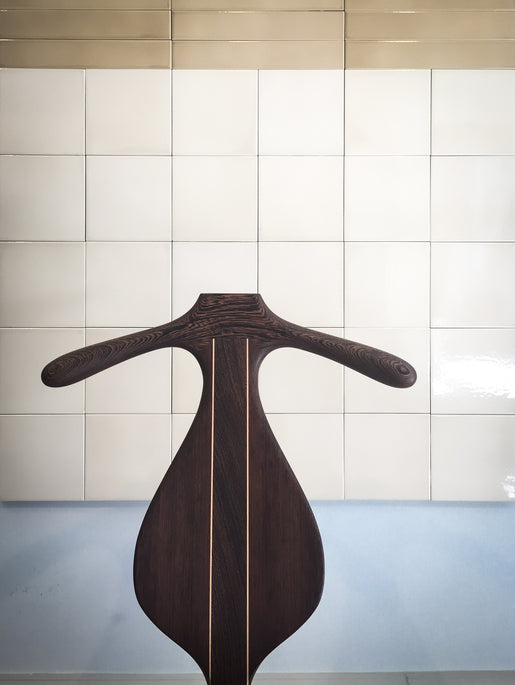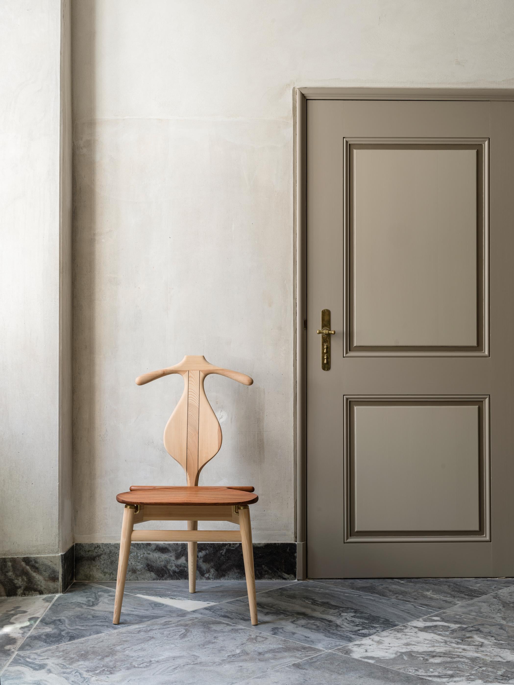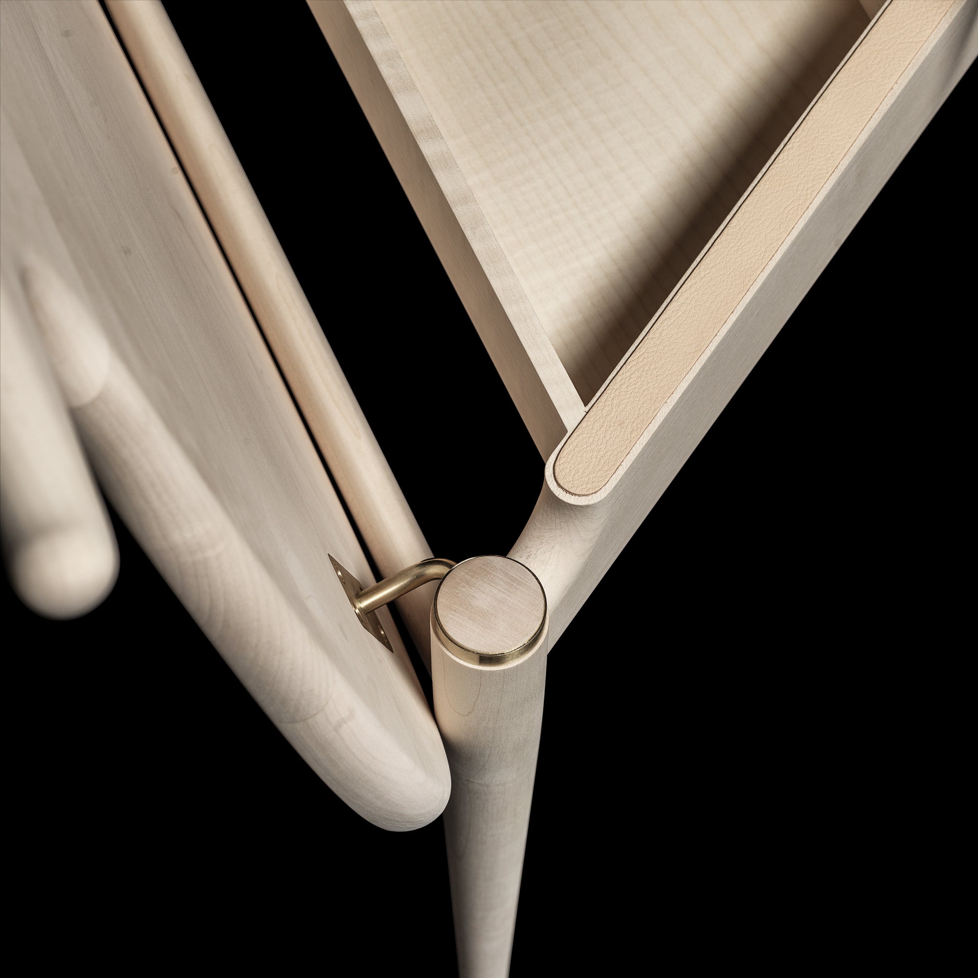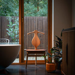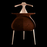 The back leg is carved in shape to offer both a comfortable backrest and a proper hanger for a jacket or a coat and the seat is sculpted to provide a comfortable sit and hinged to allow for an upright position on which additional clothes can be placed.