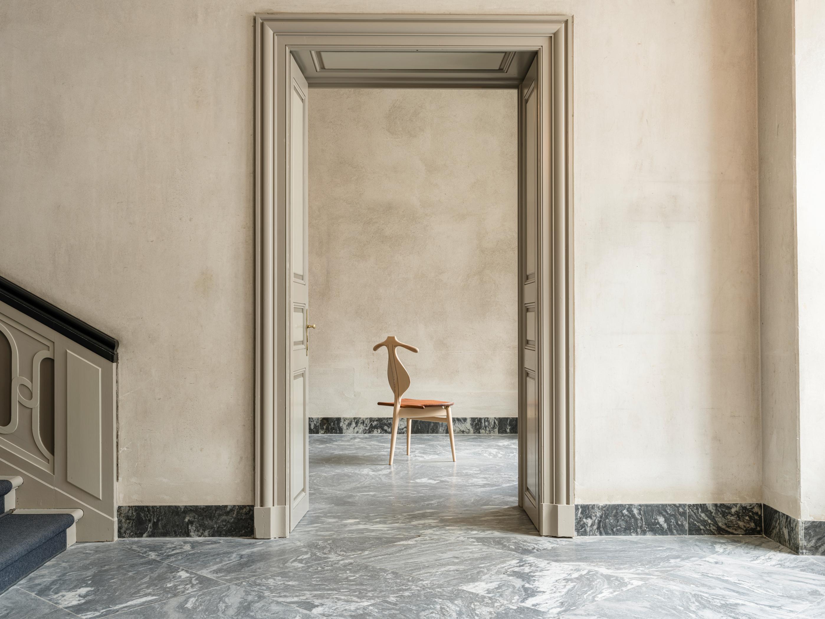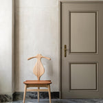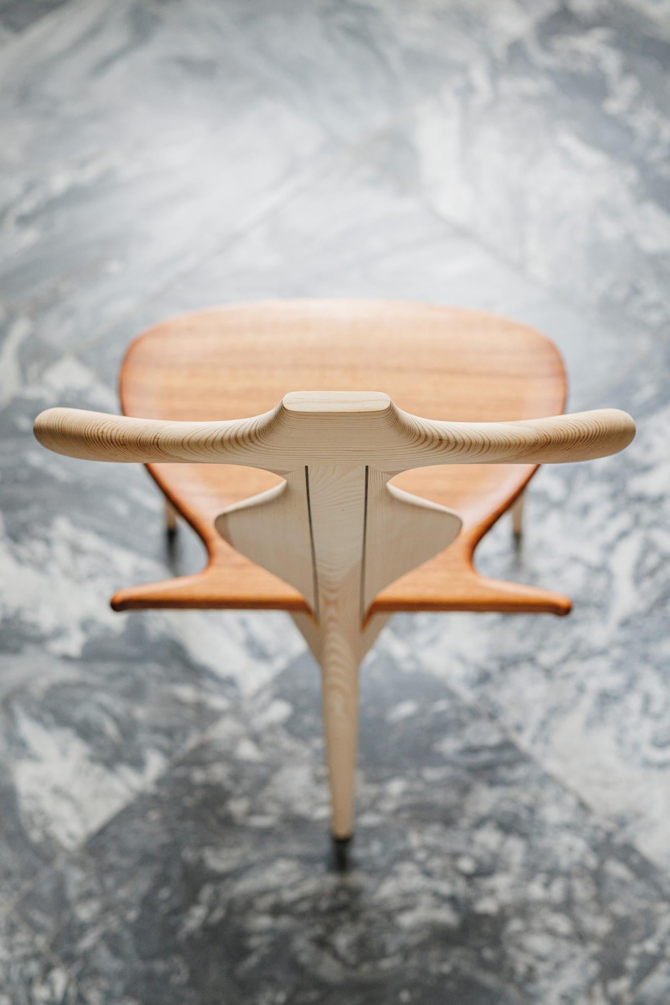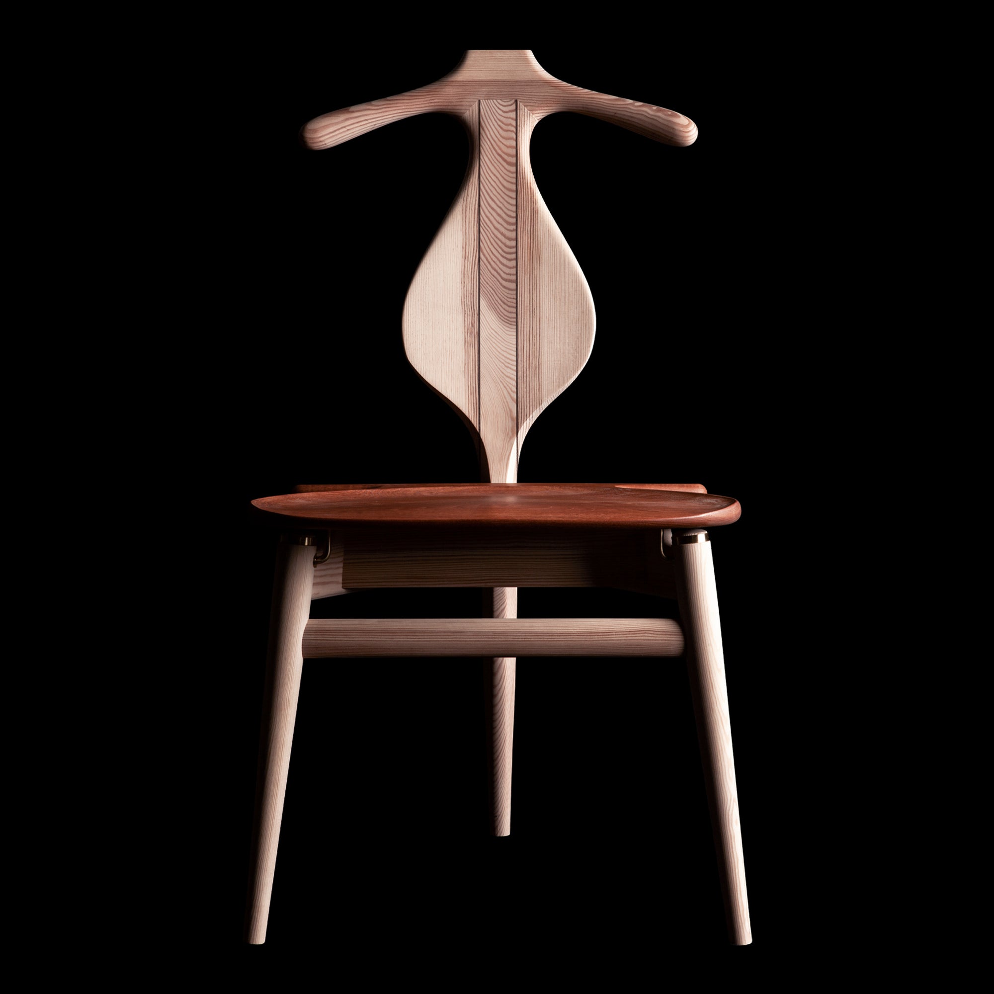 The three-legged Valet Chair is a Danish mid-century marvel and functional sculpture that applies the traditional function of a valet stand to an elaborately crafted wooden chair.