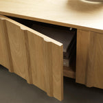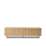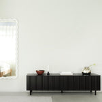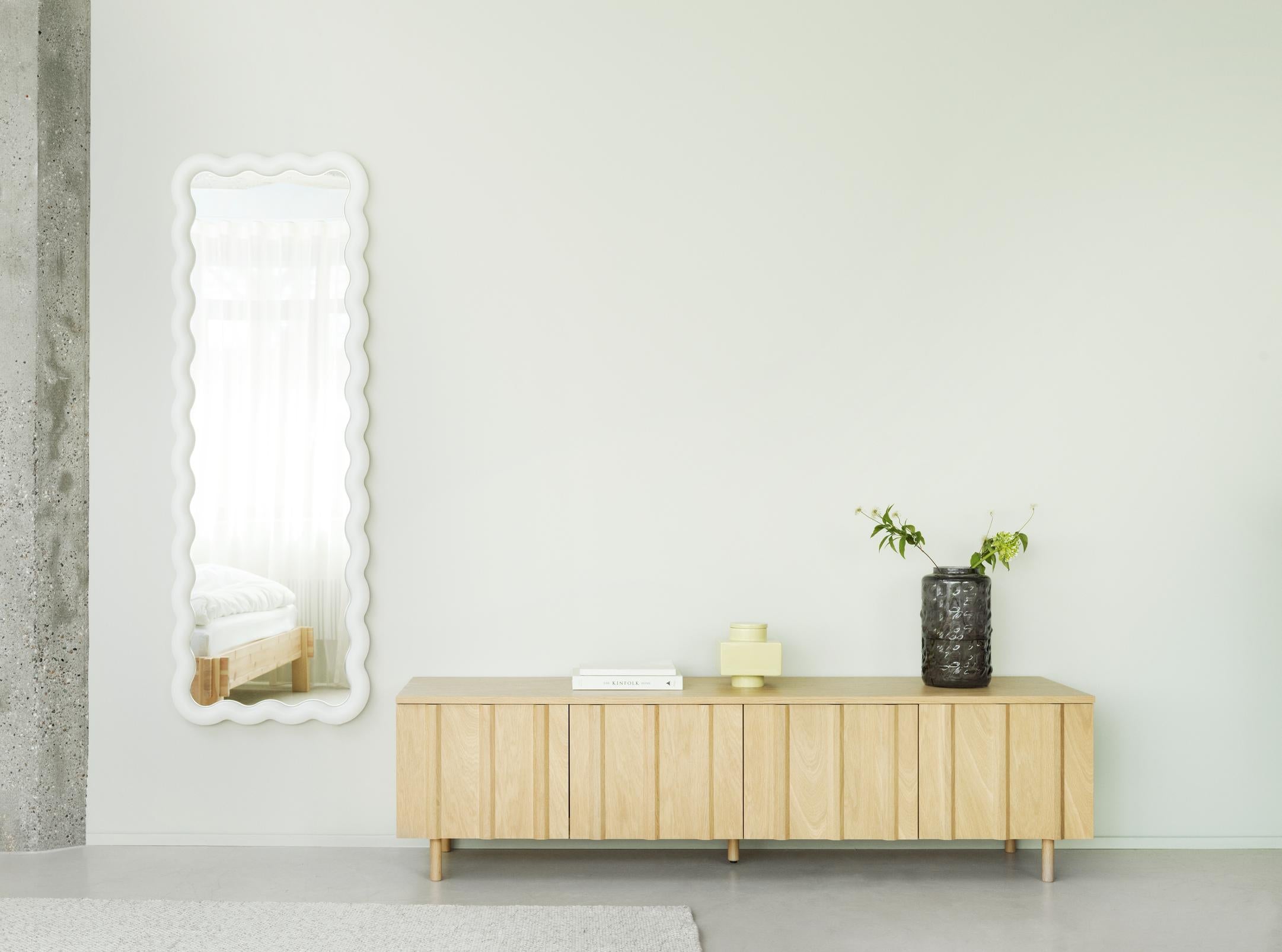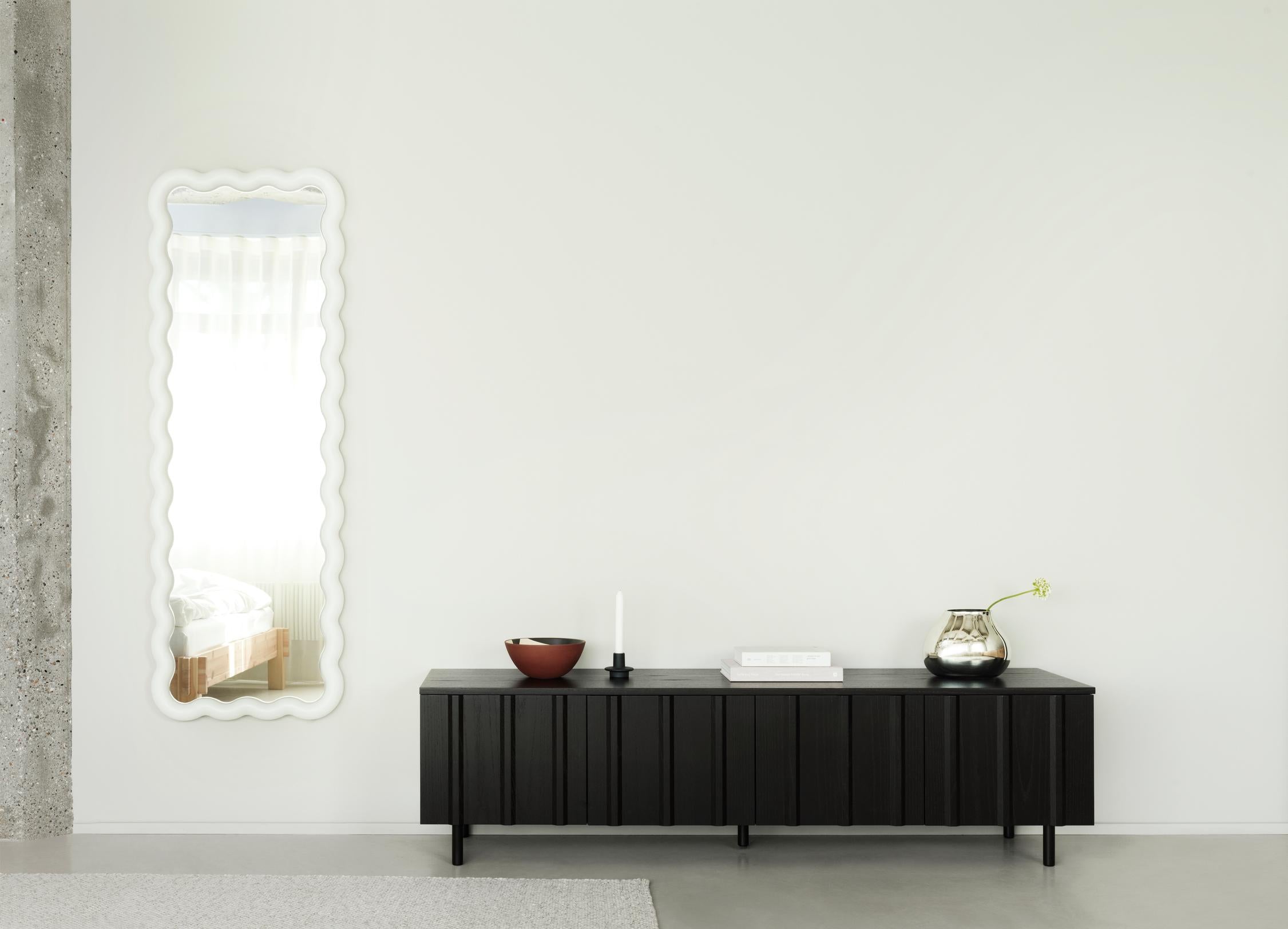 The Rib Sideboard is a timeless and elegant storage solution available in either lacquered oak veneer or painted and lacquered oak veneer. Rib Sideboard is equipped with a push latch, making handles redundant. The design has trapeze-shaped solid oak slats, which create a visual break in the uniform surface of the front and add depth and dynamics. Rib also comes as a dresser, cabinet and a bigger sideboard.