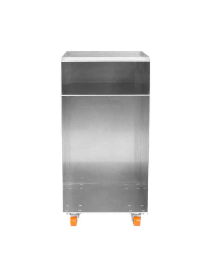 Rivet Cart is a raw aluminum storage piece with hand-hammered rivets on bright orange wheels - an elegant and versatile addition to FRAMA’s Rivet Series. The easy-to-transport mobile cart features a tray-top with two open shelves below, combining traditional furniture craftsmanship and modern industrial production. Thanks to its sturdy construction, this timeless piece can be used as a table, storage unit, pedestal for display, or a combination of all three.