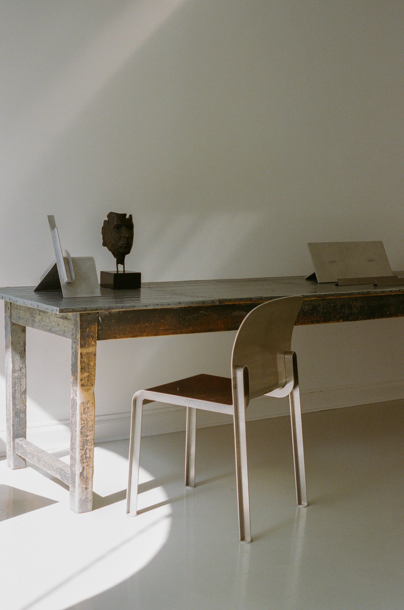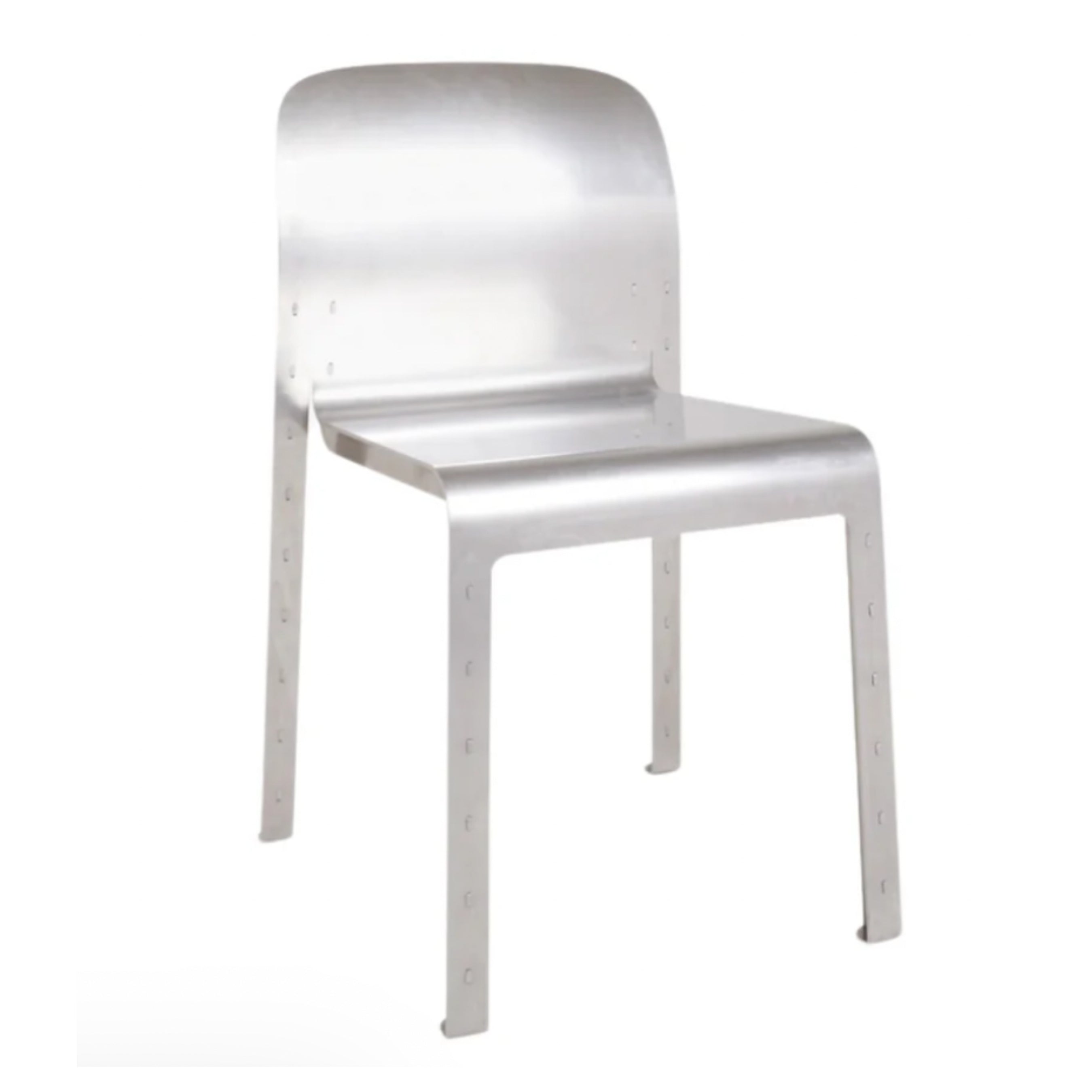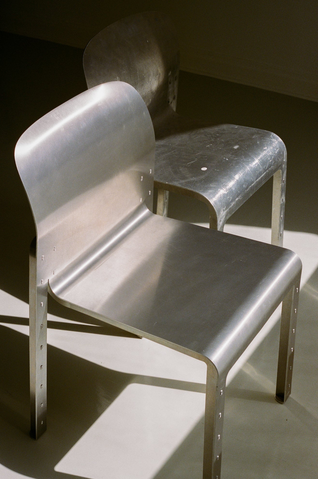 Manufactured through a unique cold-forming process developed specifically for this chair, each piece is assembled entirely by hand using a hammer and a custom riveting technique. This method, which joins laser-cut raw aluminum sheets at perpendicular angles without welding or heat, gives the FRAMA Rivet Chair its characteristic strength and sculptural silhouette.