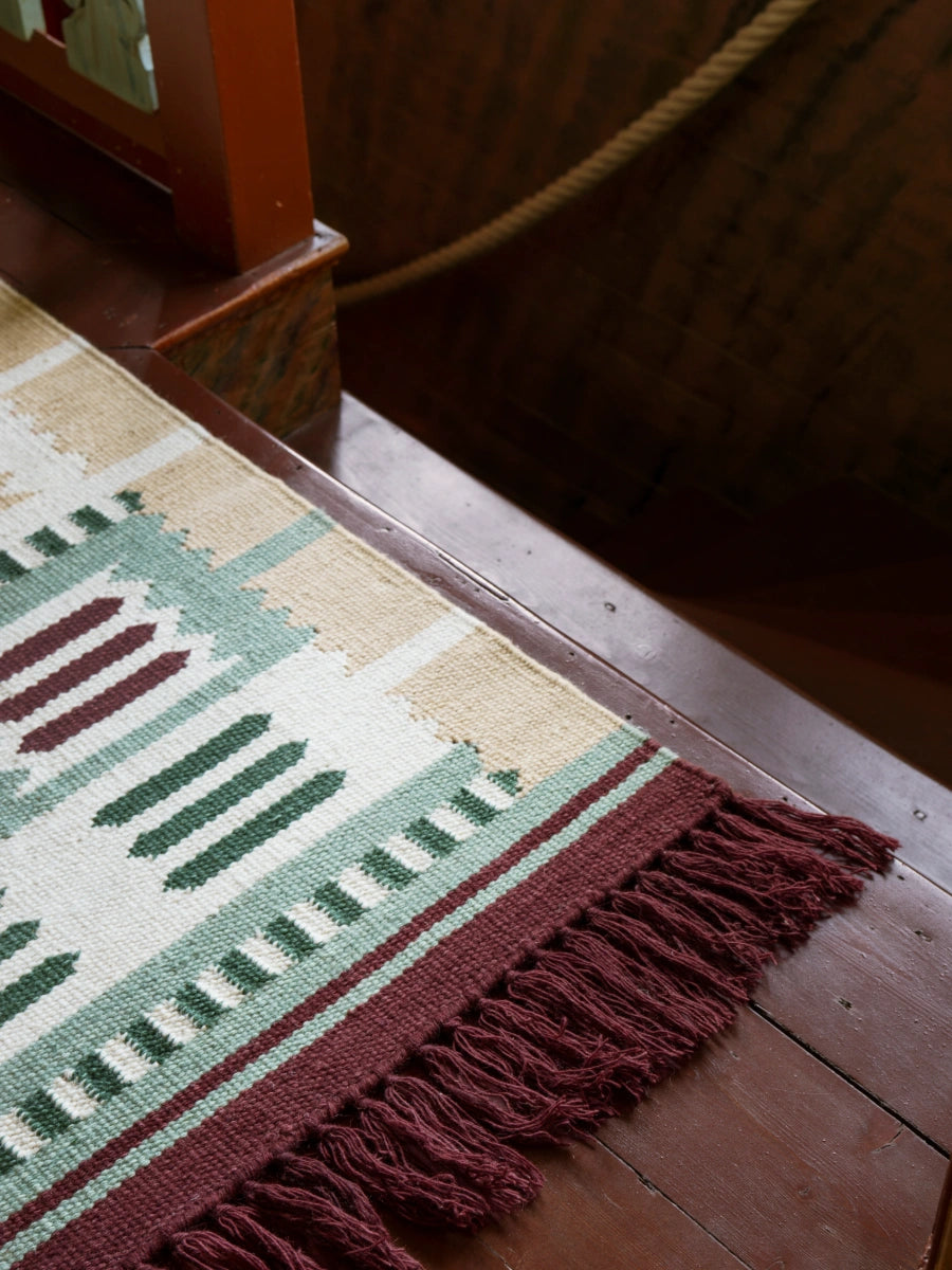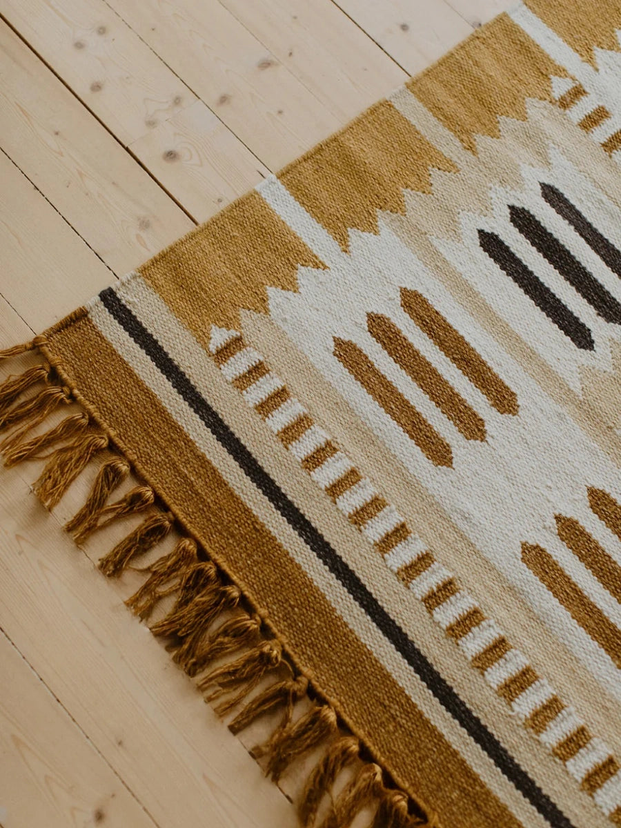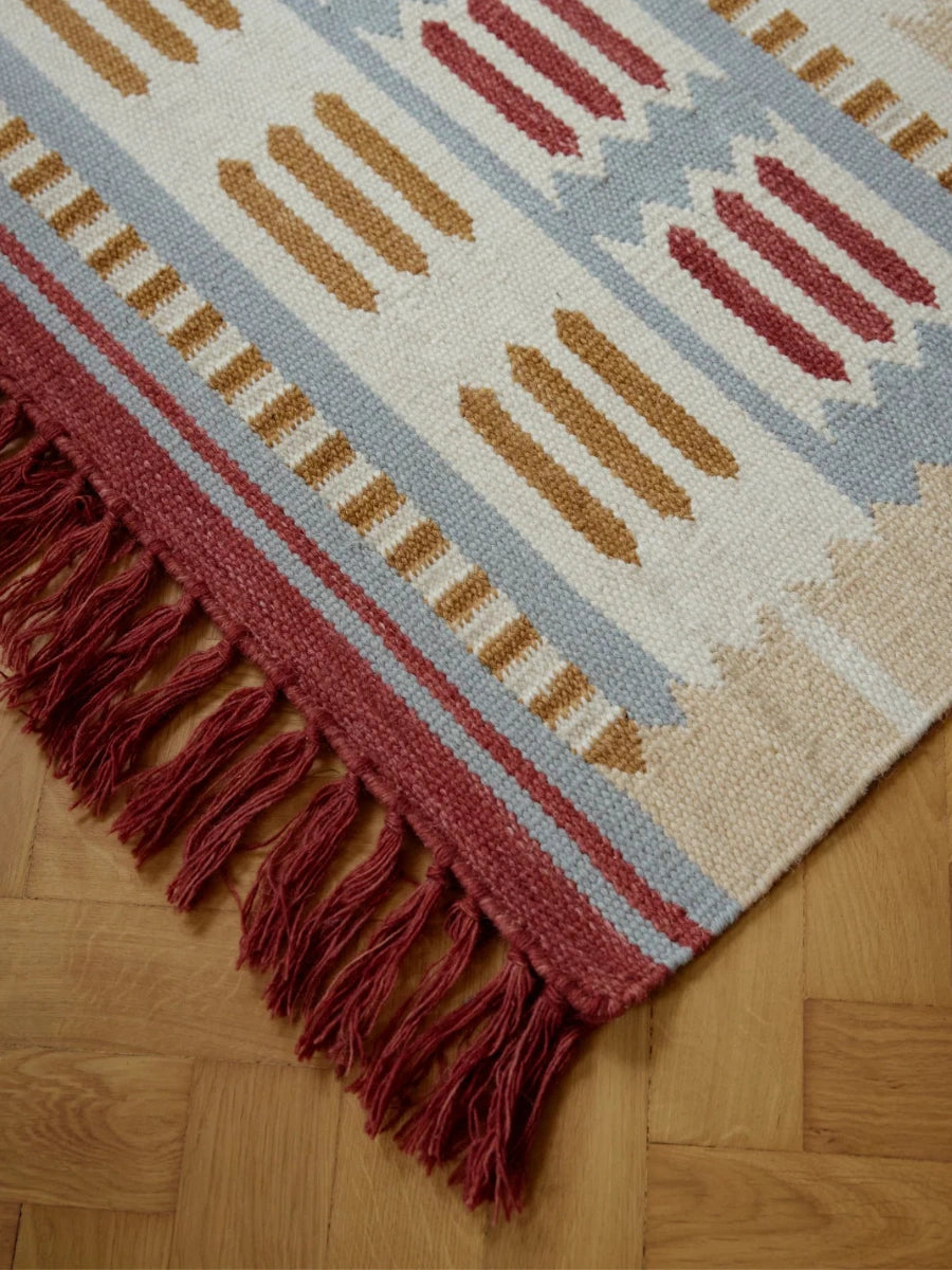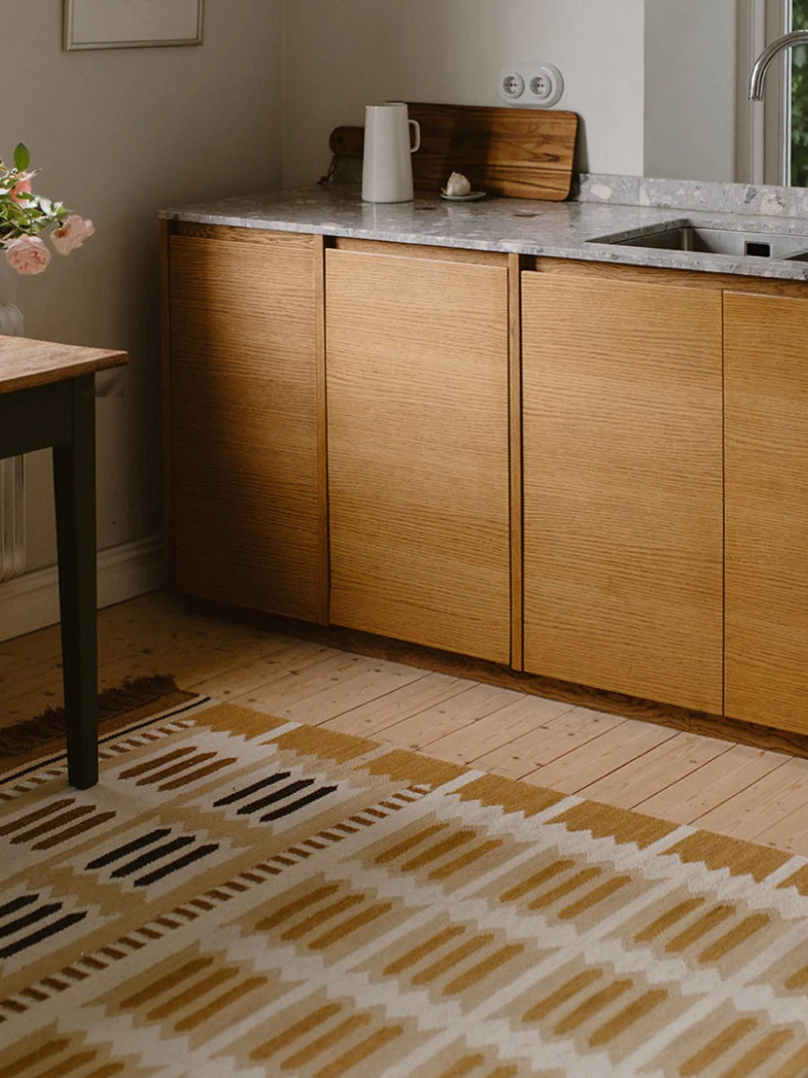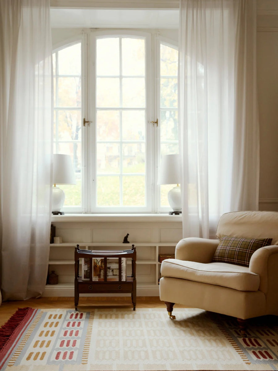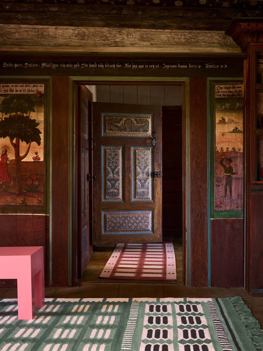 The Röllakan Hilma Wool Rug reflects Scandinavian design through a precise geometric composition inspired by Swedish folk traditions, where pattern becomes a structured visual language. Handwoven with a weft of 100% wool and a warp of 100% cotton, it carries forward Scandinavian design by balancing heritage references with a refined, modern expression.