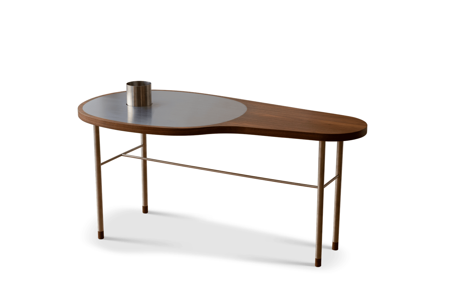 The Ross Coffee Table by House of Finn Juhl features a delicately balanced stainless steel frame that supports an organically shaped walnut top. A sleek steel inlay adds dimension and contrast, and is available with or without a built-in stainless steel vase. The juxtaposition of materials and form speaks to Finn Juhl’s unconventional approach, which set his work apart in the mid-century Danish design movement.