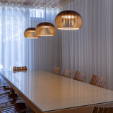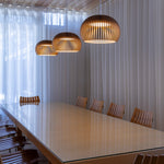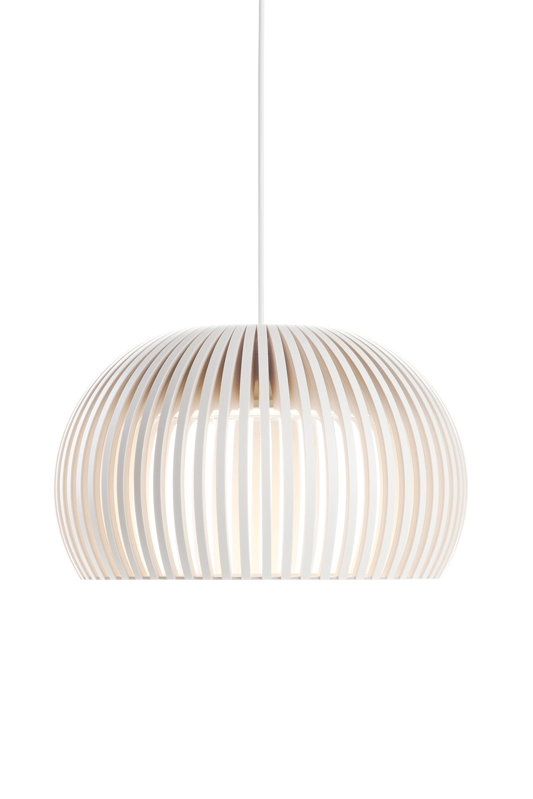 The Atto 5000 lamp by Secto is a compact pendant with a built-in LED bulb and is suitable for smaller interiors, such as entryways, hallways, home offices, and children's bedrooms. The Atto pendant can be combined with the larger Victo 4250 or paired with its 4200 and 4203 Puncto cousins to dramatic effect. All Secto lighting produces a warm glow across any room because light reflects off the wood to cast soothing spectrums, while their characteristic slatted lampshades add unique, textured qualities.