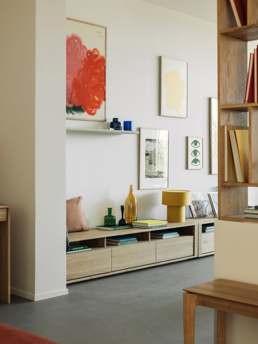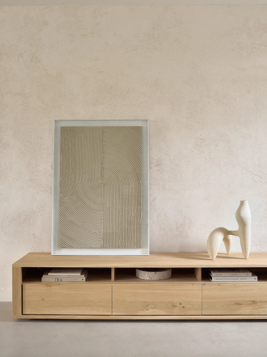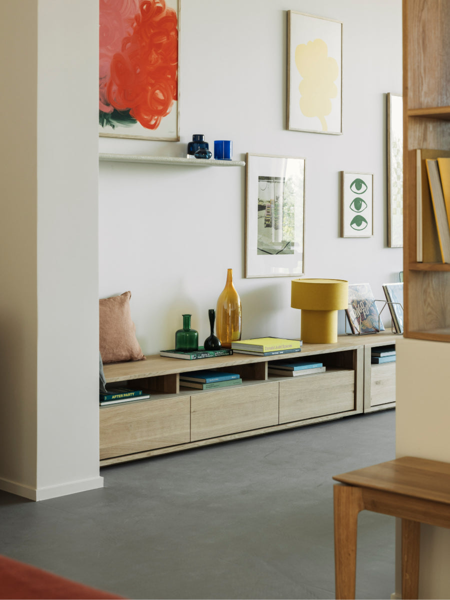 The Shadow TV Cupboard by Ethnicraft brings architectural presence and practical storage to living rooms shaped by Scandinavian design principles that value clean lines and purposeful form. Its generous surface and concealed compartments create a calm, balanced focal point under a flat-screen or art display.