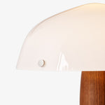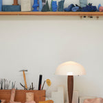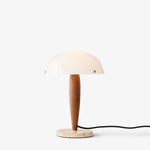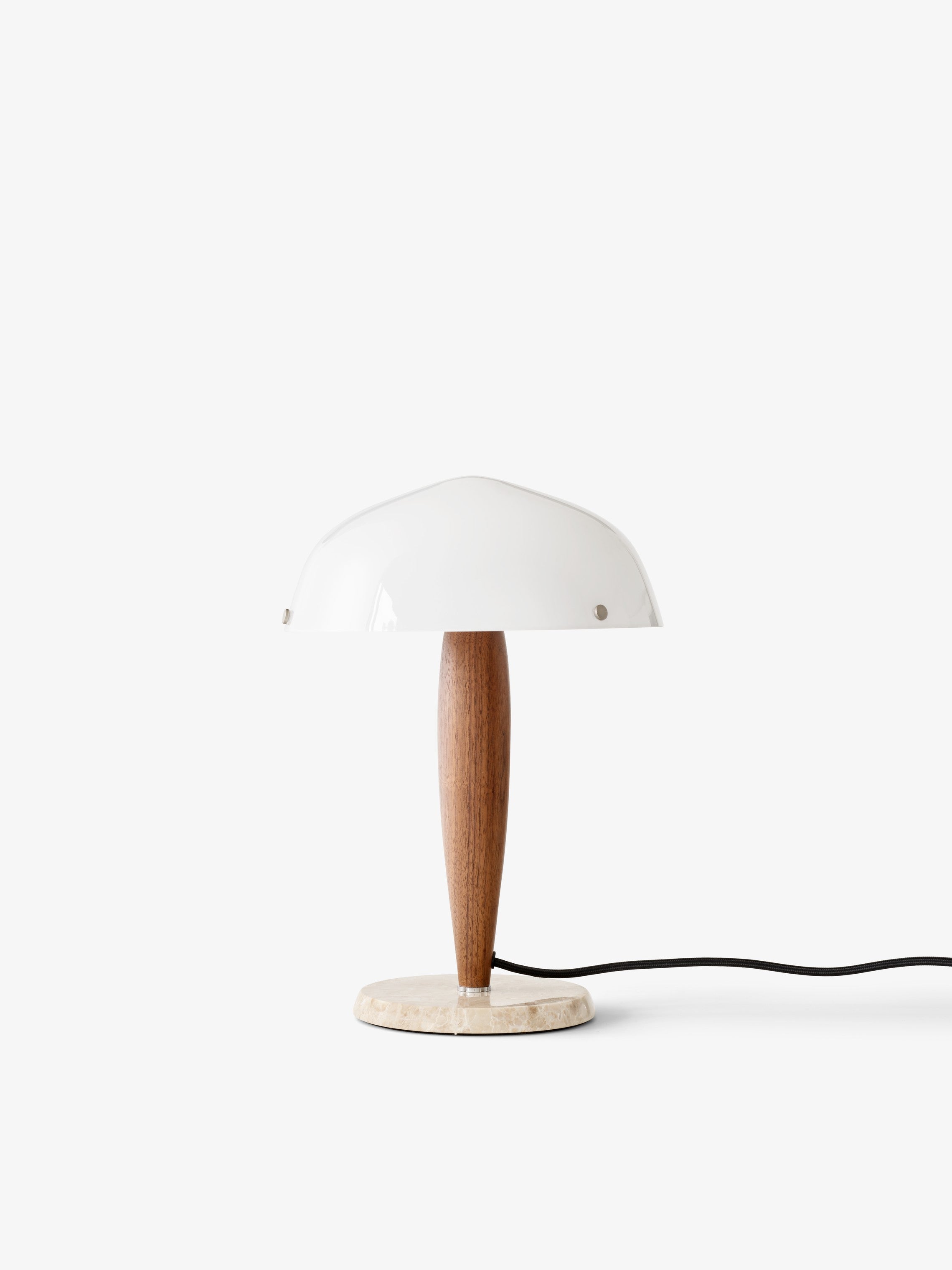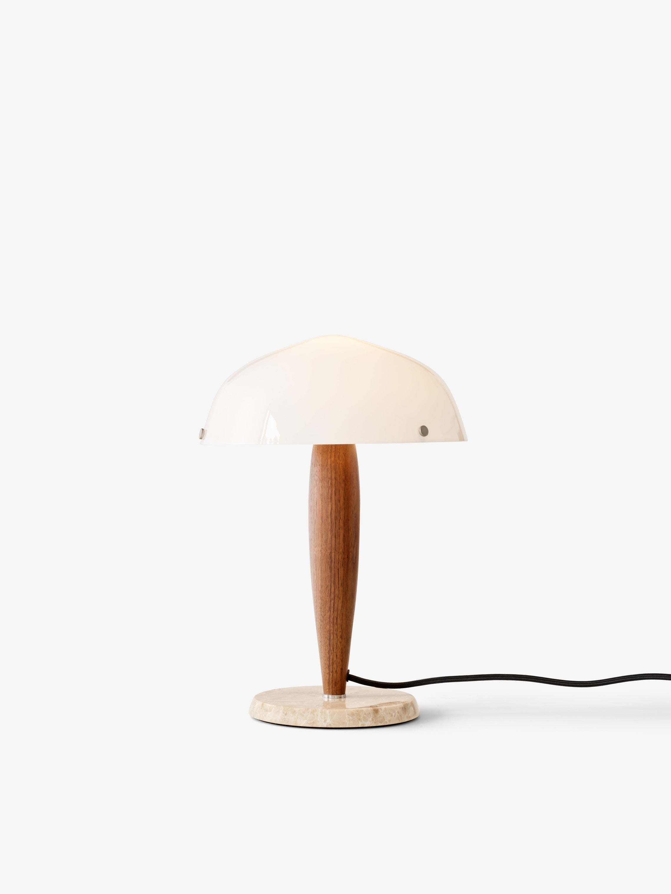 Opal glass shade, walnut stem, beige marble, chrome details, Textile cord