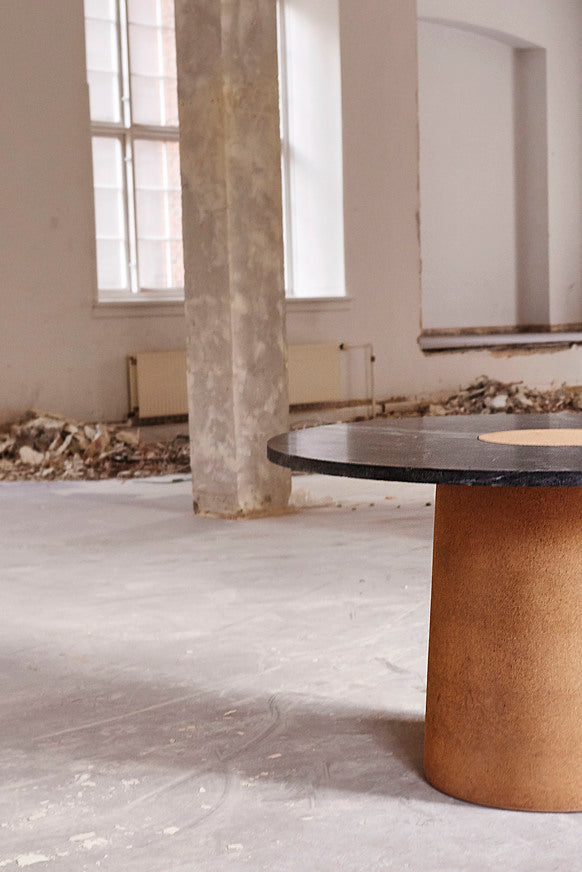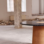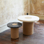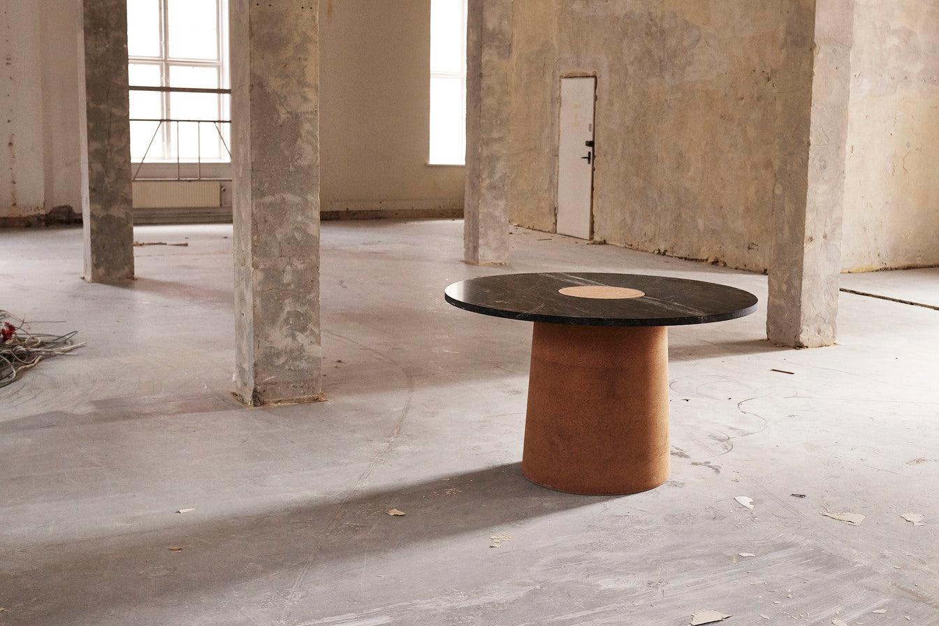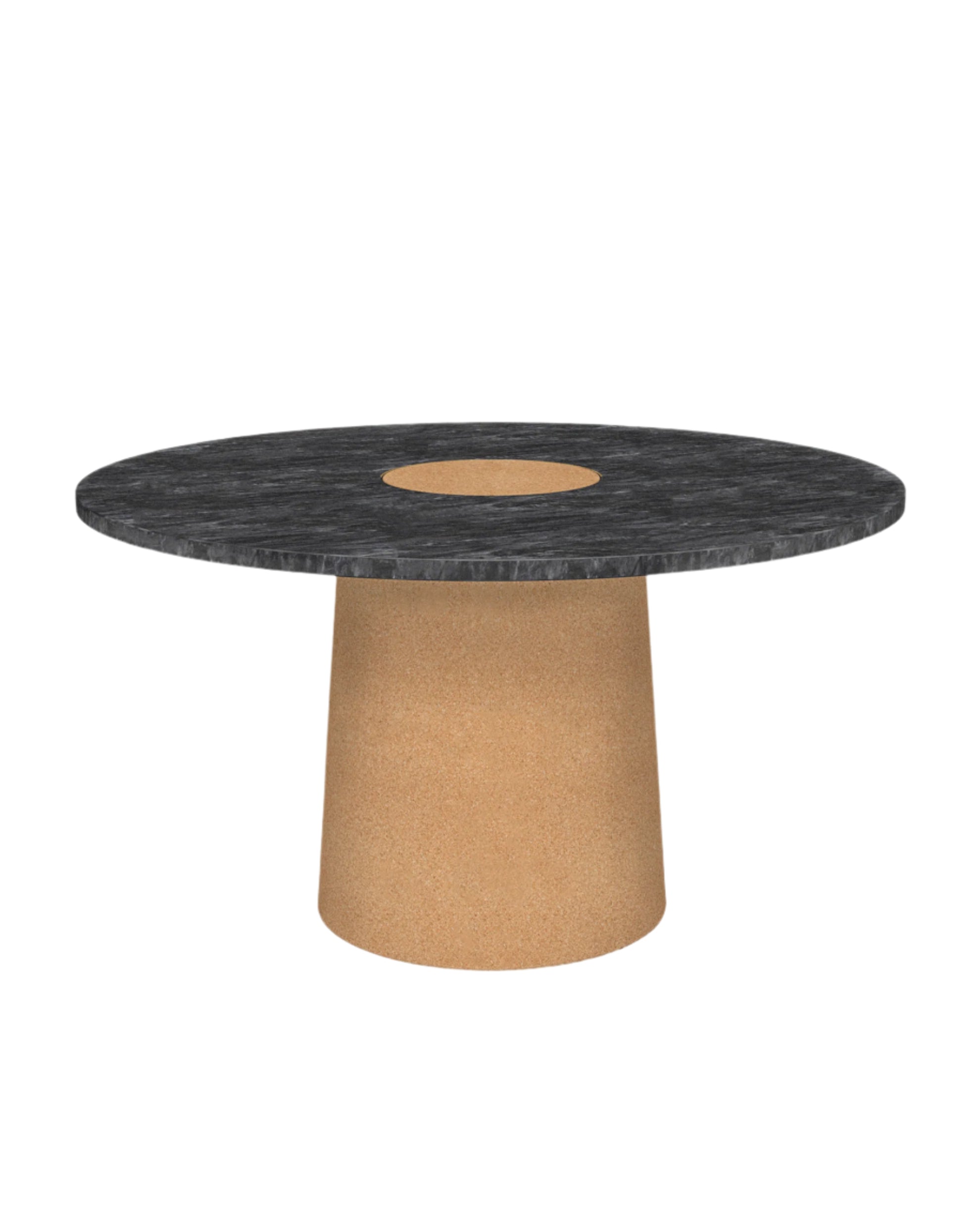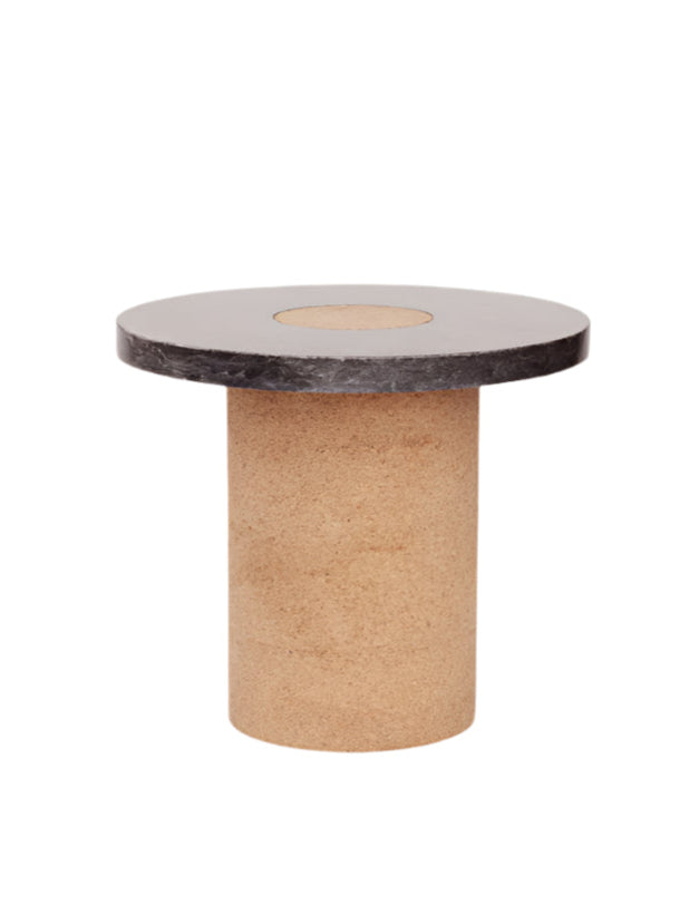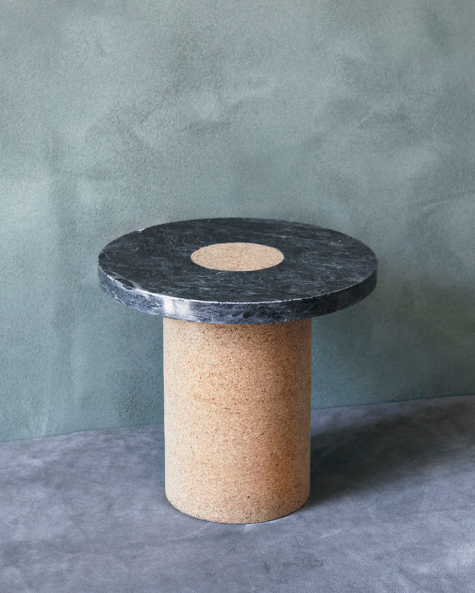 Suitable as a coffee table or side table, the Sintra Table features a smooth marble top with a contrasting rounded cork base. The polished surface of the marble showcases the intricate veins and natural beauty of the stone, while the cork base presents unique lightweight and durable properties—a sculptural furniture piece with expressive attributes and functionality.