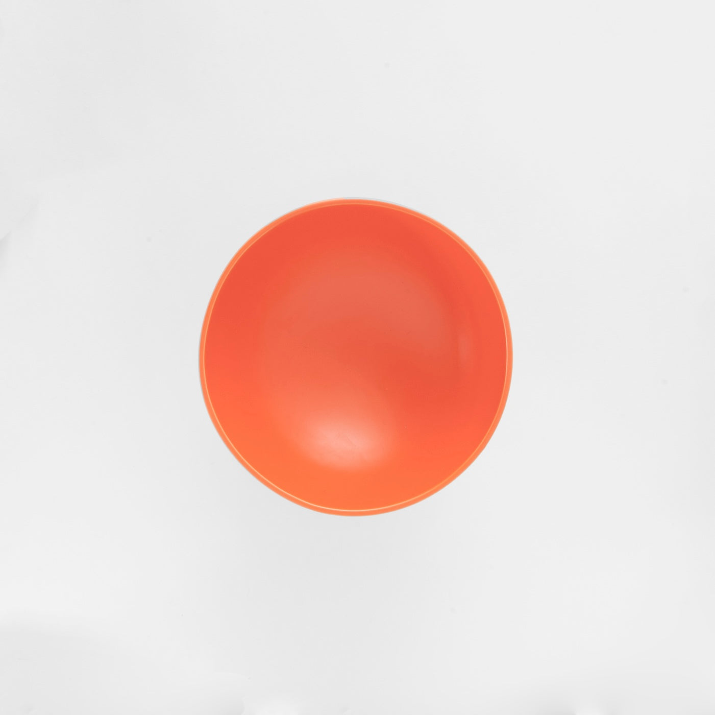 The bowl features a distinctive, clear-cut design with geometric shapes and a vibrant color palette. It is handmade in Portugal and comes in three sizes and eight carefully designed glaze colors: orange, green, pink, purple, white, and modified versions of the primary colors-yellow, red, and blue.