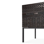 • Product Material: Solid teak doors with a varnish finish, oak veneer body and black metal legs