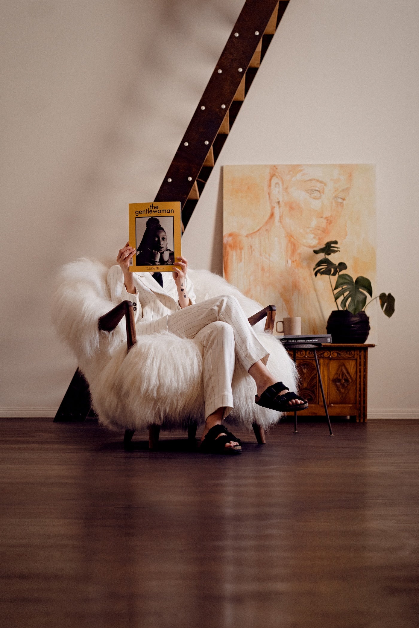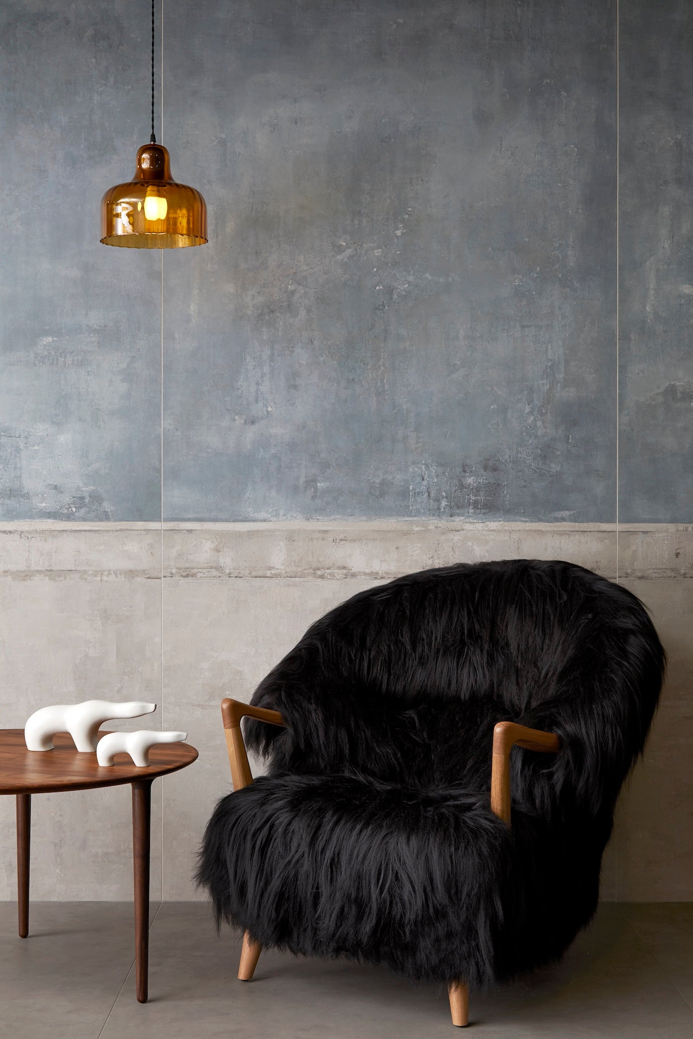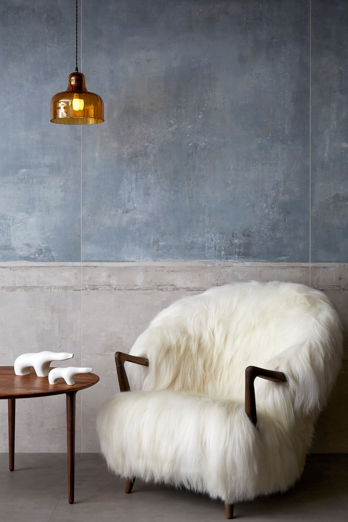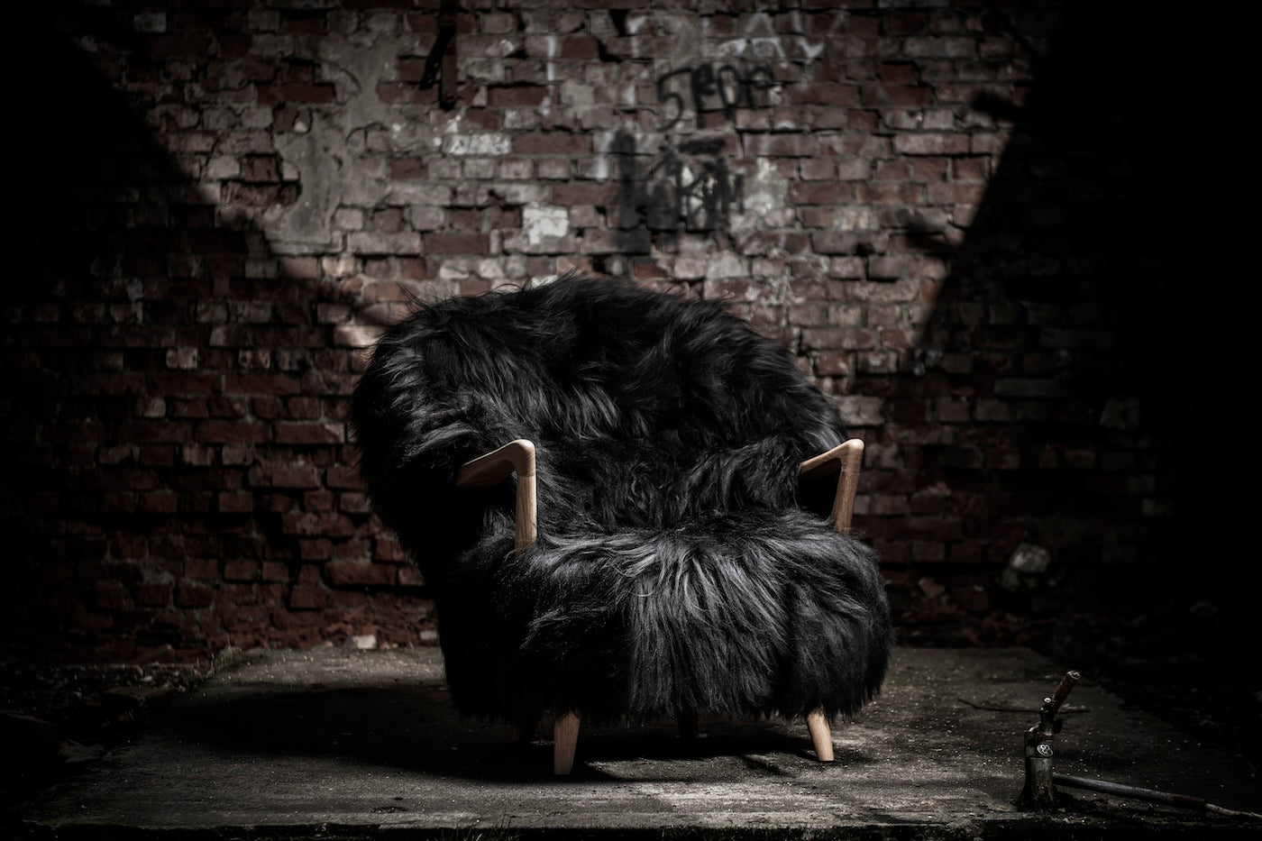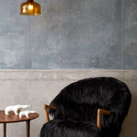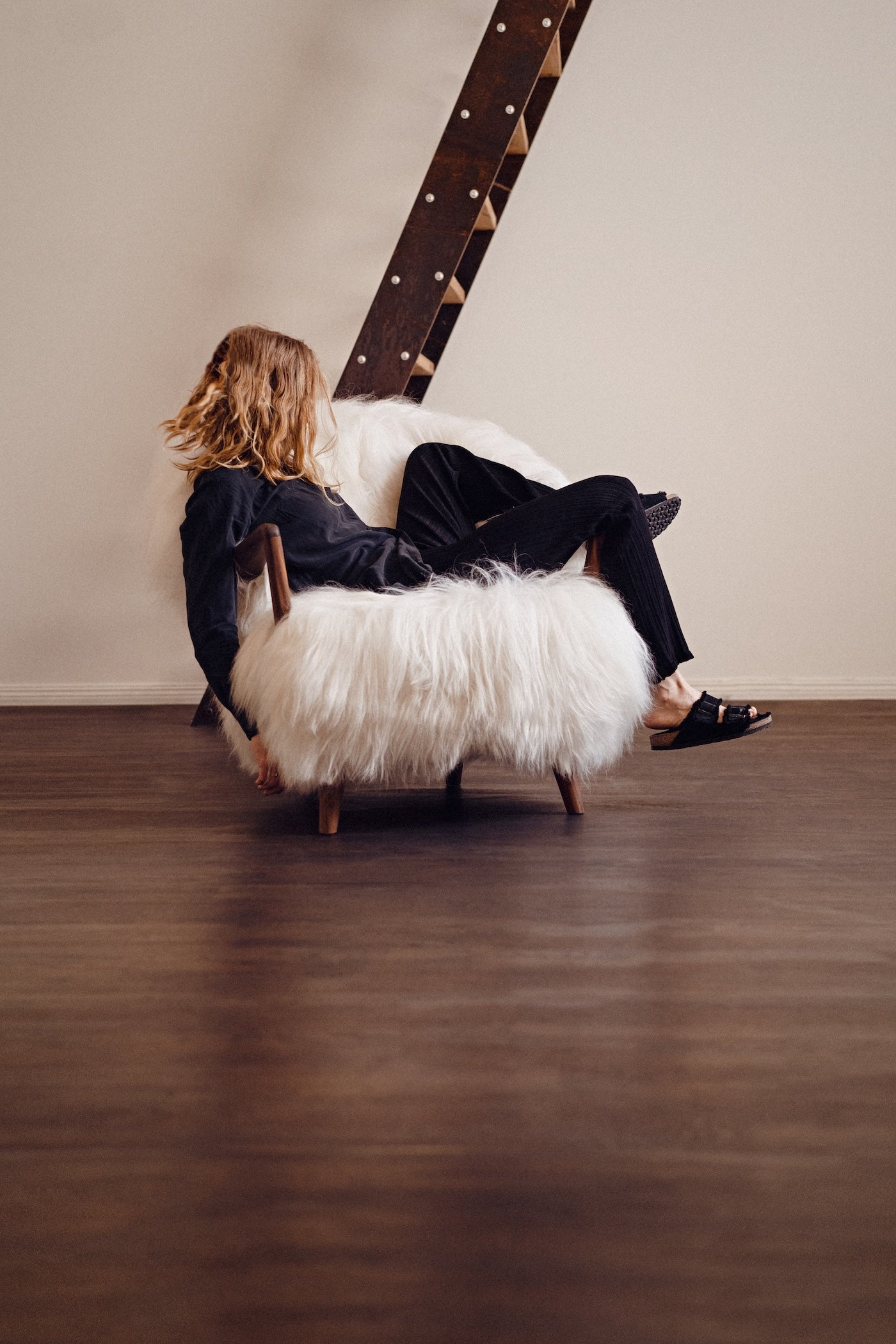 The Eikund Fluffy Chair works beautifully as a standalone statement piece, as a pair, or arranged in a circle of four for the ultimate cozy lounge setting. Each Eikund Fluffy Chair comes in premium cream or black shearling with walnut or oak arms and legs and includes a brush for maintaining the natural shearling.