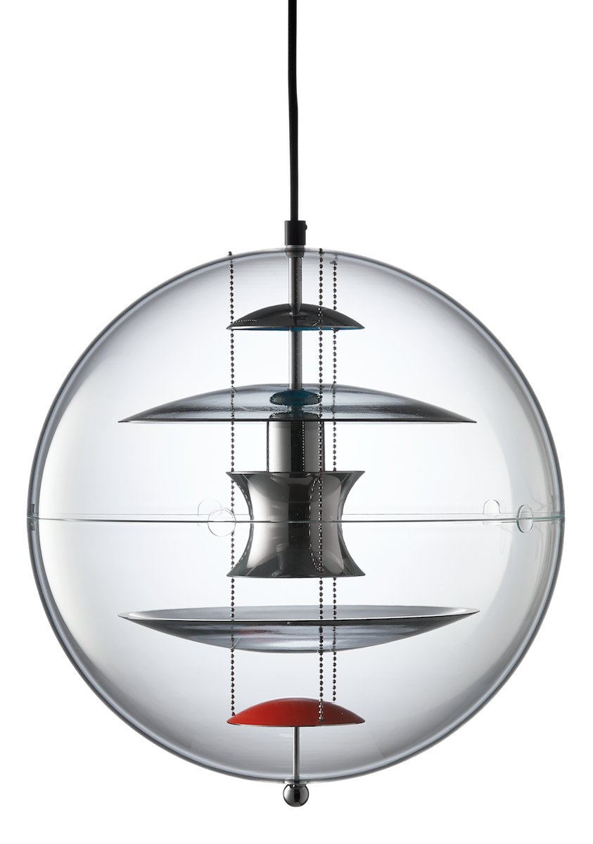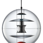 This decorative VP Globe Colored Glass pendant features a crystal clear transparent acrylic outer sphere with five internal reflectors suspended by three steel chains. Splashes of red and blue add the finishing touches to the futuristic sculptural design and highlights the unmistakable Panton design DNA.